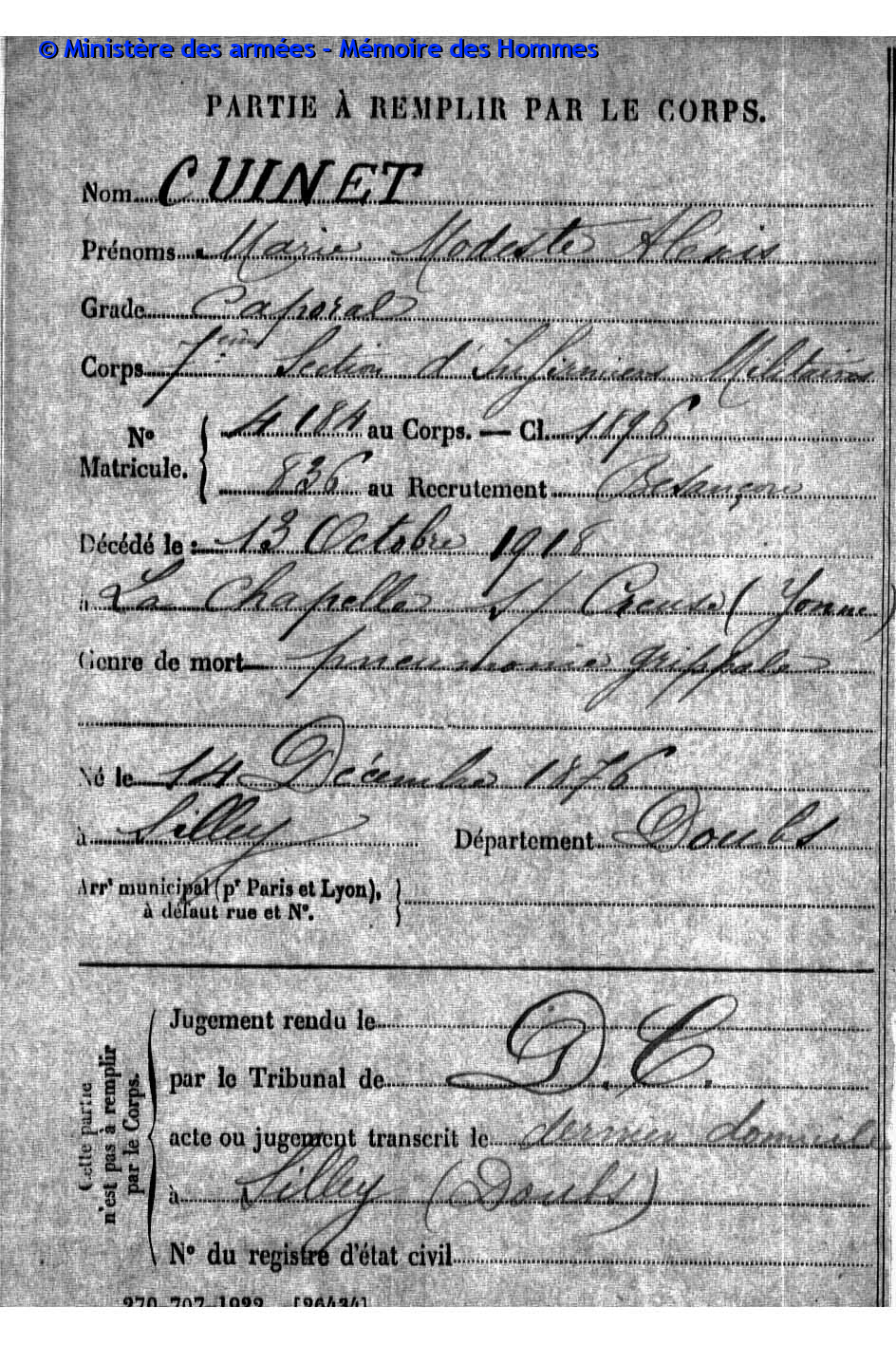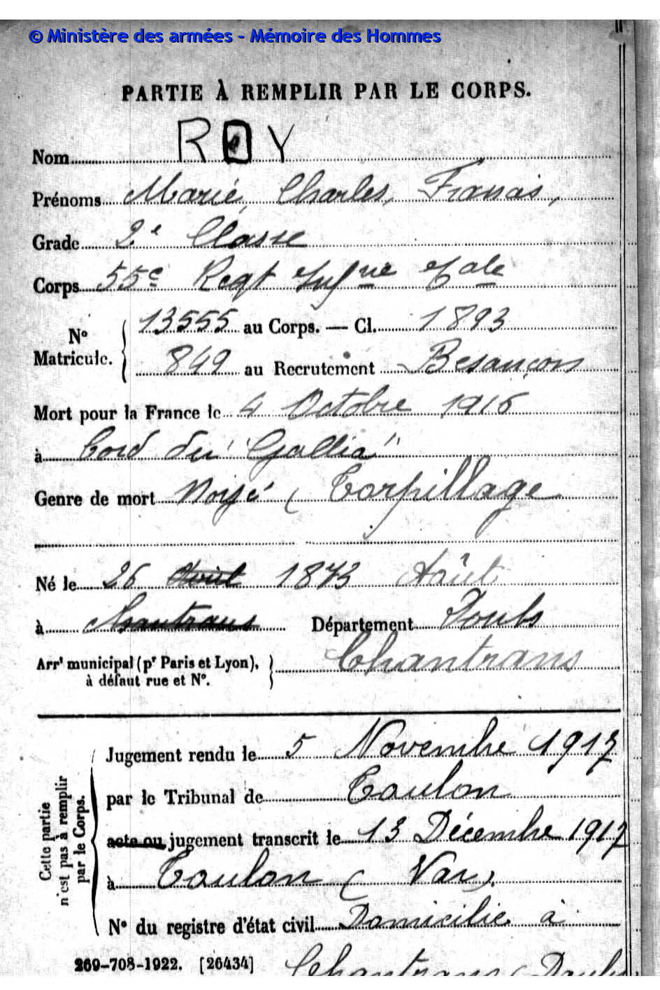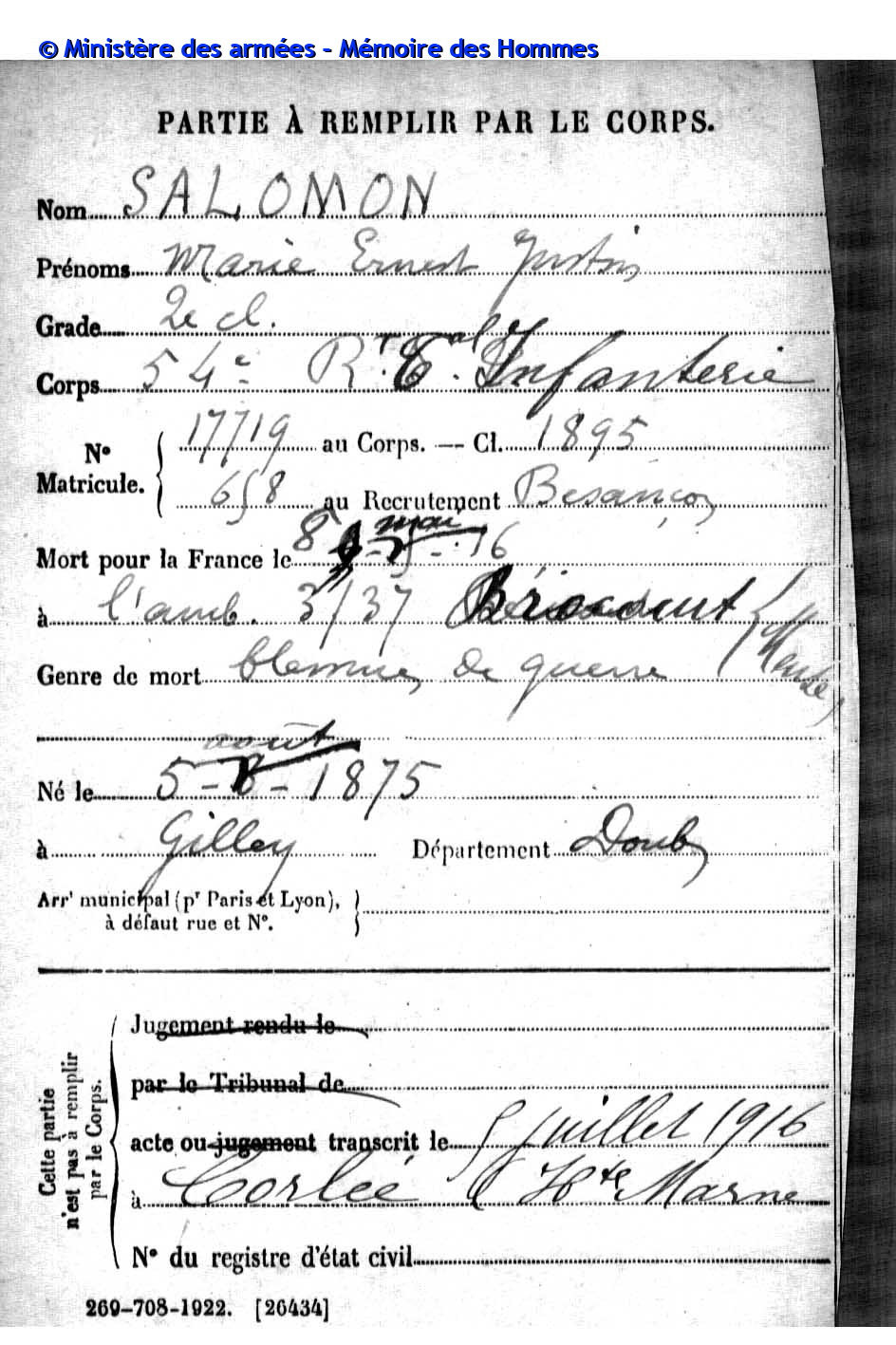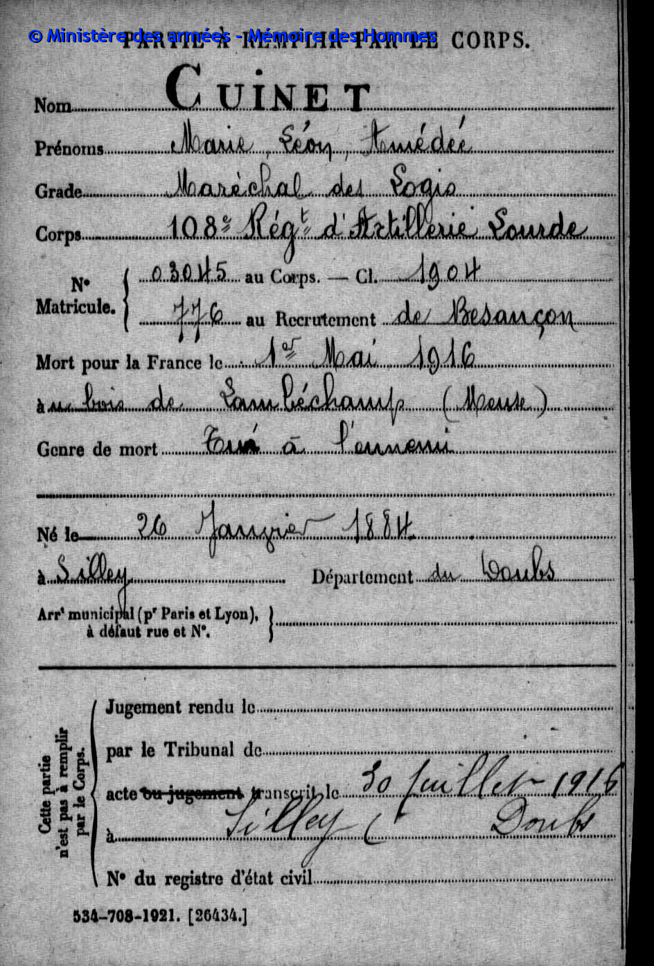 Die 5,22 Km2 kleine Gemeinde mit 144 Einwohner im Departement Doubs (F) verzeichnet auf seinen Kriegerdenkmal 10 Namen von gefallenen Soldaten, davon sind alle 10 mit Fabian Coulot verwandt.