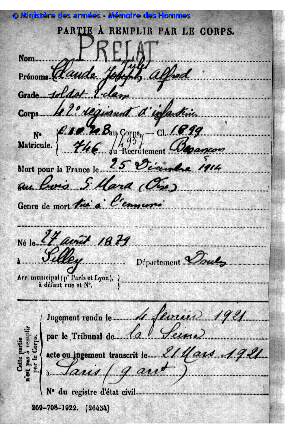 2ème classe PRELAT Claude Joseph Alfred 27.08.1879 - 25.12.1914 42ème Régiment d'Infanterie Gefallen in Tracy-le-Val - Oise (F) |