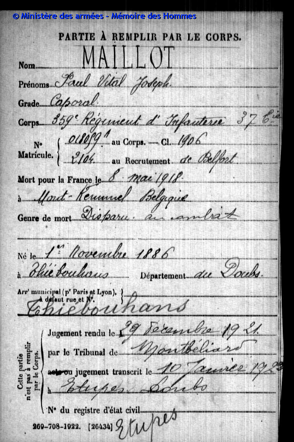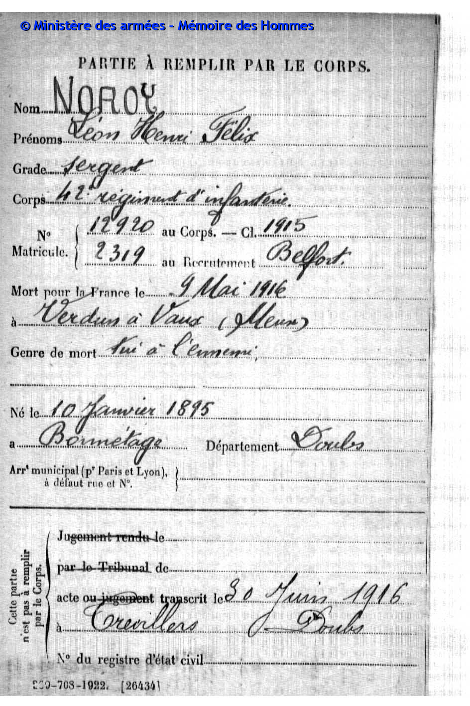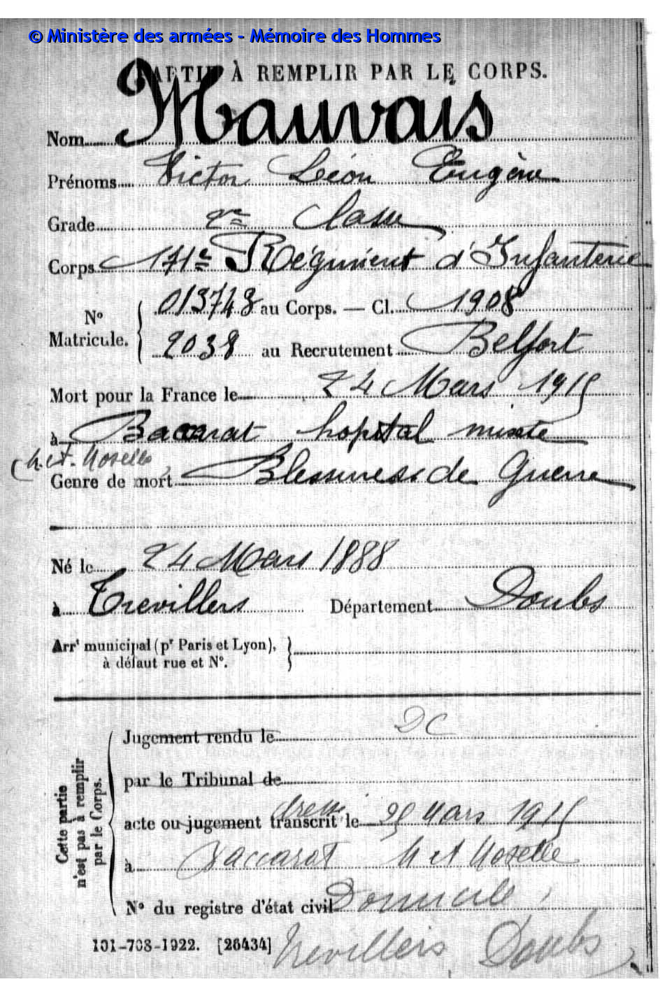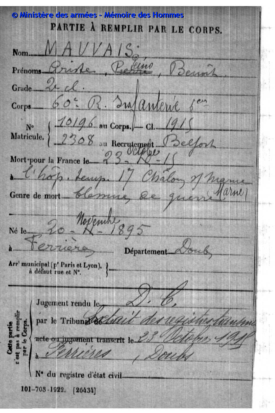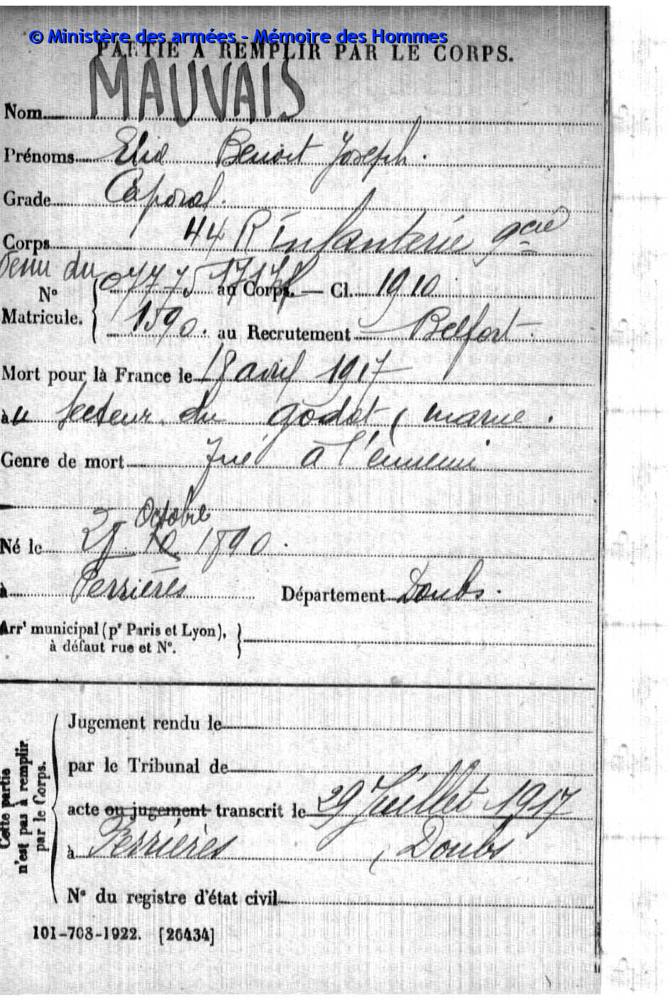 | Caporal MAUVAIS Elie Benoit Joseph 28.10.1890 - 18.04.1917 44ème Régiment d'Infanterie Gefallen im Secteur du Godat - Marne (F) |