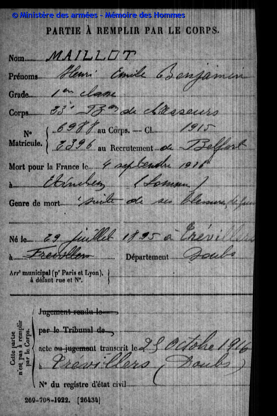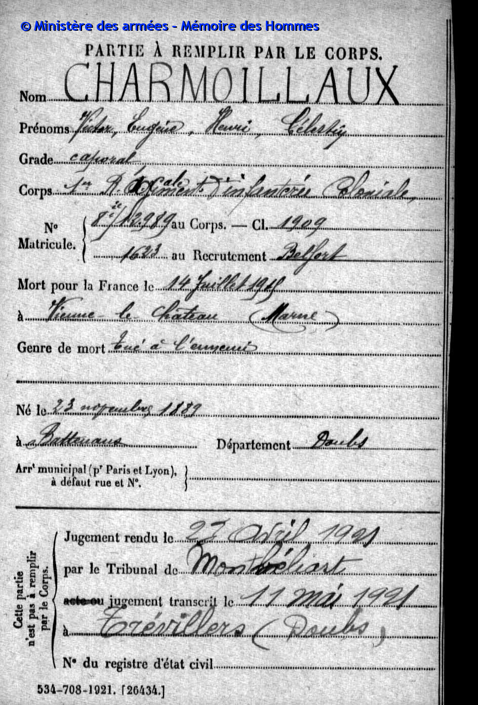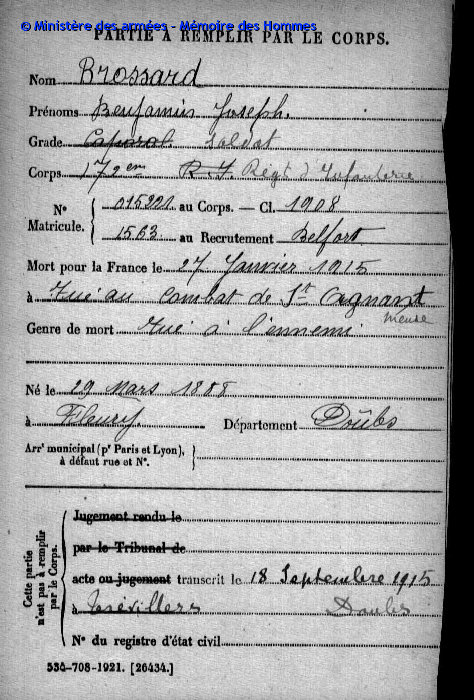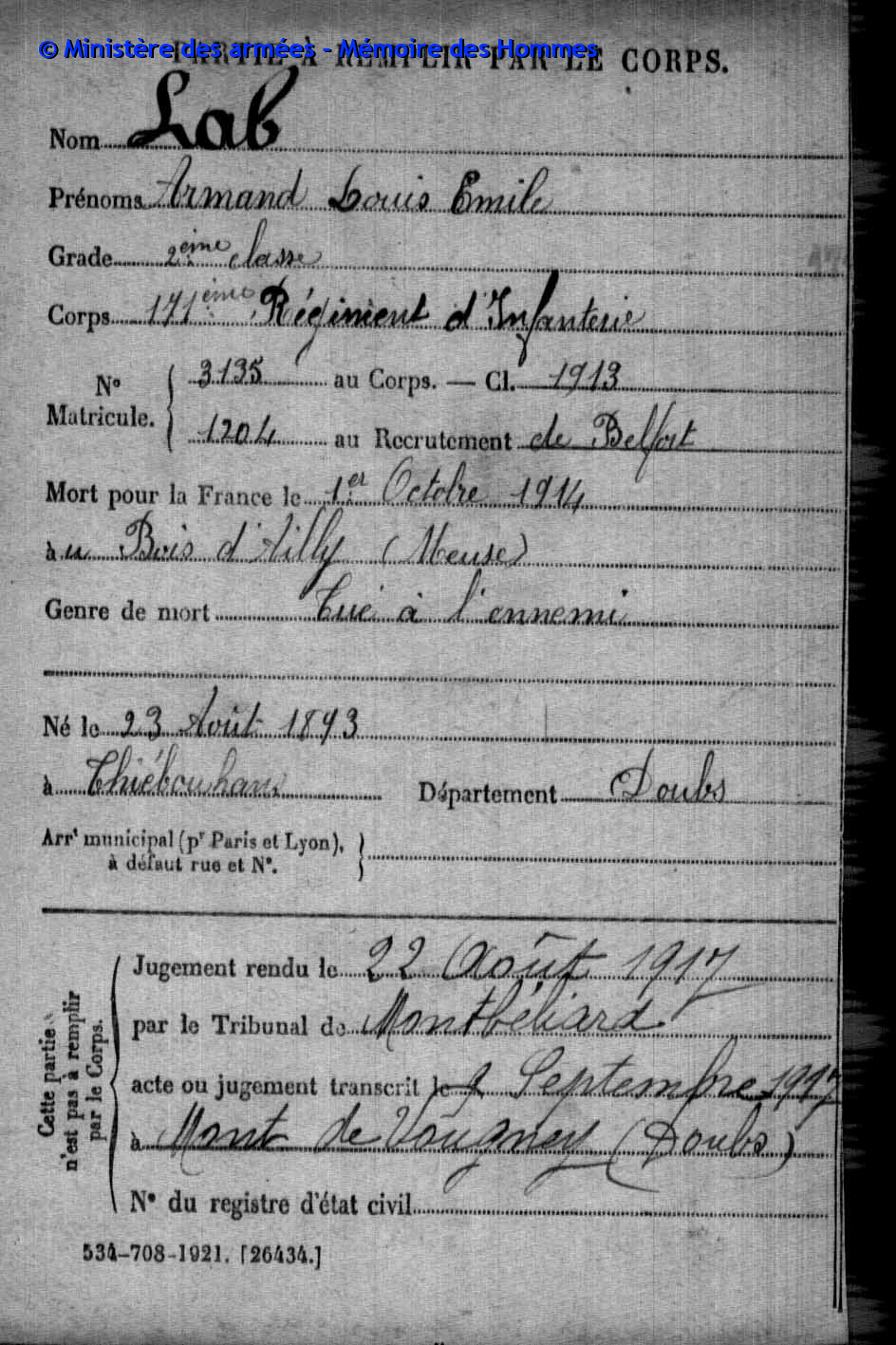 | Caporal MAUVAIS Elie Benoit Joseph 28.10.1890 - 18.04.1917 44ème Régiment d'Infanterie Gefallen im Secteur du Godat - Marne (F) |