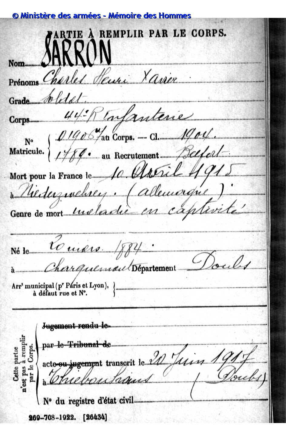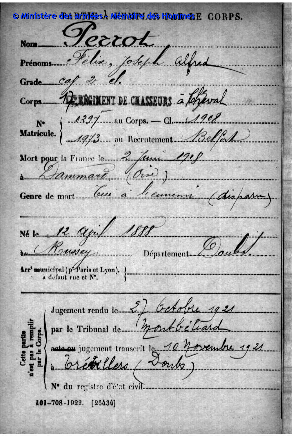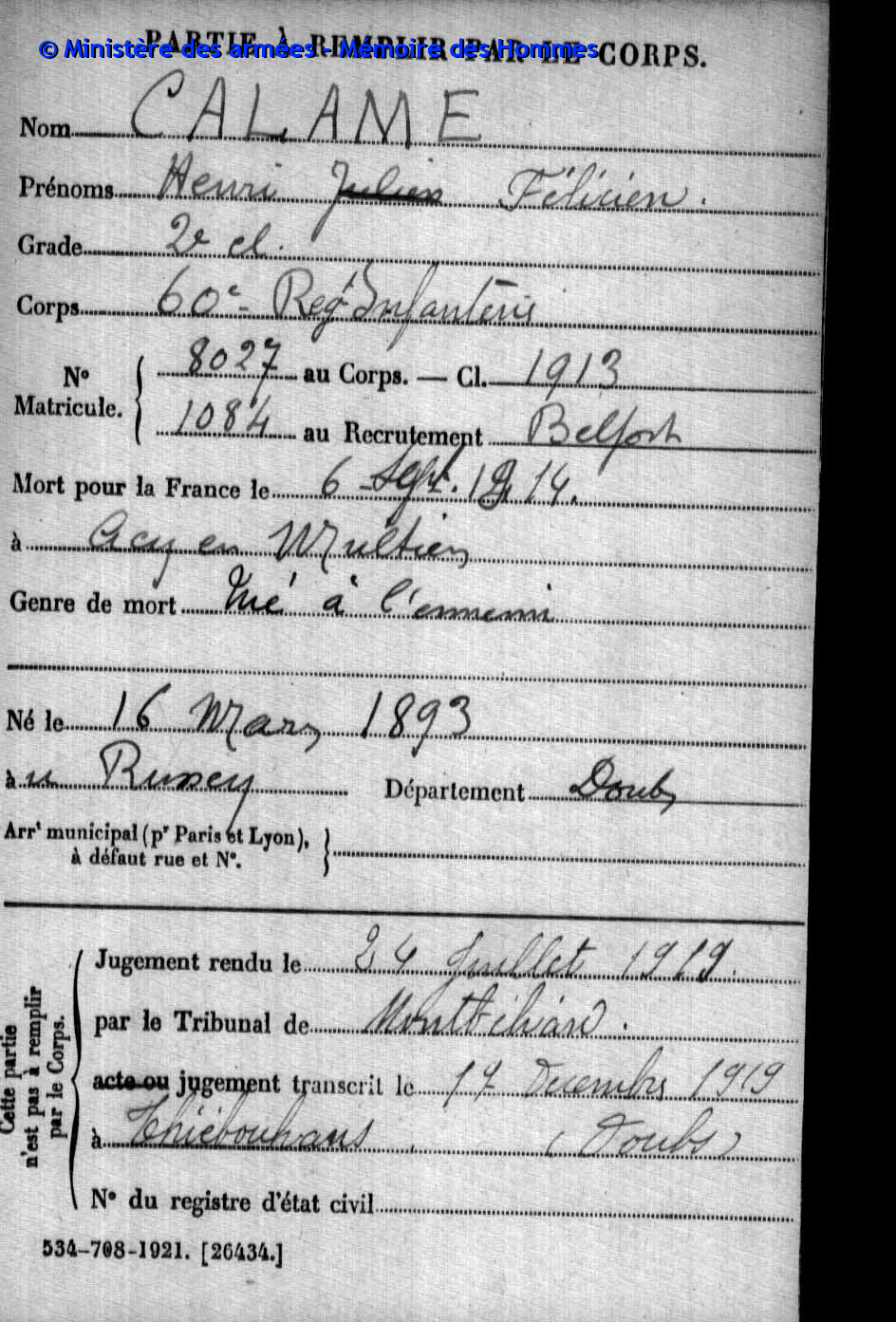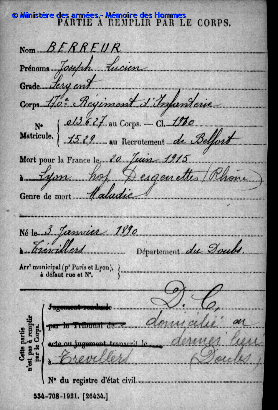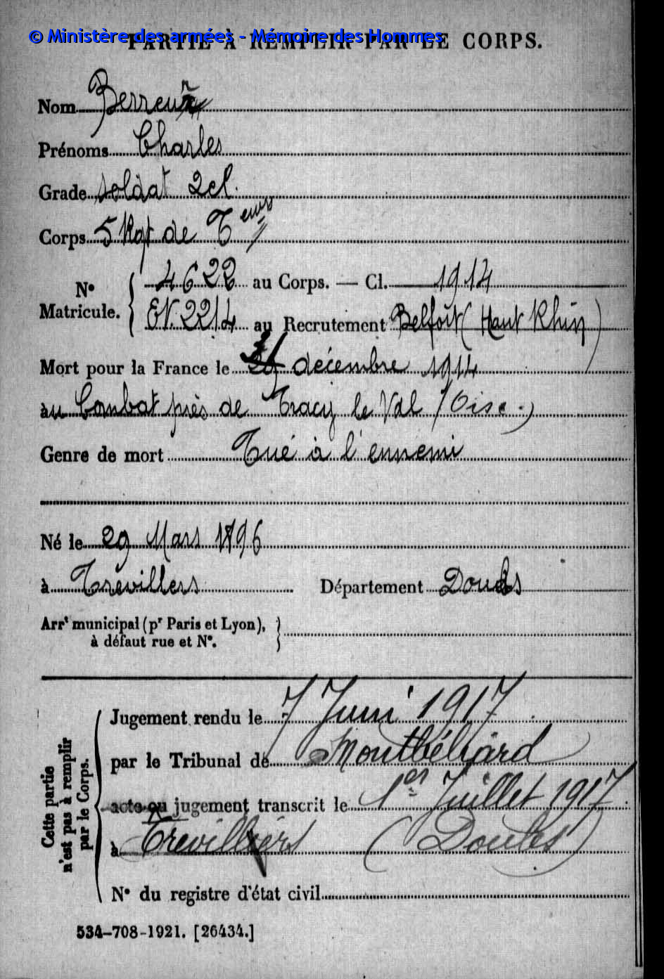 | Caporal MAUVAIS Elie Benoit Joseph 28.10.1890 - 18.04.1917 44ème Régiment d'Infanterie Gefallen im Secteur du Godat - Marne (F) |