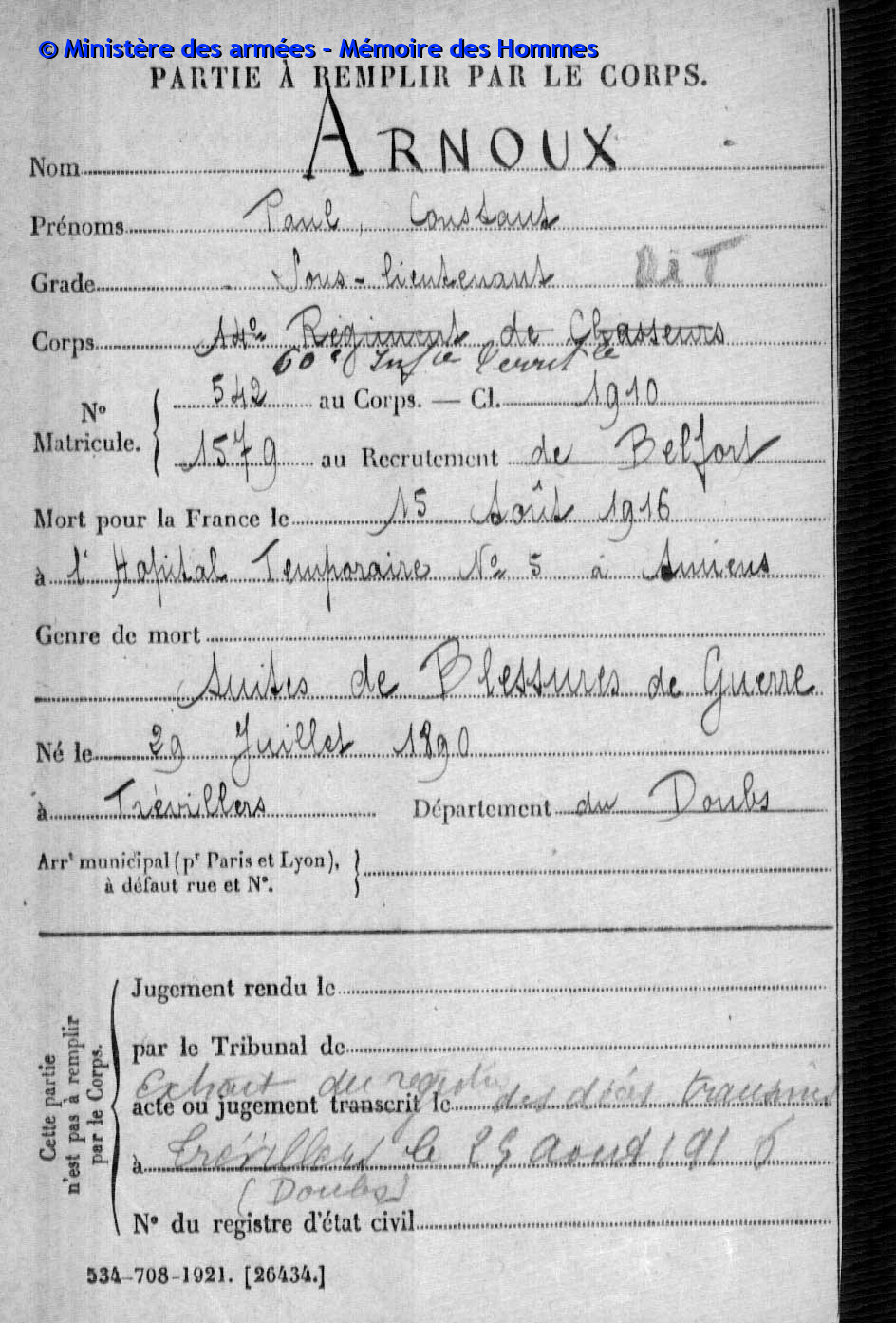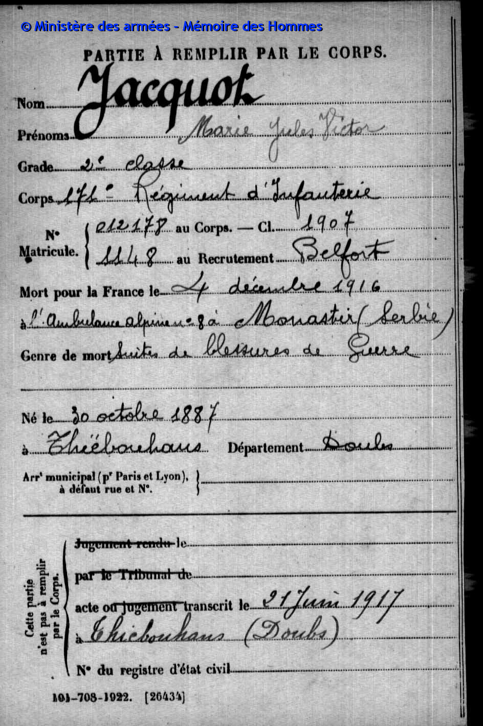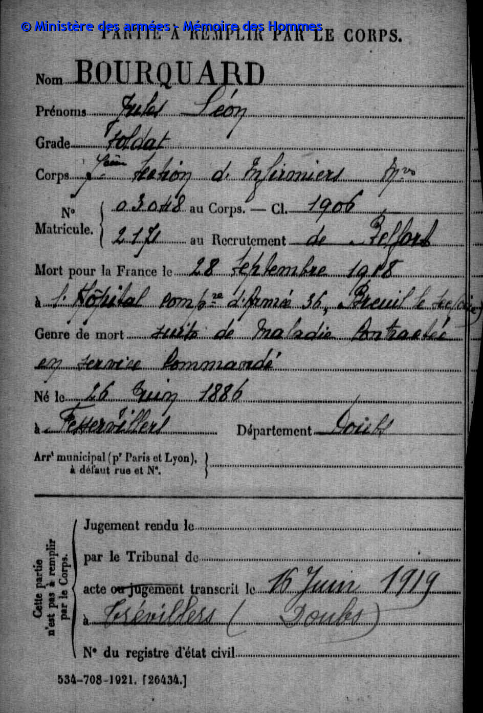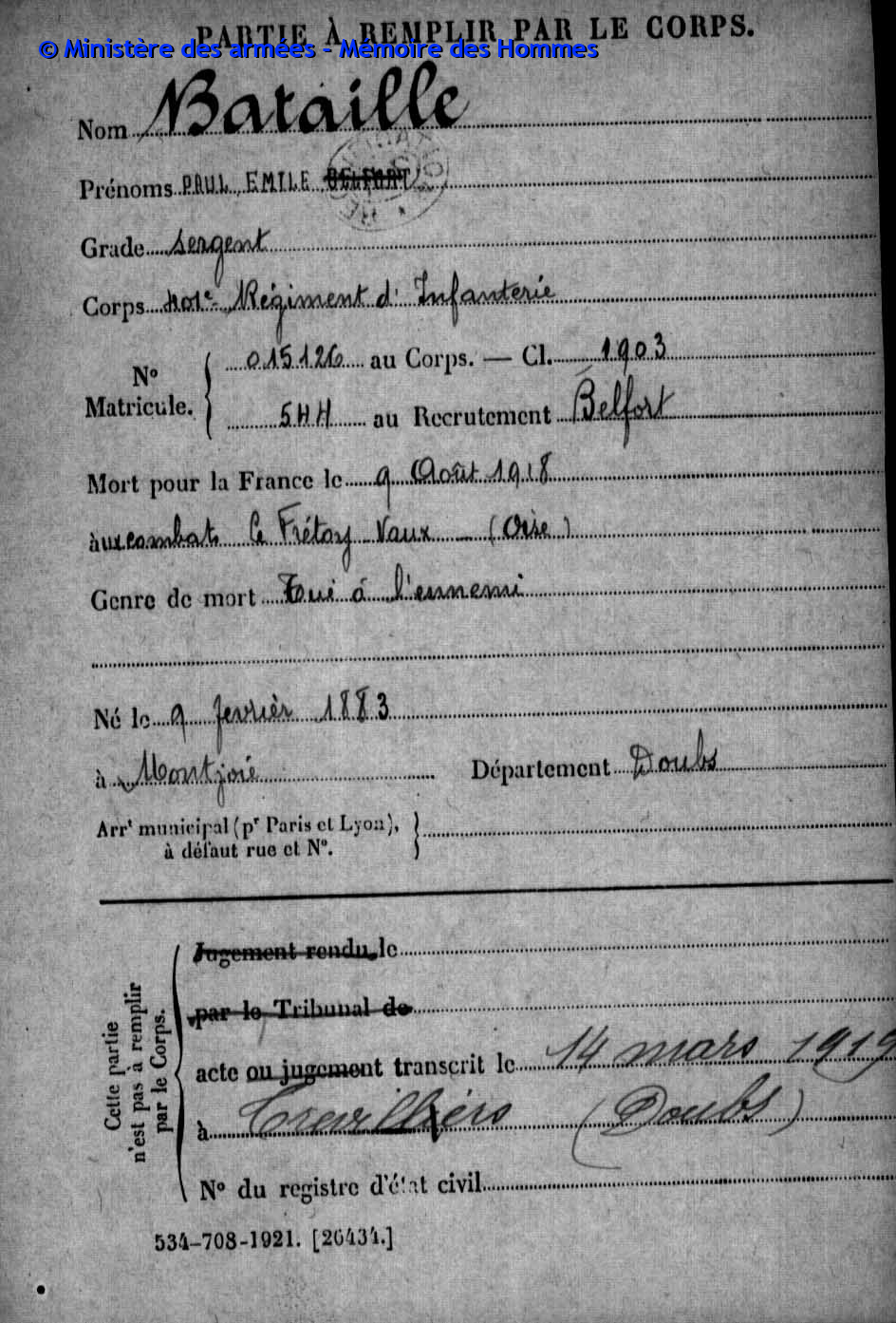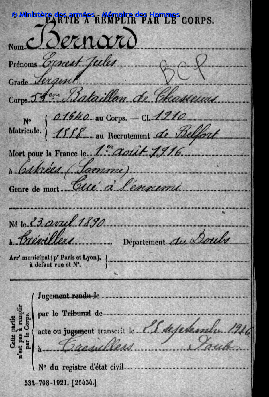 | Caporal MAUVAIS Elie Benoit Joseph 28.10.1890 - 18.04.1917 44ème Régiment d'Infanterie Gefallen im Secteur du Godat - Marne (F) |
