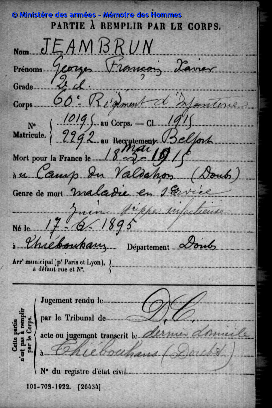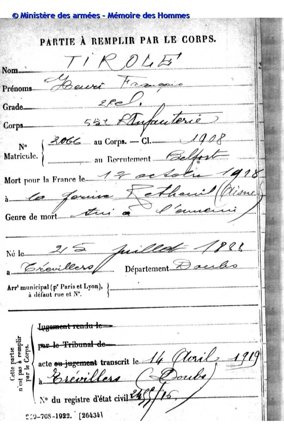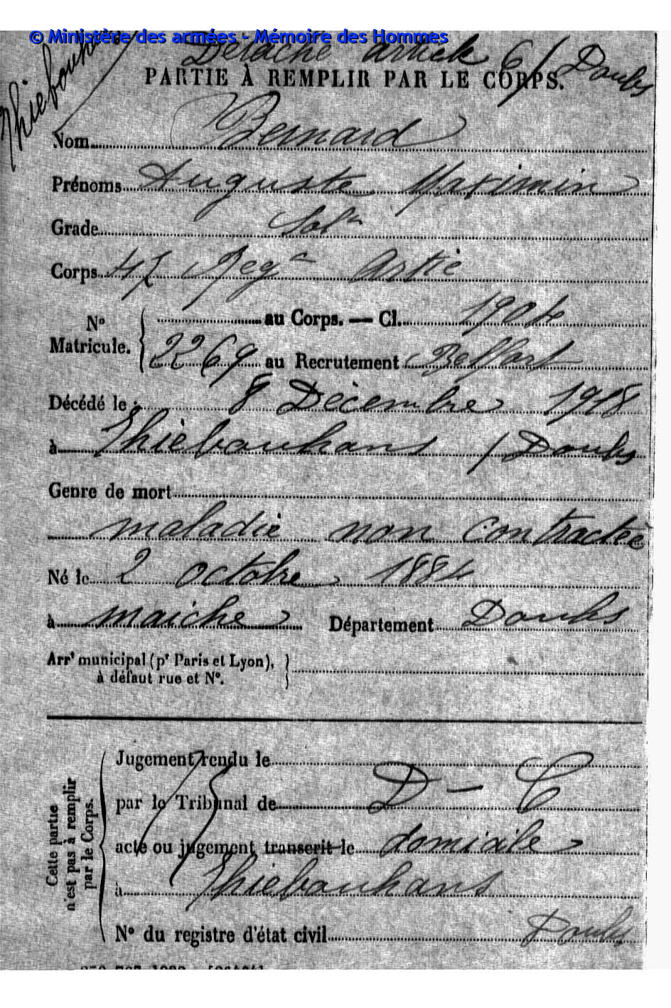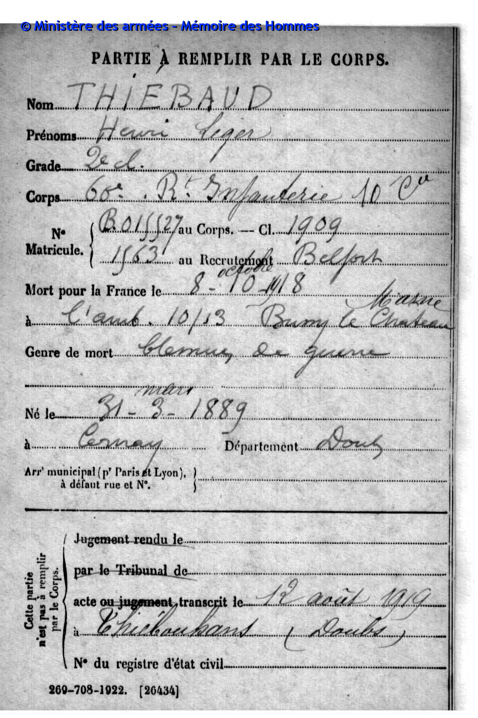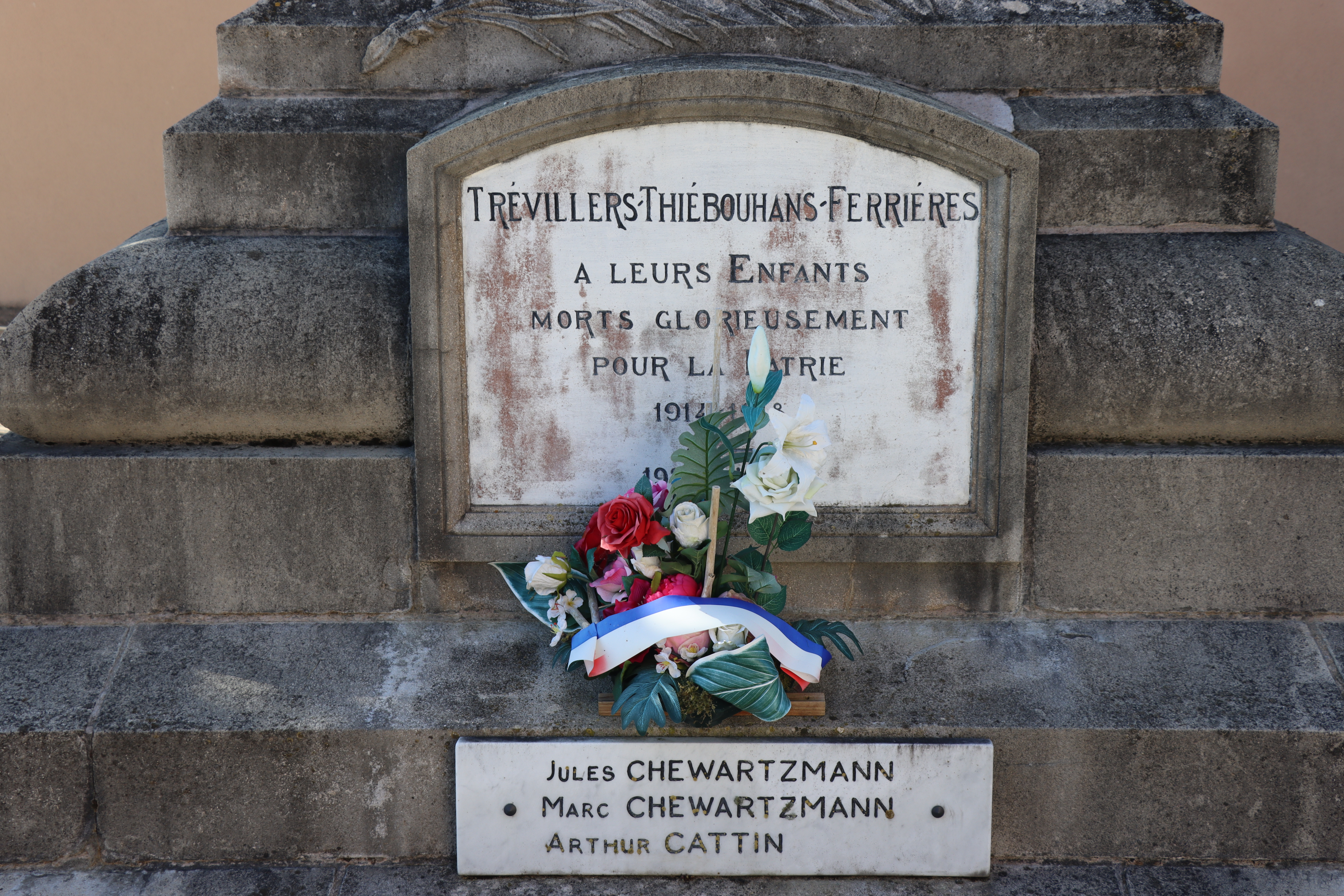 Auf dem Denkmal in Trévillers befinden sich auch die Namen der gefallenen Soldaten aus Thiébouhans. Zu einem späteren Zeitpunkt wurde neben dem Rathaus in Thiébouhans (5,81 km2 mit 257 Einwohner) ein Denkmal für "seine" Opfer errichtet.