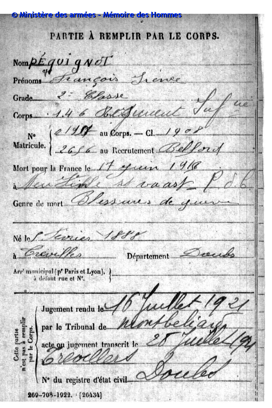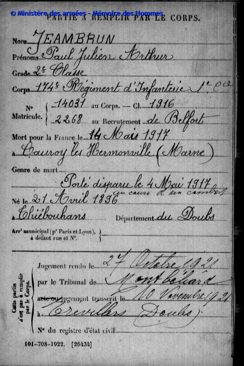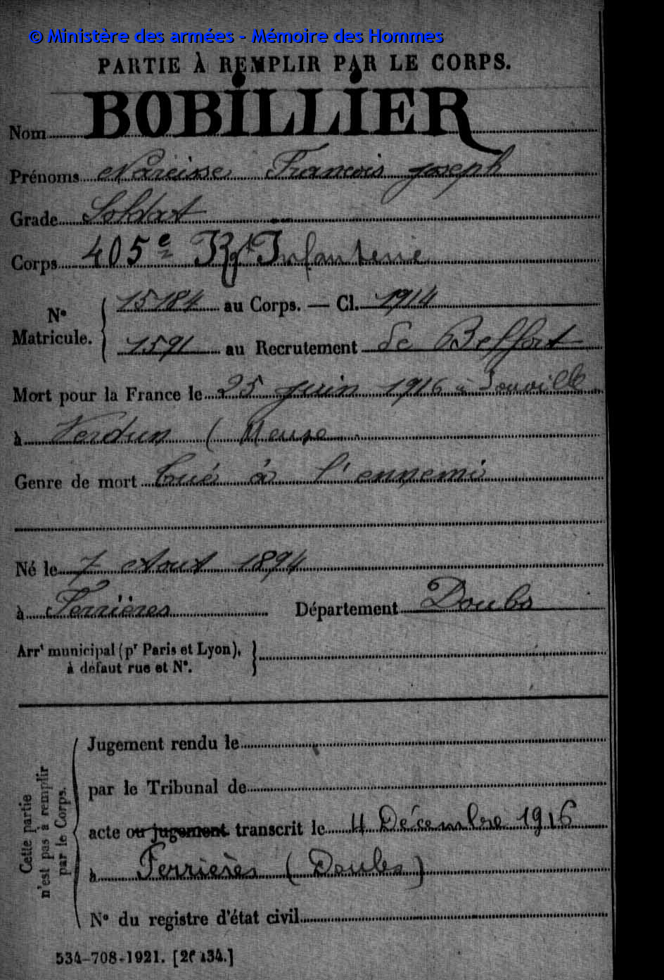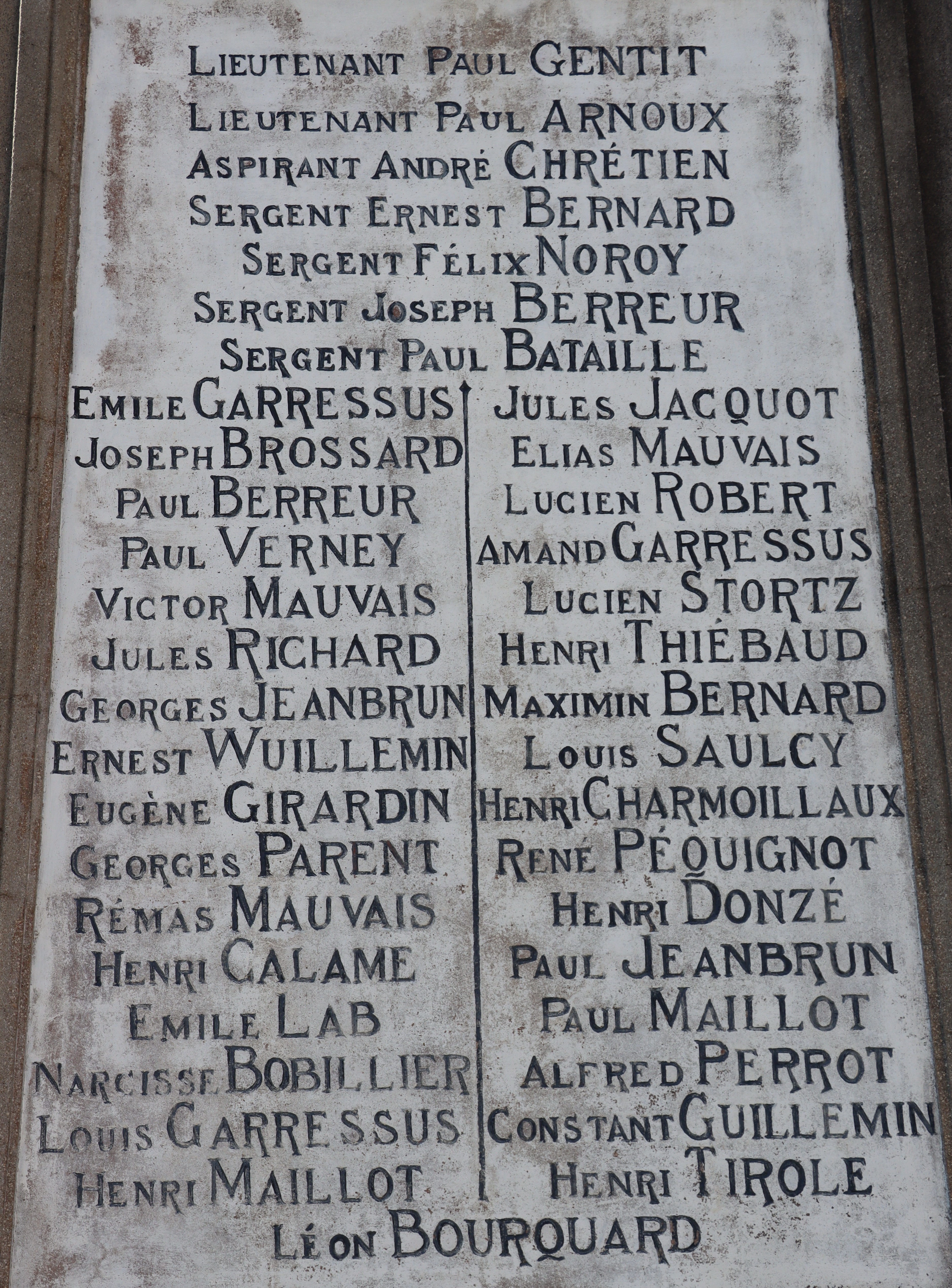 Von den 43 Namen der gefallenen Soldaten auf dem Kriegerdenkmal der 10,81 km2 Gemeinde mit 489 Einwohner im Departement Doubs (F) sind 38 mit Fabian Coulot verwandt.