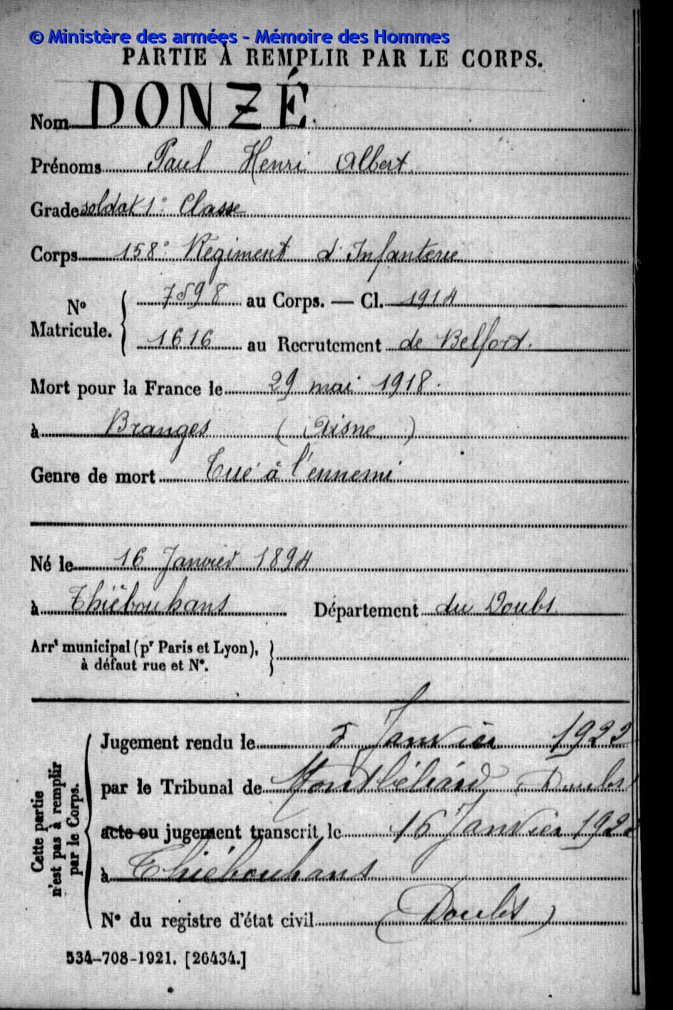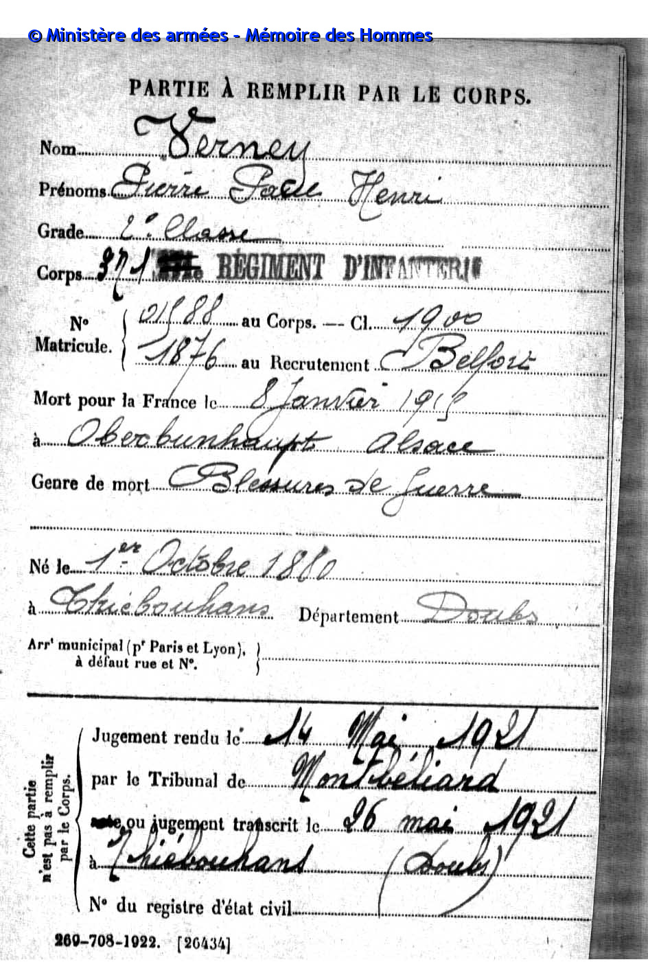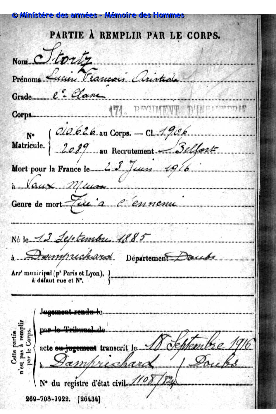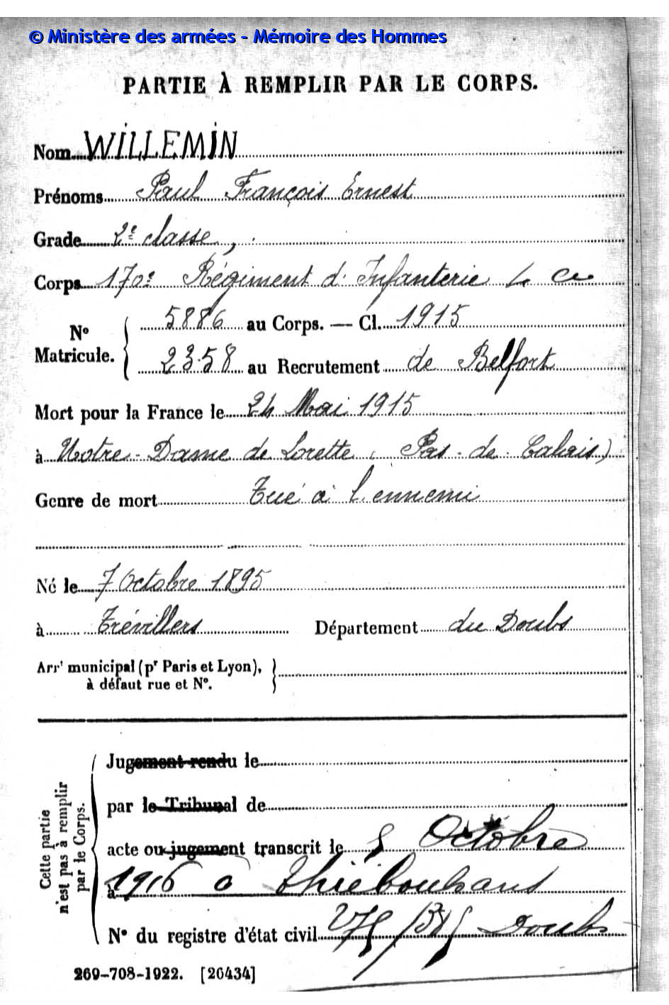 Von den 43 Namen der gefallenen Soldaten auf dem Kriegerdenkmal der 10,81 km2 Gemeinde mit 489 Einwohner im Departement Doubs (F) sind 38 mit Fabian Coulot verwandt.