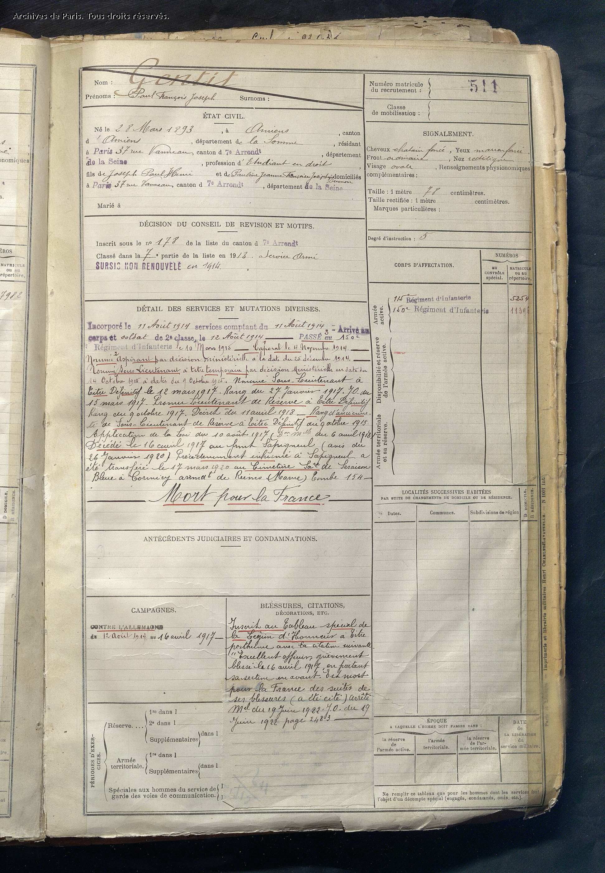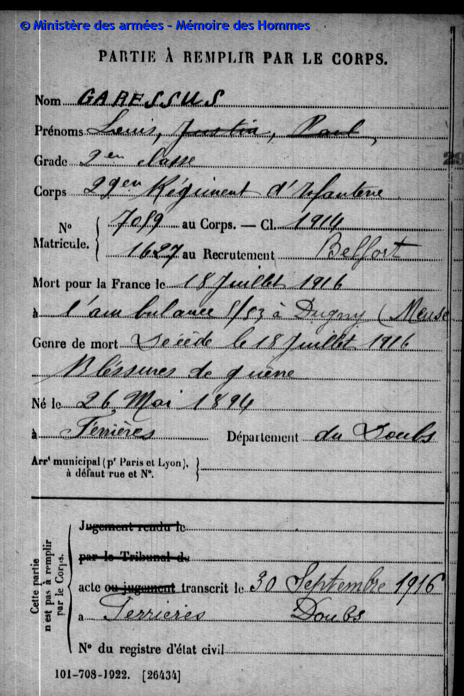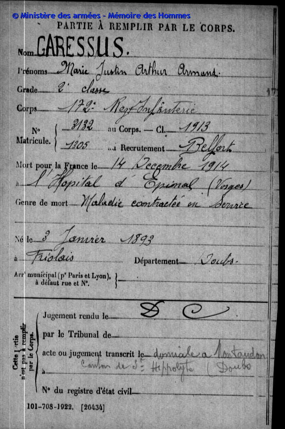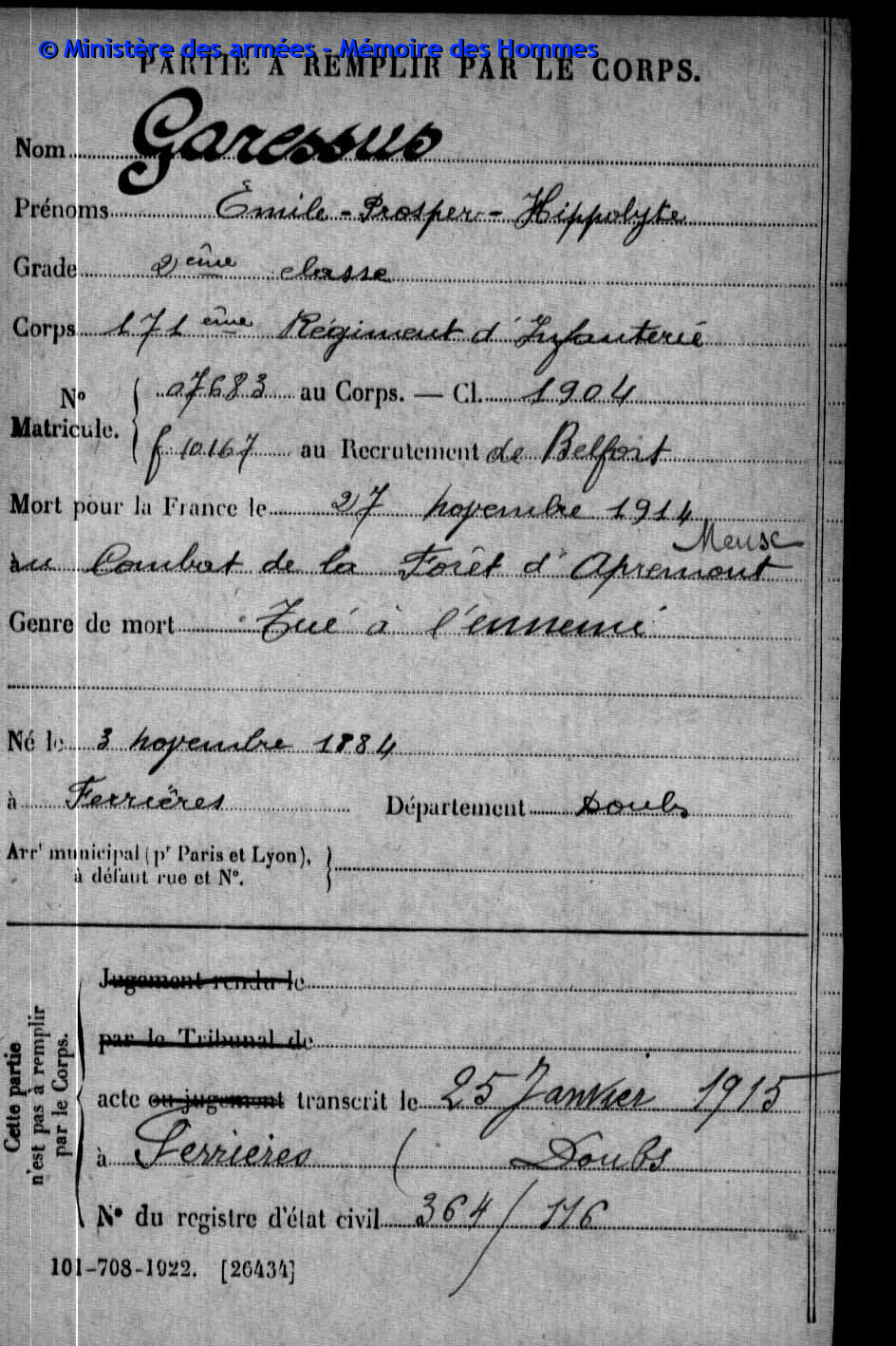 2ème classe GARESSUS Emile Prosper Hippolyte 03.11.1884 - 27.11.1914 171ème Régiment d'Infanterie Gefallen in Apremont-la-Forêt (F) |