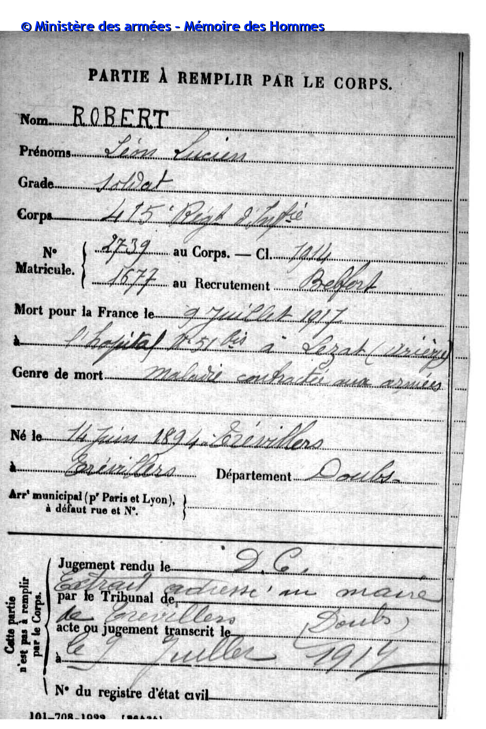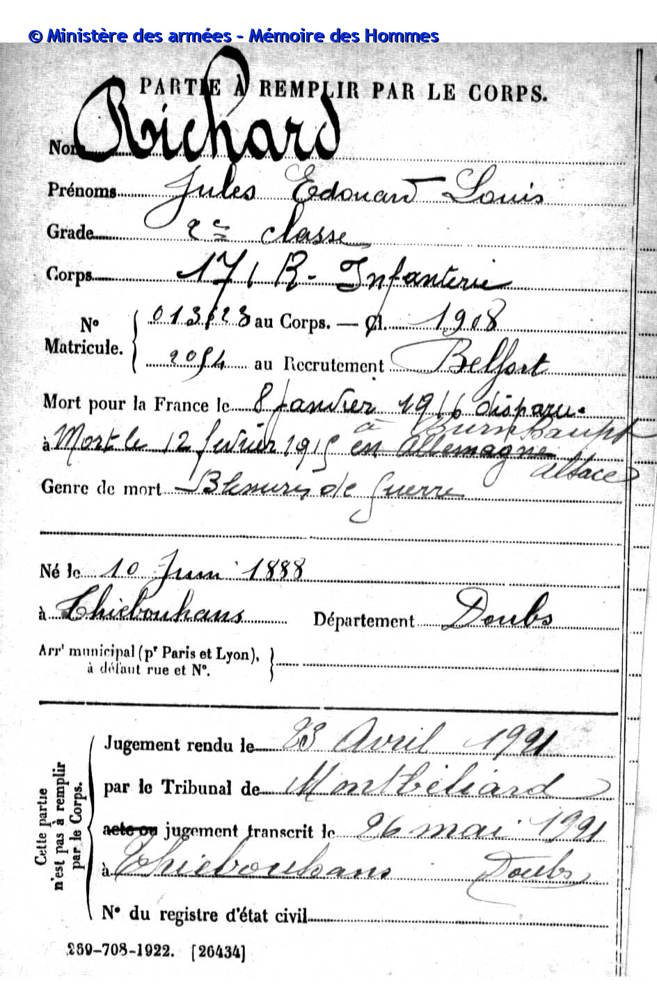 2ème classe RICHARD Jules Edouard Louis 10.06.1888 - 12.02.1915 171ème Régiment d'Infanterie Verstarb an seinen Wunden in Burnhaupt im Elsass (F) |