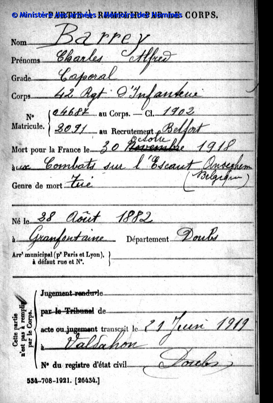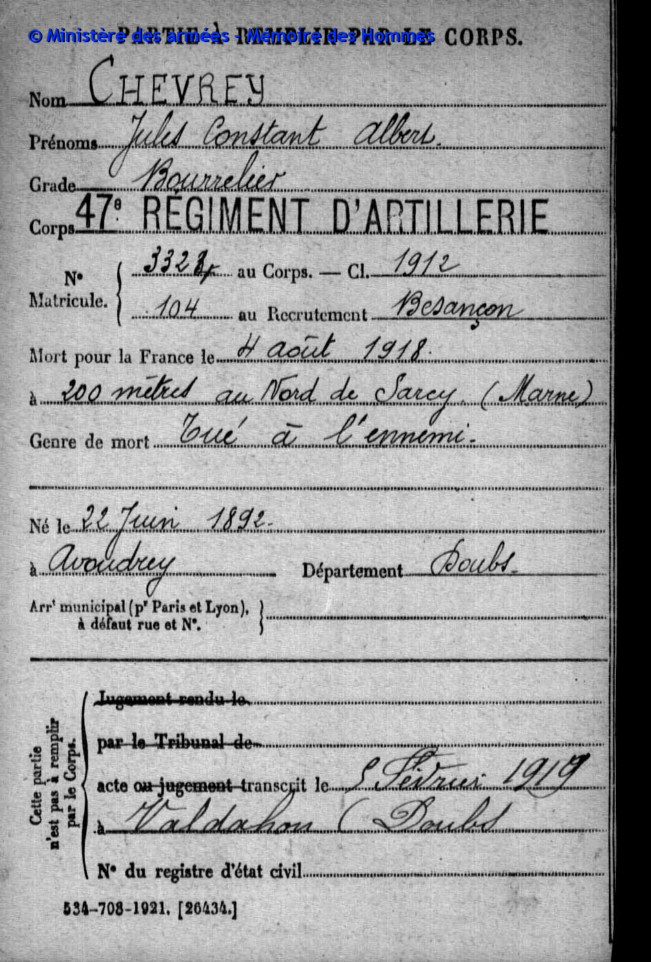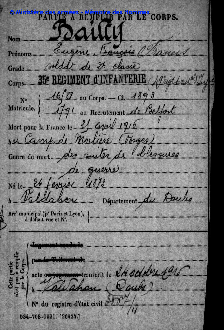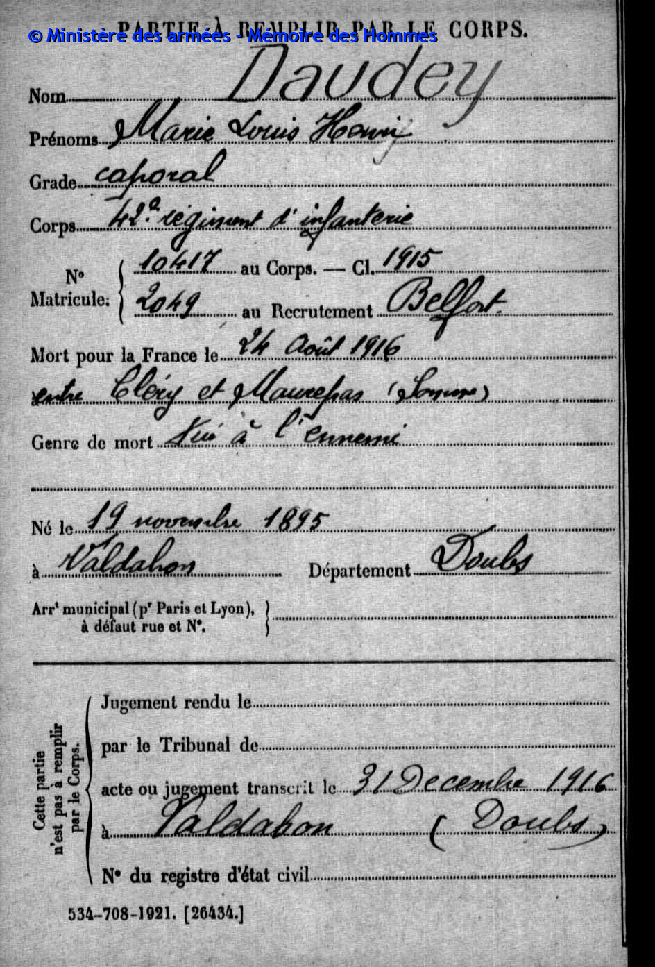 | Caporal DAUDEY Marie Louis Henri 19.11.1895 - 24.08.1916 42ème Régiment d'Infanterie Gefallen in Cléry - Somme (F) |