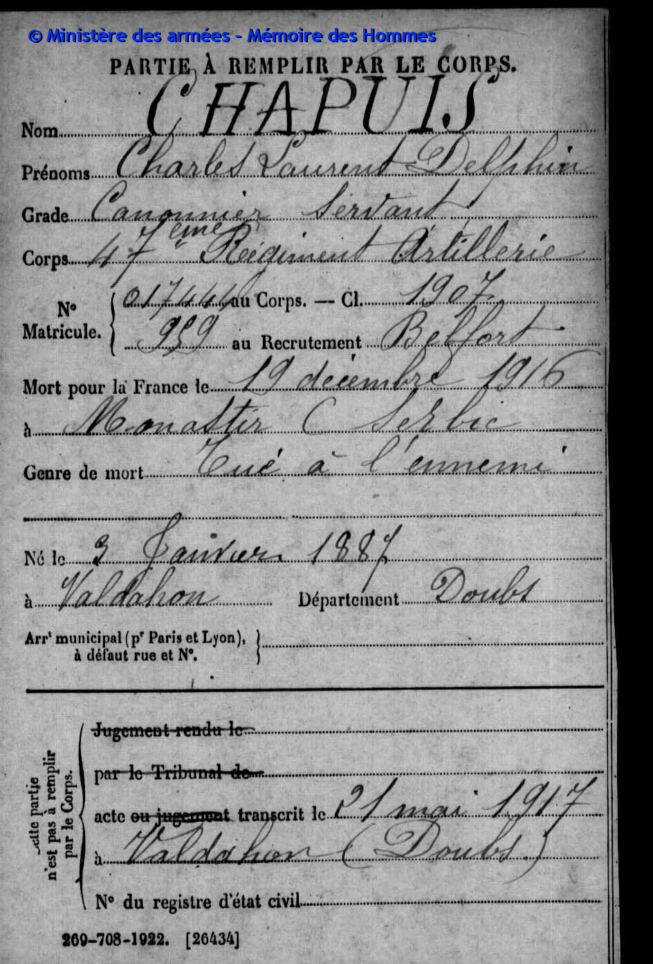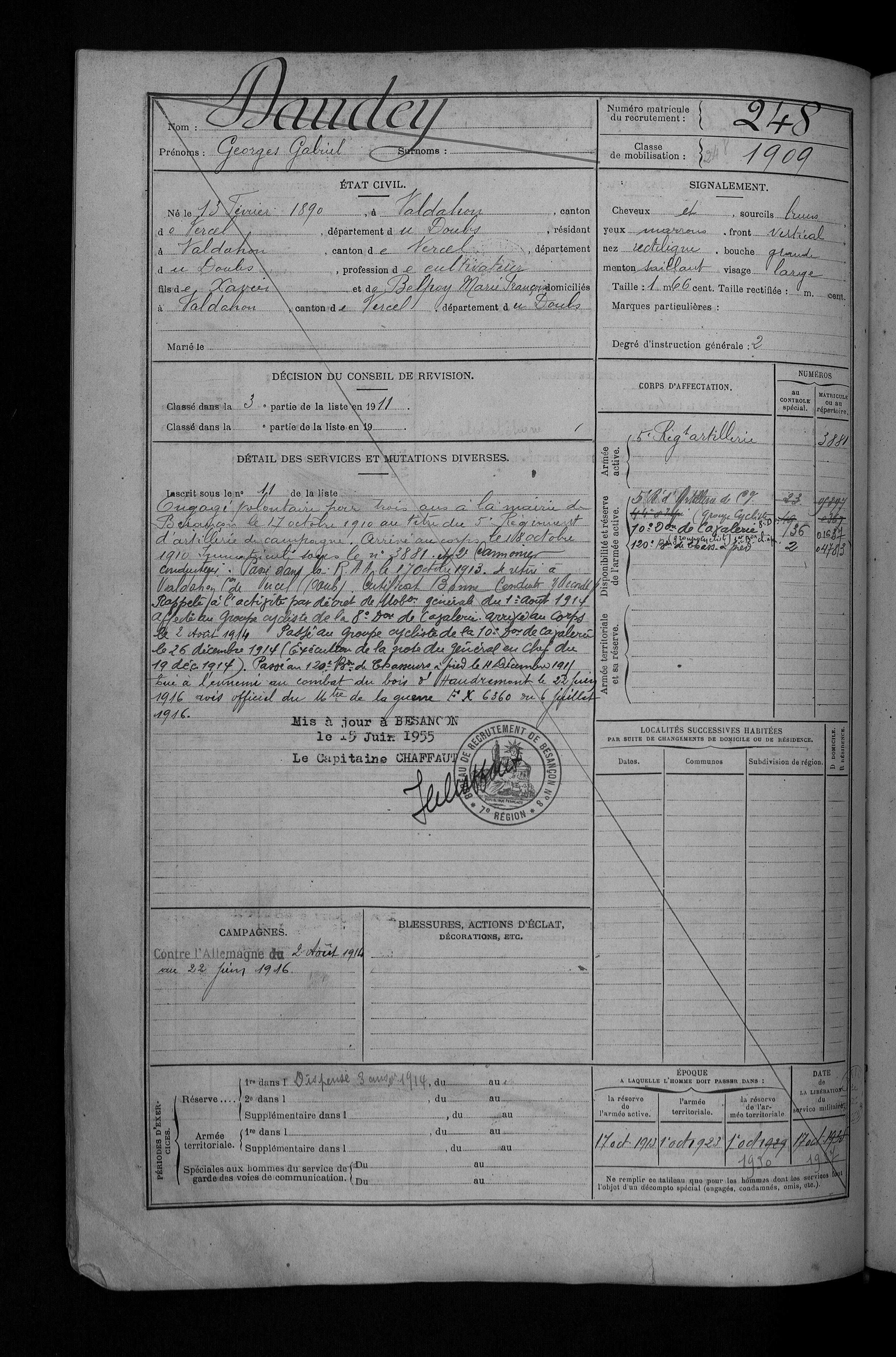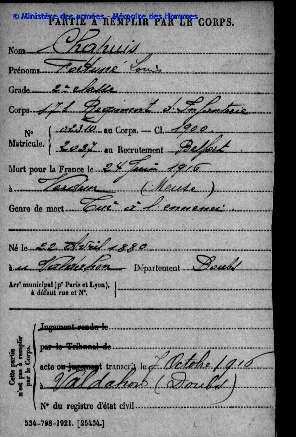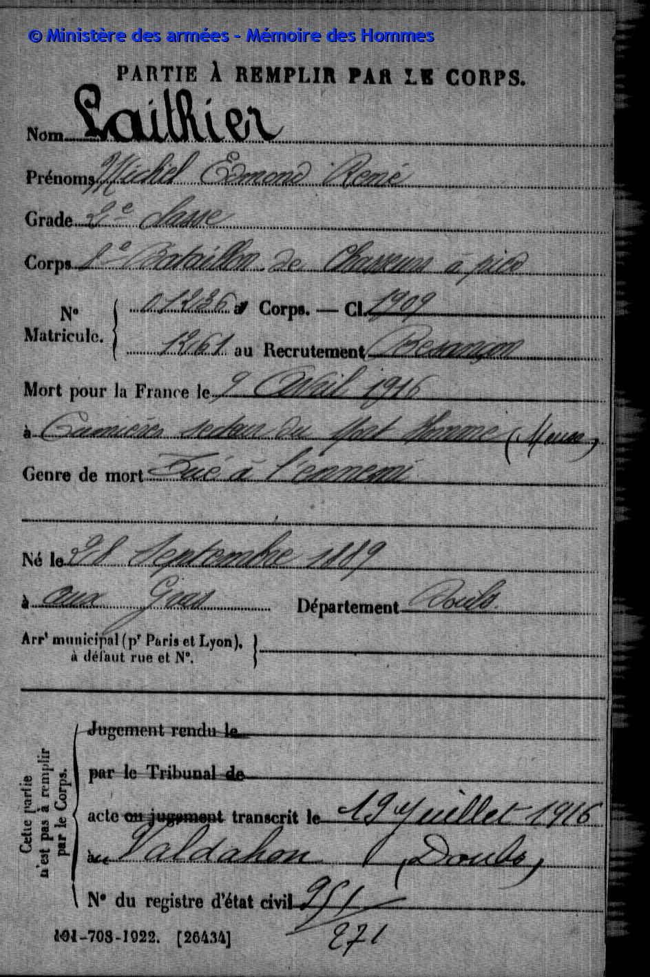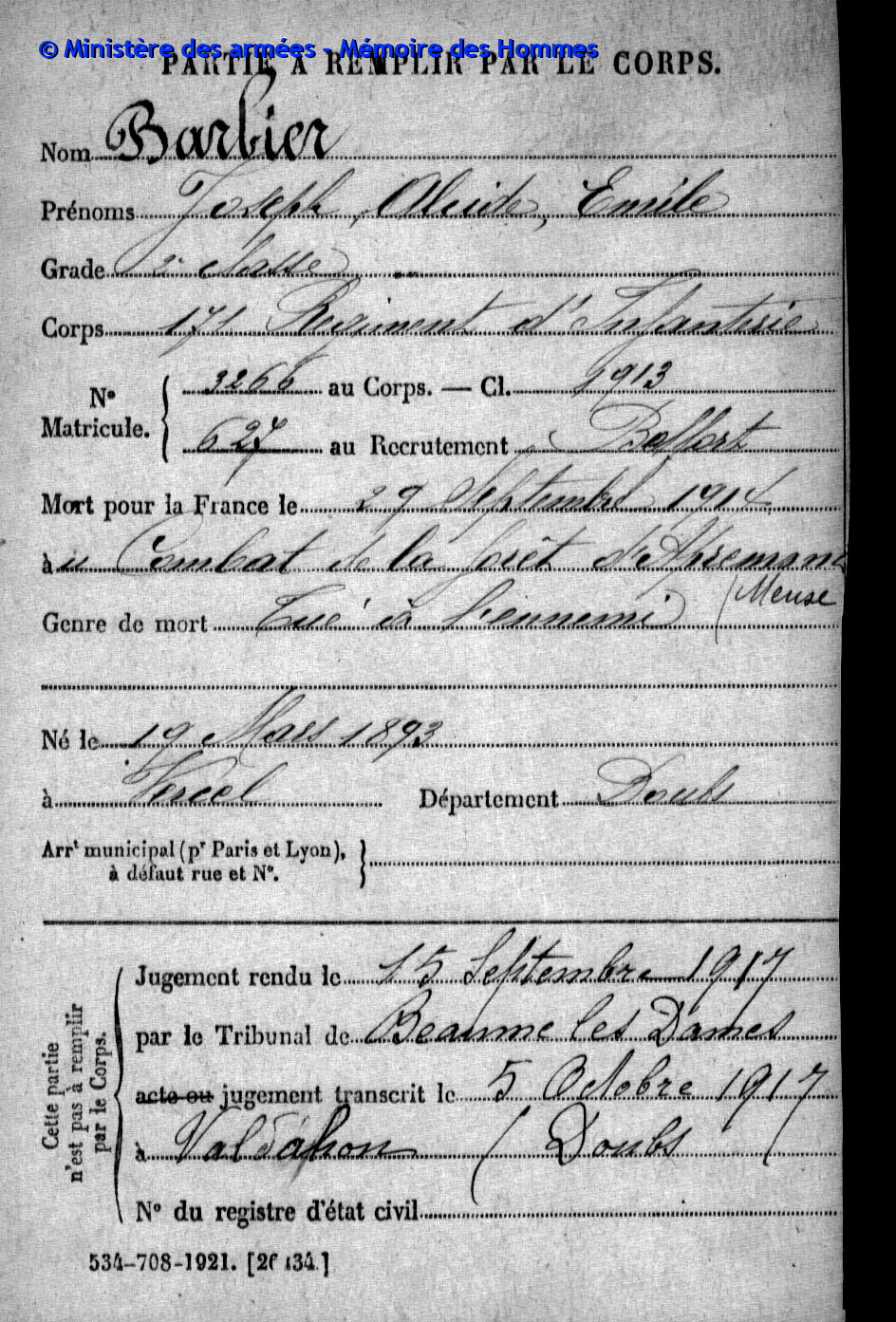 | Caporal DAUDEY Marie Louis Henri 19.11.1895 - 24.08.1916 42ème Régiment d'Infanterie Gefallen in Cléry - Somme (F) |