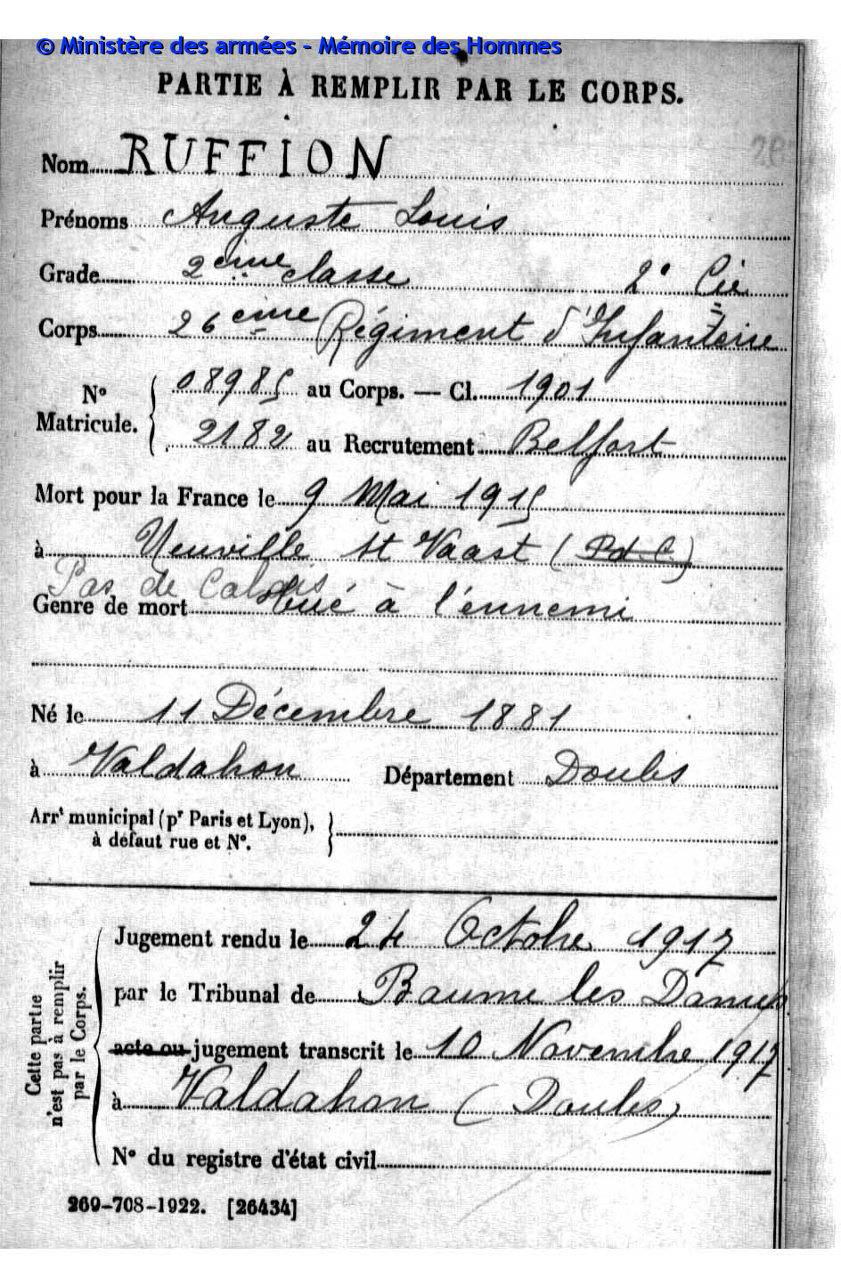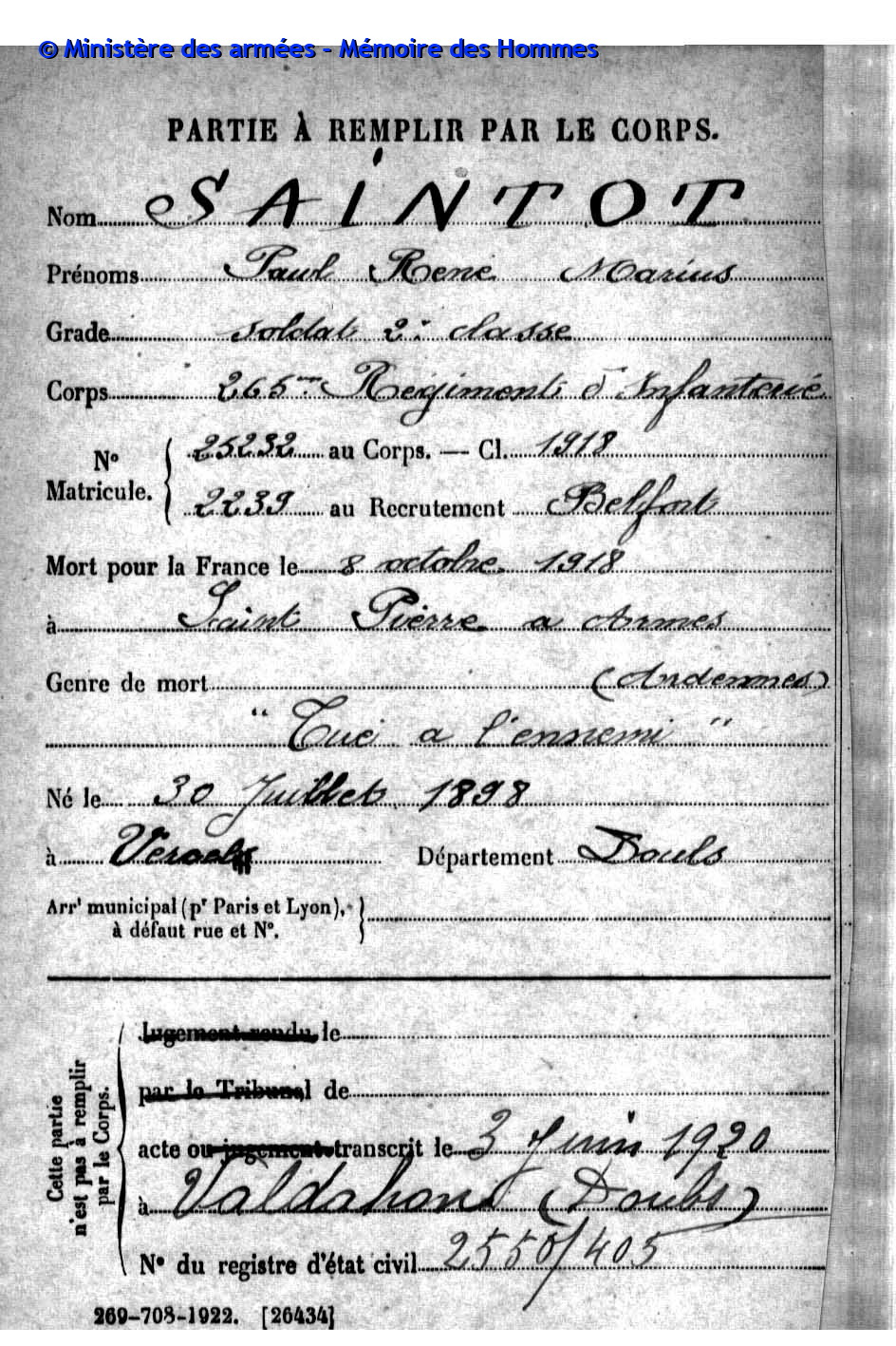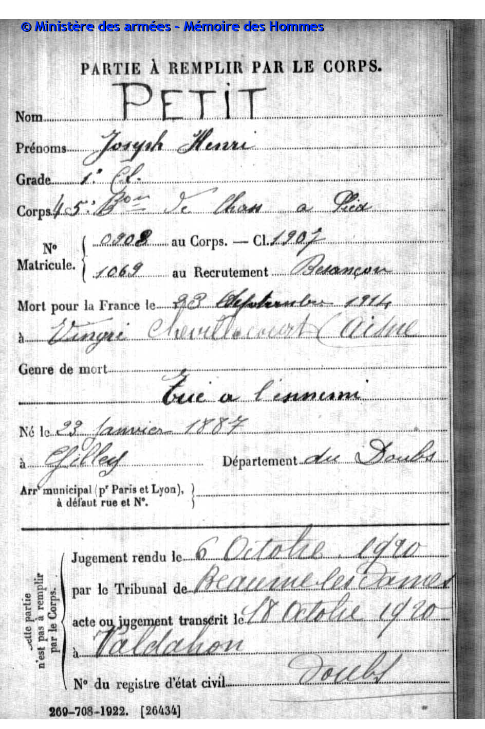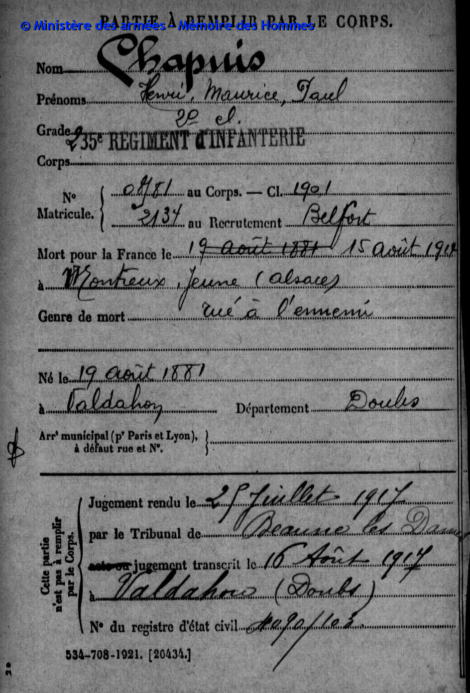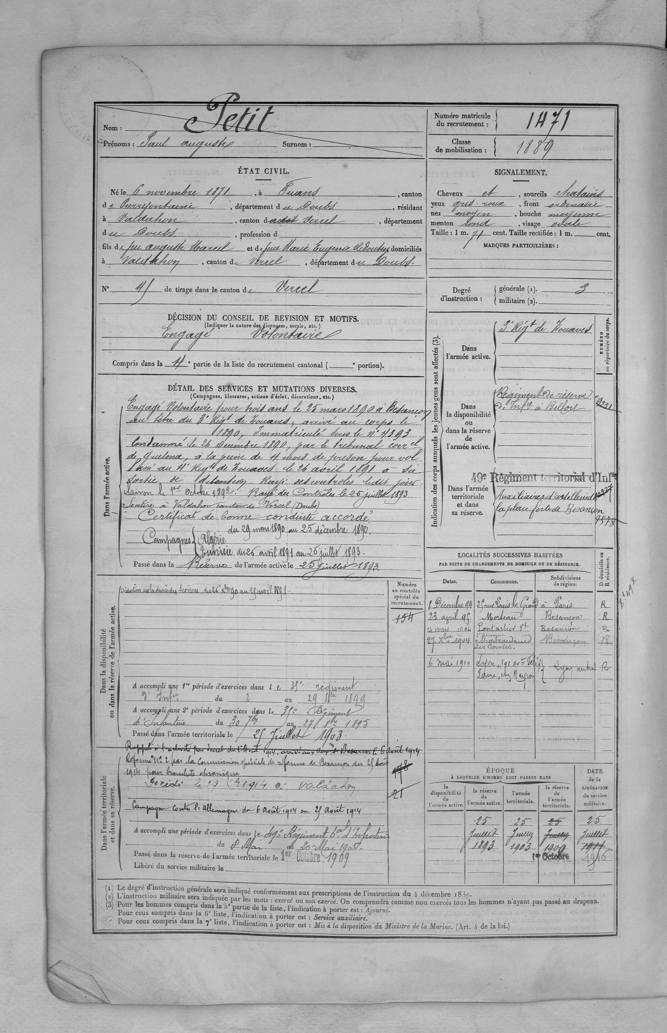 | Soldat PETIT Paul Auguste 06.11.1871 - 19.12.1914 3ème Régiment de Zouaves Verstarb zu Hause in Valdahon (F) |