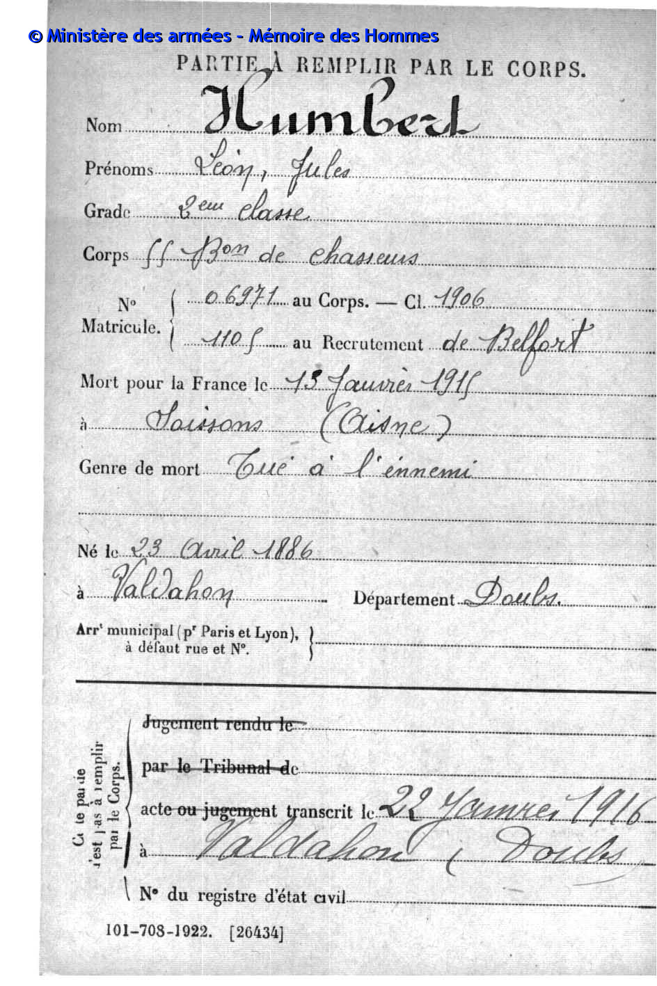 2ème classe HUMBERT Léon Jules 23.04.1886 - 13.01.1915 55ème Bataillon de Chasseurs à Pied Gefallen in Soissons - Aisne (F) |