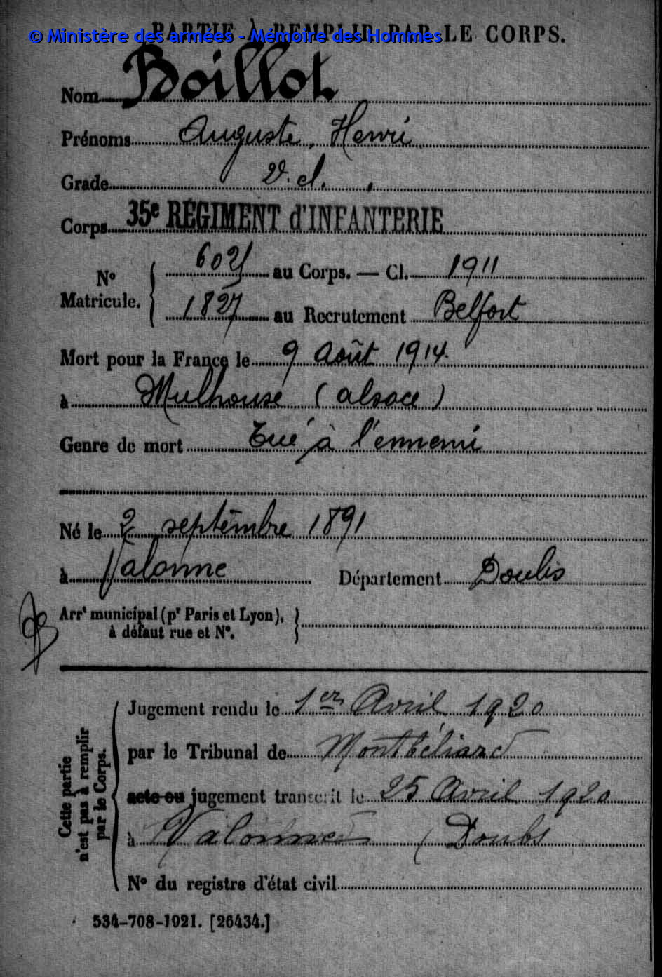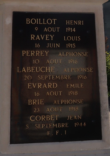 8,33 Km2 grosse Gemeinde mit 244 Einwohner im Departement Doubs (F). Von den 8 Namen der gefallenen Soldaten auf dem Kriegerdenkmal sind 2 Soldaten mit Fabian Coulot verwandt