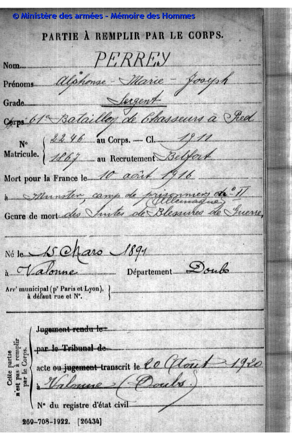 | Sergent PERREY Alphonse Marie Joseph 15.03.1891 - 10.08.1916 61ème Bataillon de Chasseurs à Pied Verstarb durch Krankheit als Kriegsgefangener in Münster (D) |