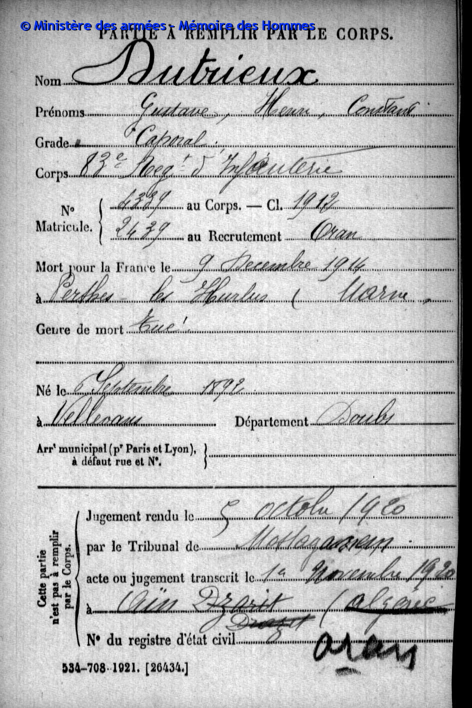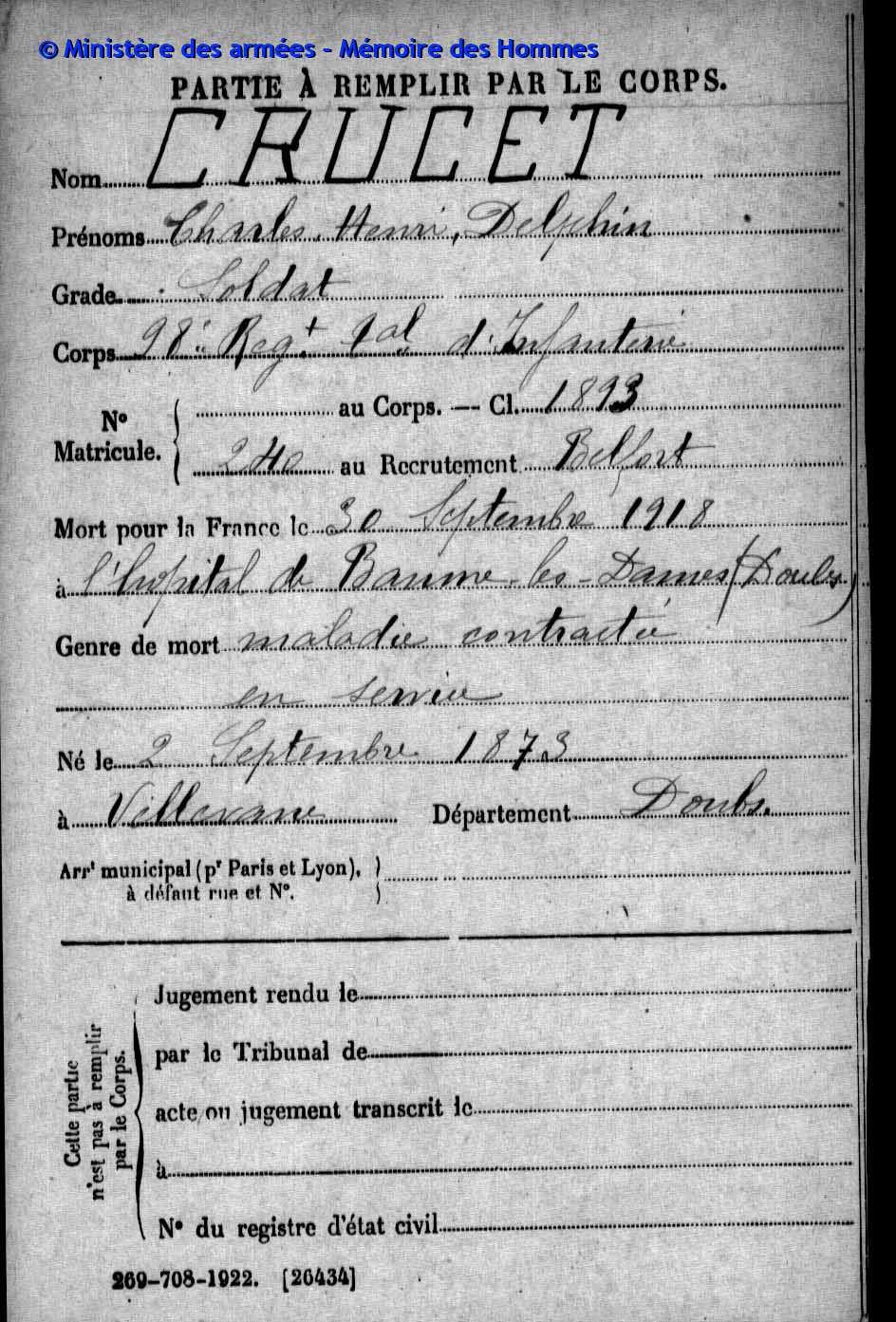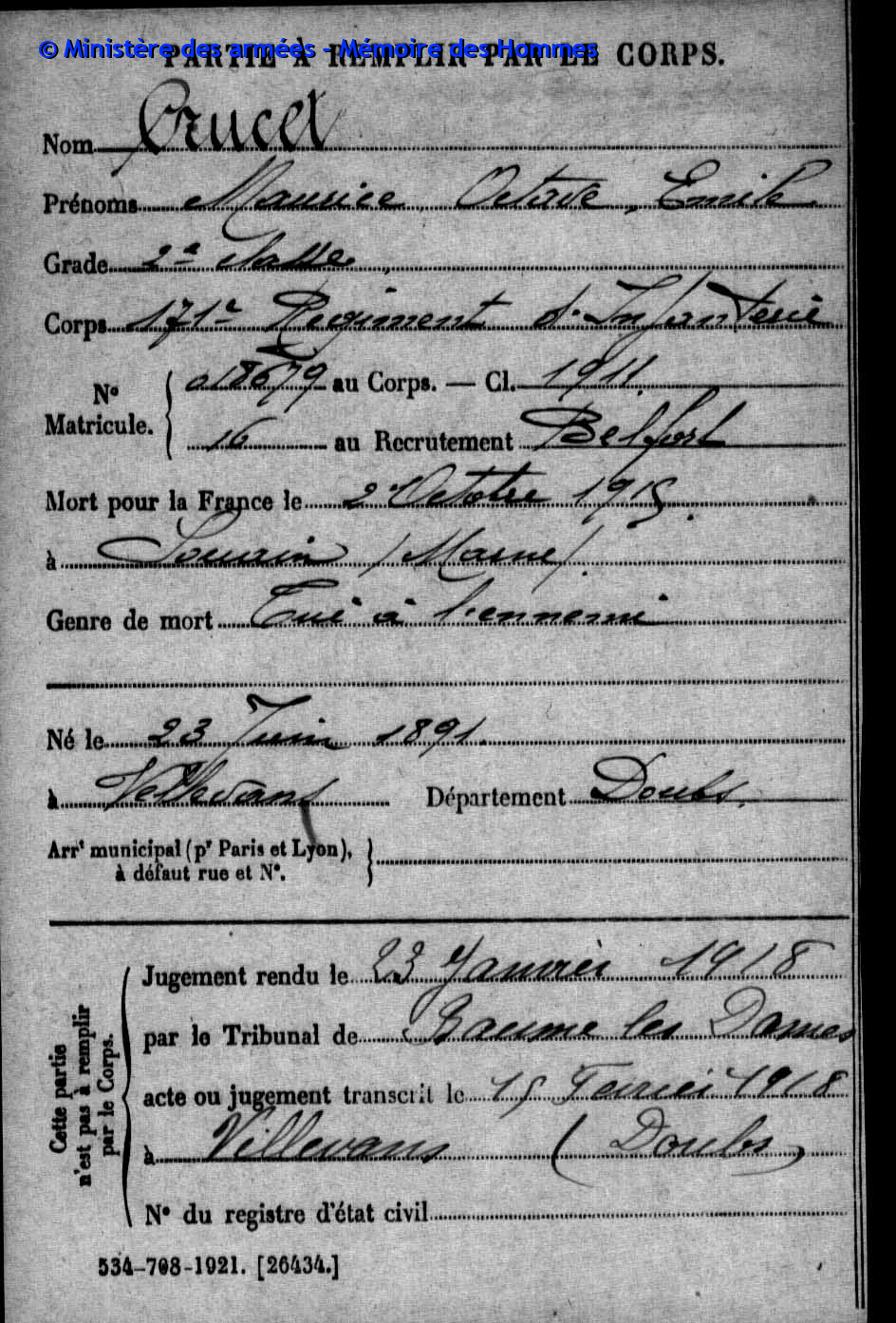 2ème classe CRUCET Maurice Octave Emile 23.06.1891 - 02.10.1915 171ème Régiment d'Infanterie Gefallen in Souain - Marne (F) |