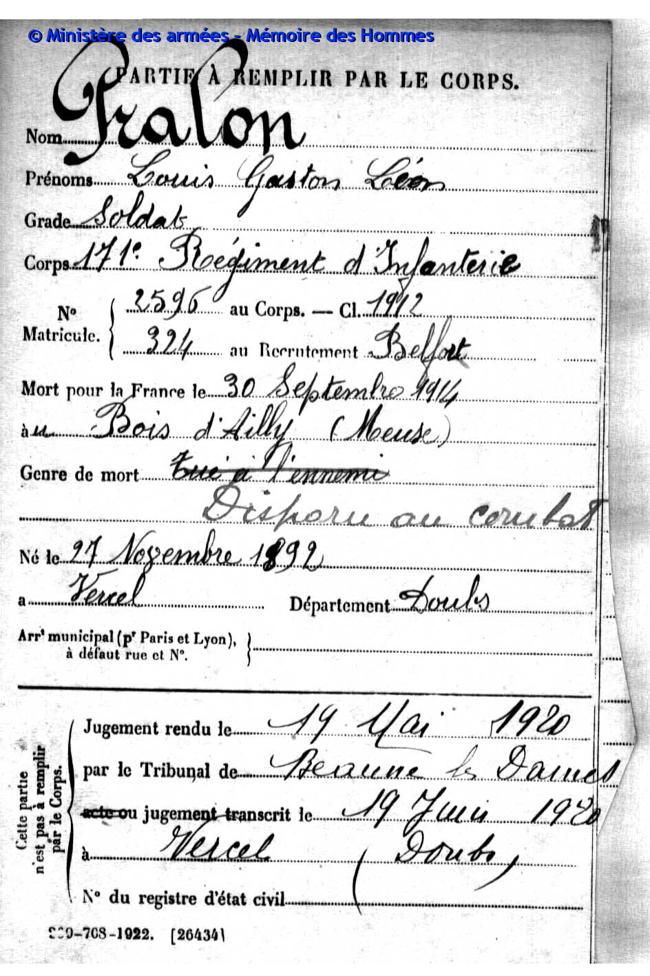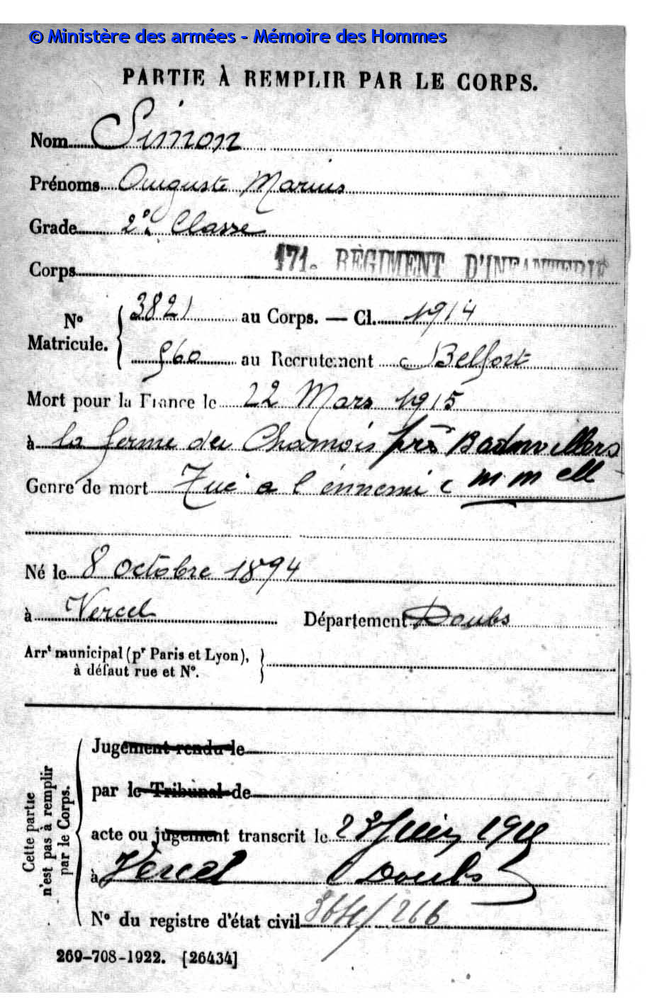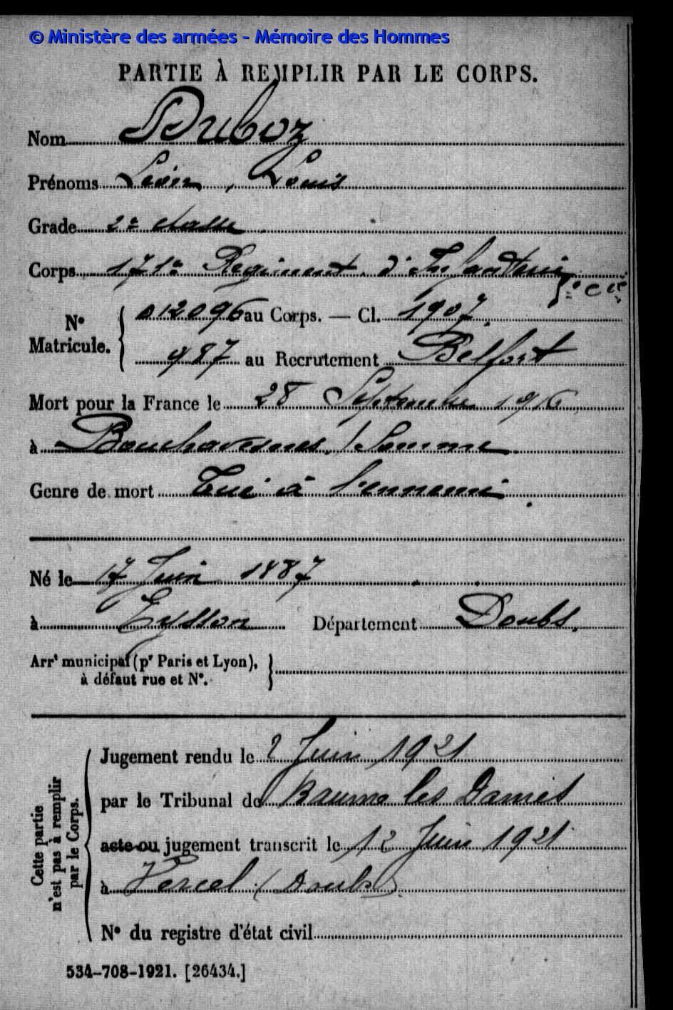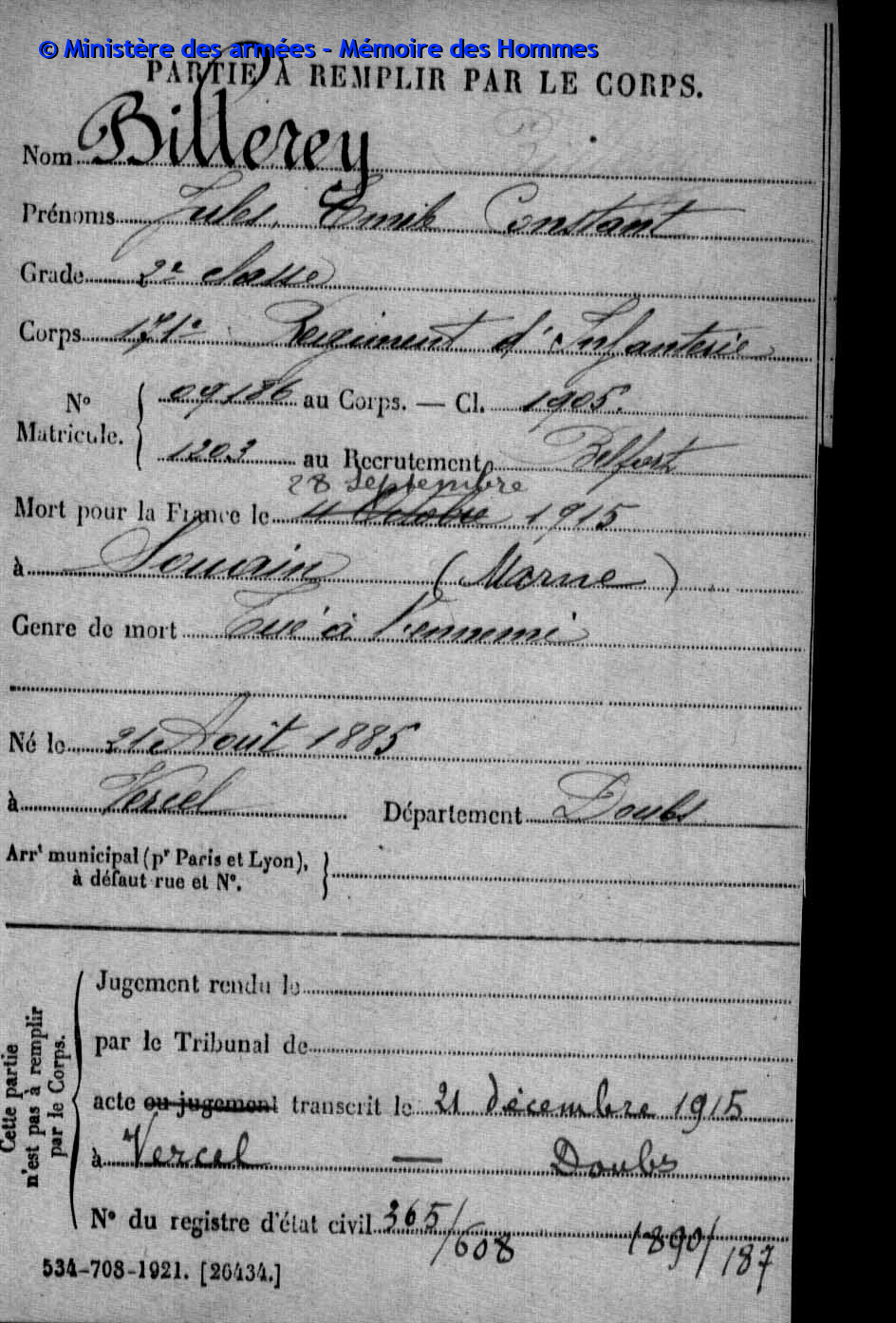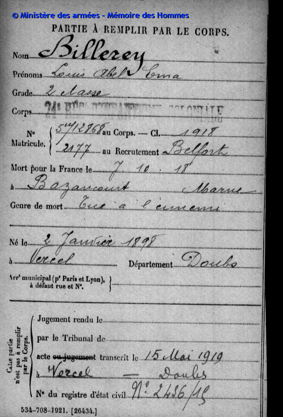 2ème classe BILLEREY Louis Abel Ema 02.01.1898 - 07.10.1918 24ème Régiment d'Infanterie Coloniale Gefallen in Bazancourt - Marne (F) |