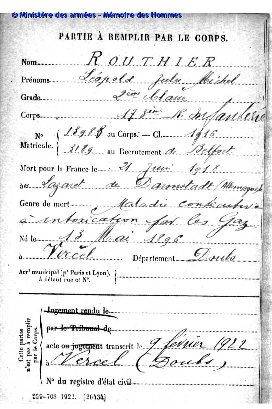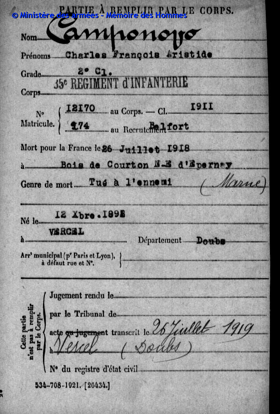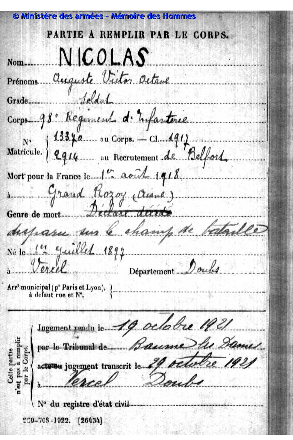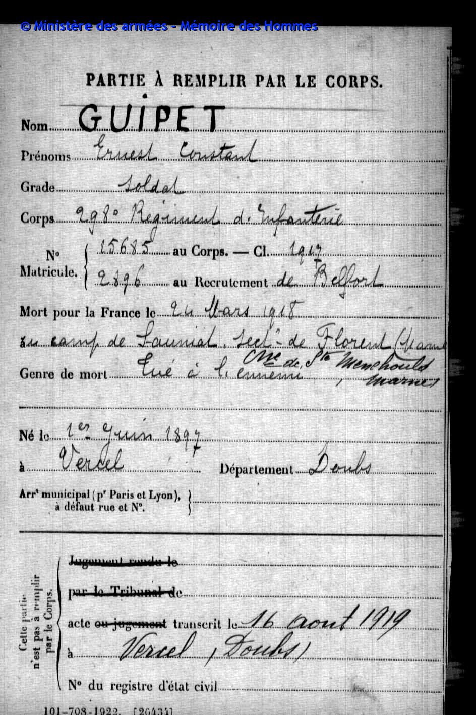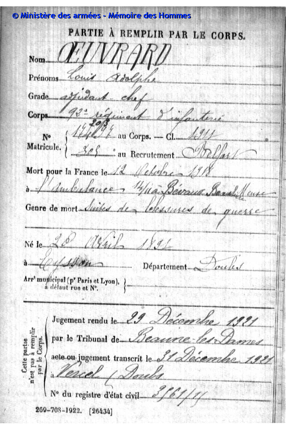 2ème classe BILLEREY Louis Abel Ema 02.01.1898 - 07.10.1918 24ème Régiment d'Infanterie Coloniale Gefallen in Bazancourt - Marne (F) |