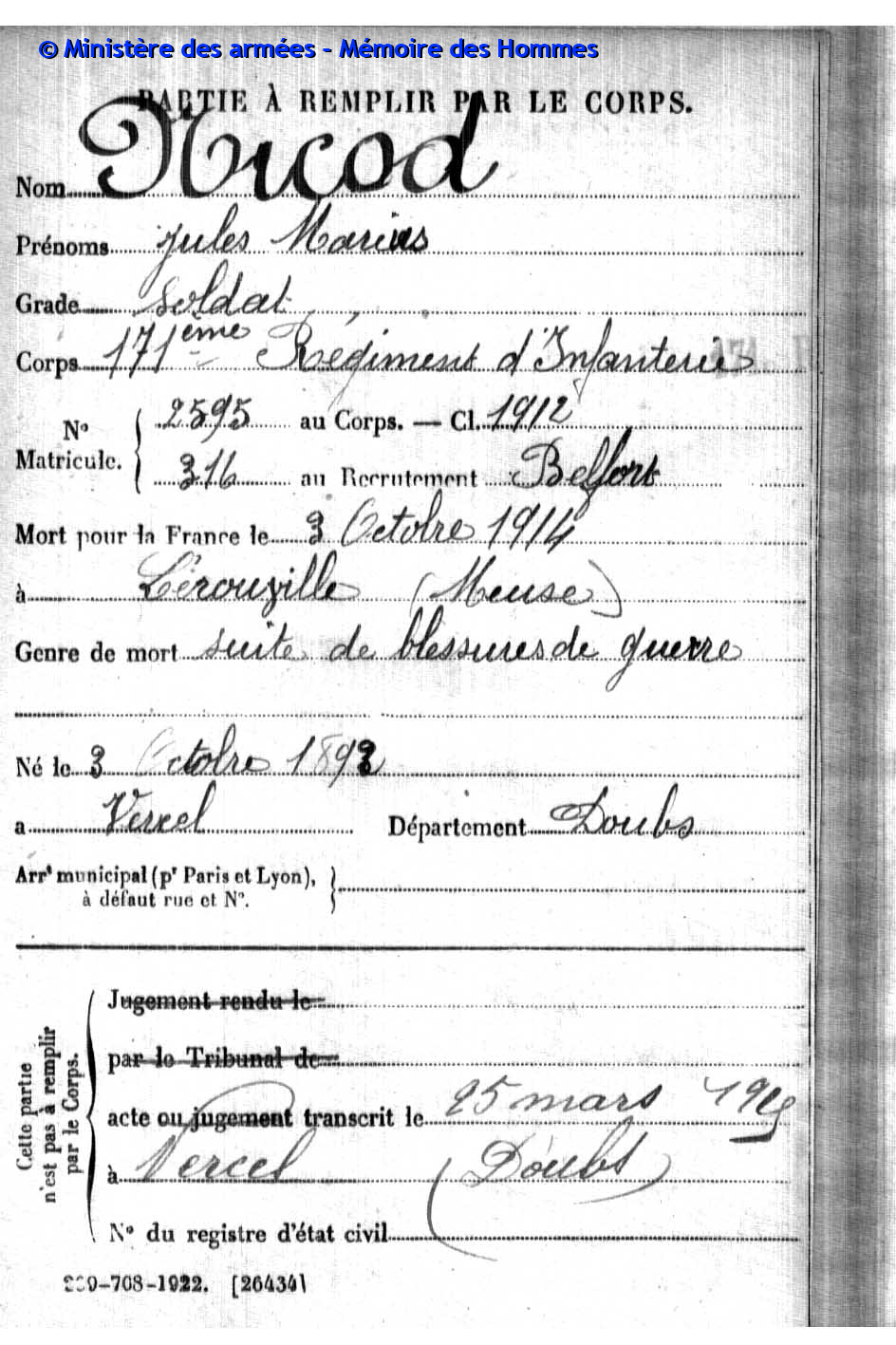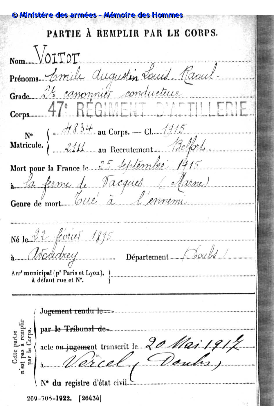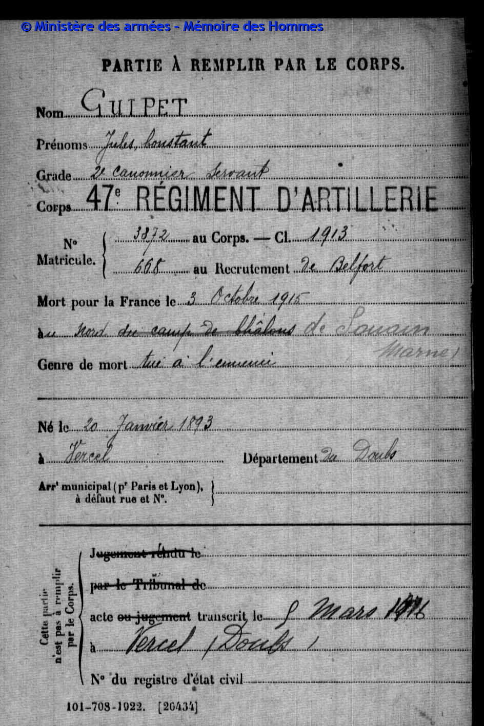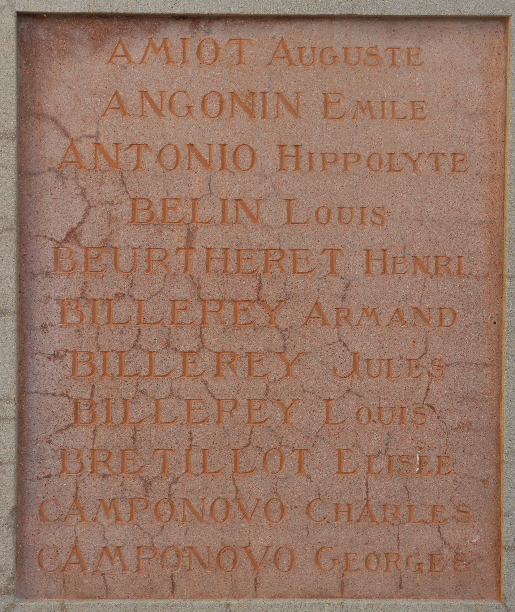 Auf dem Kriegerdenkmal des Ortes sind die Namen von 55 im Krieg gefallenen Soldaten aufgelistet, davon sind 27 mit Fabian Coulot verwandt.