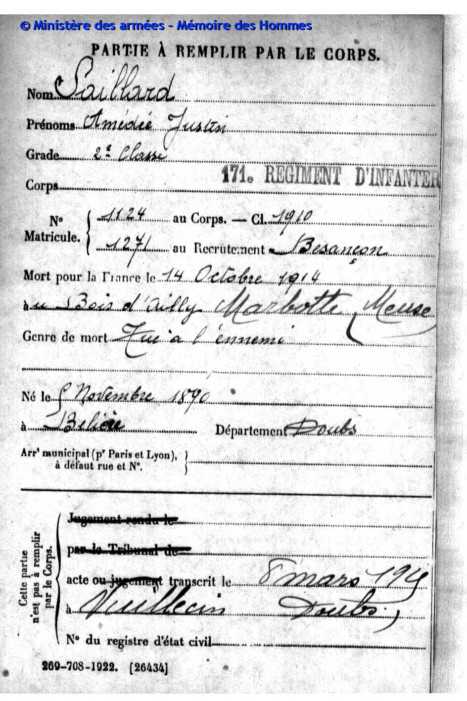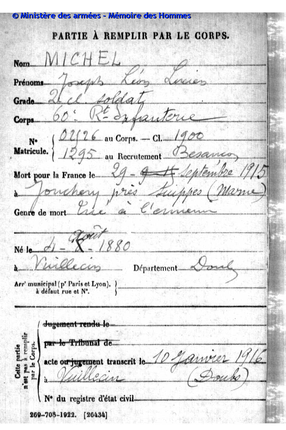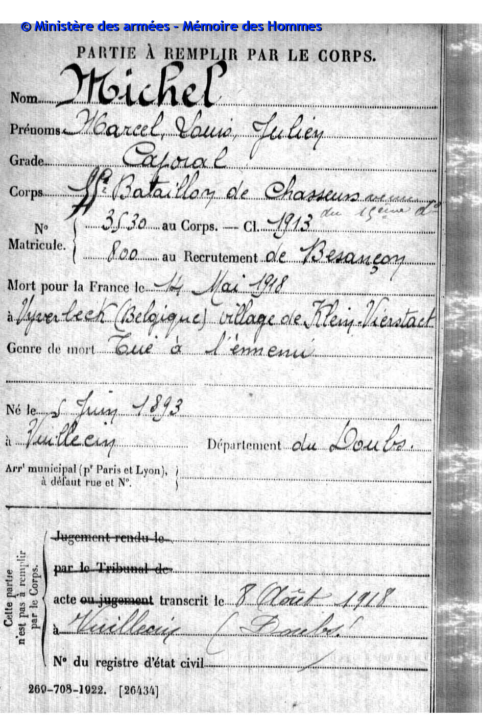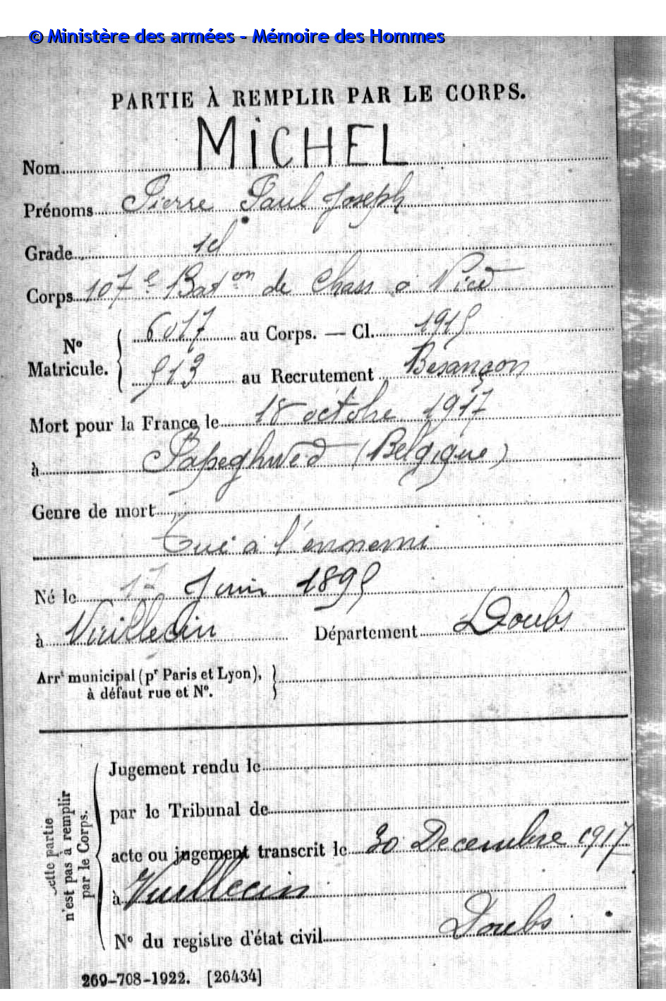 1ère classe MICHEL Pierre Paul Joseph 17.06.1895 - 18.10.1917 107ème Bataillon de Chasseurs à Pied Gefallen in Papegoed (BE) |