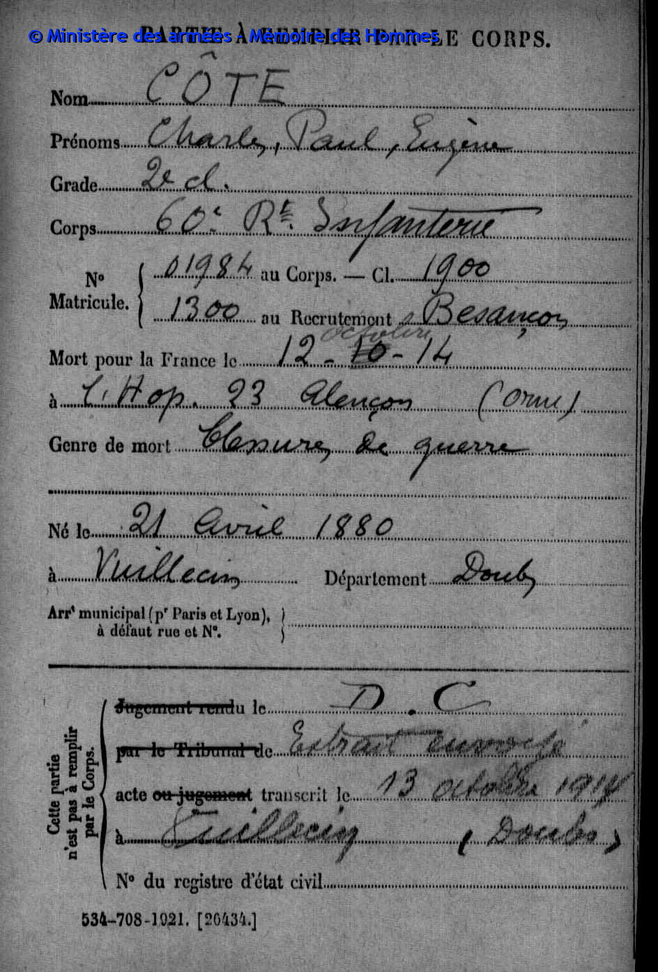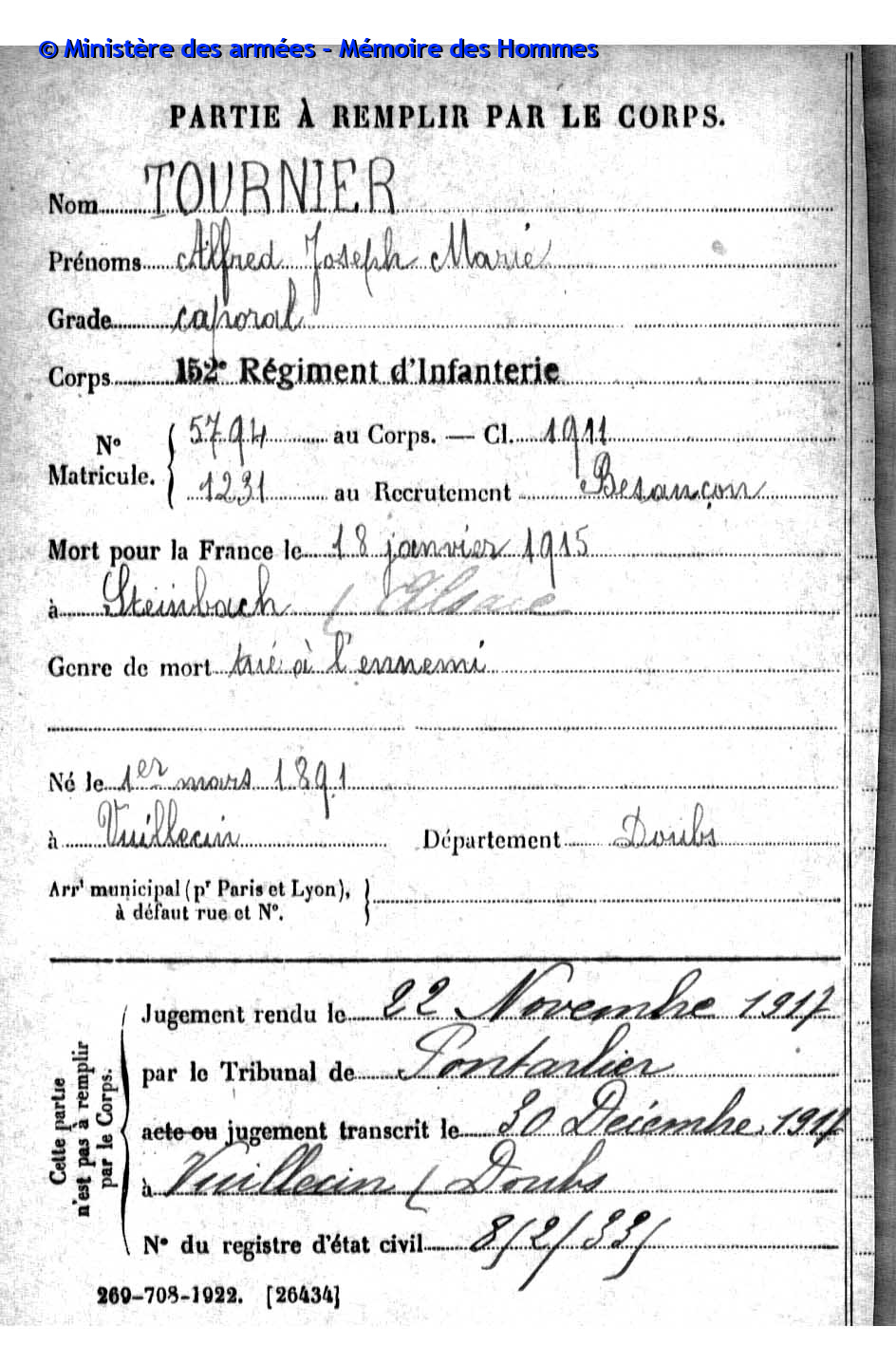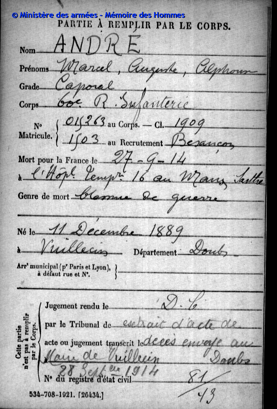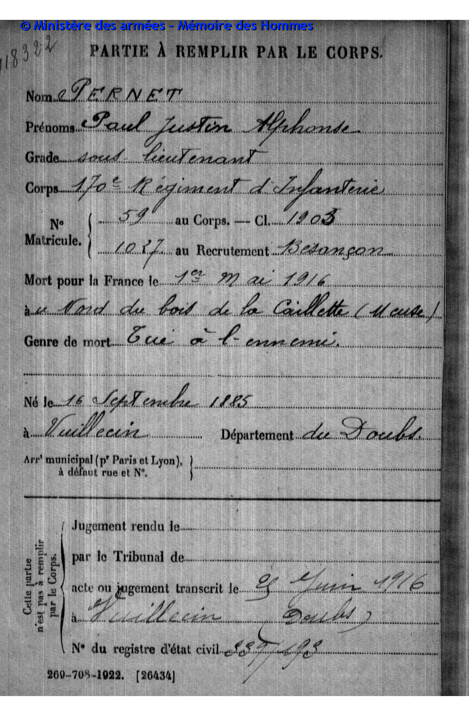 1ère classe MICHEL Pierre Paul Joseph 17.06.1895 - 18.10.1917 107ème Bataillon de Chasseurs à Pied Gefallen in Papegoed (BE) |