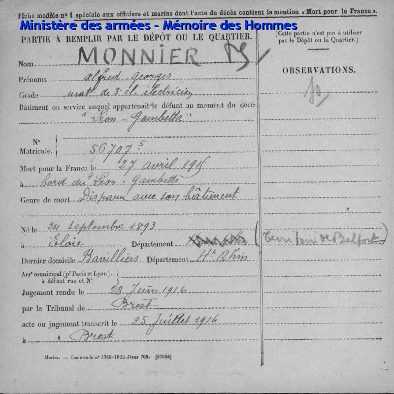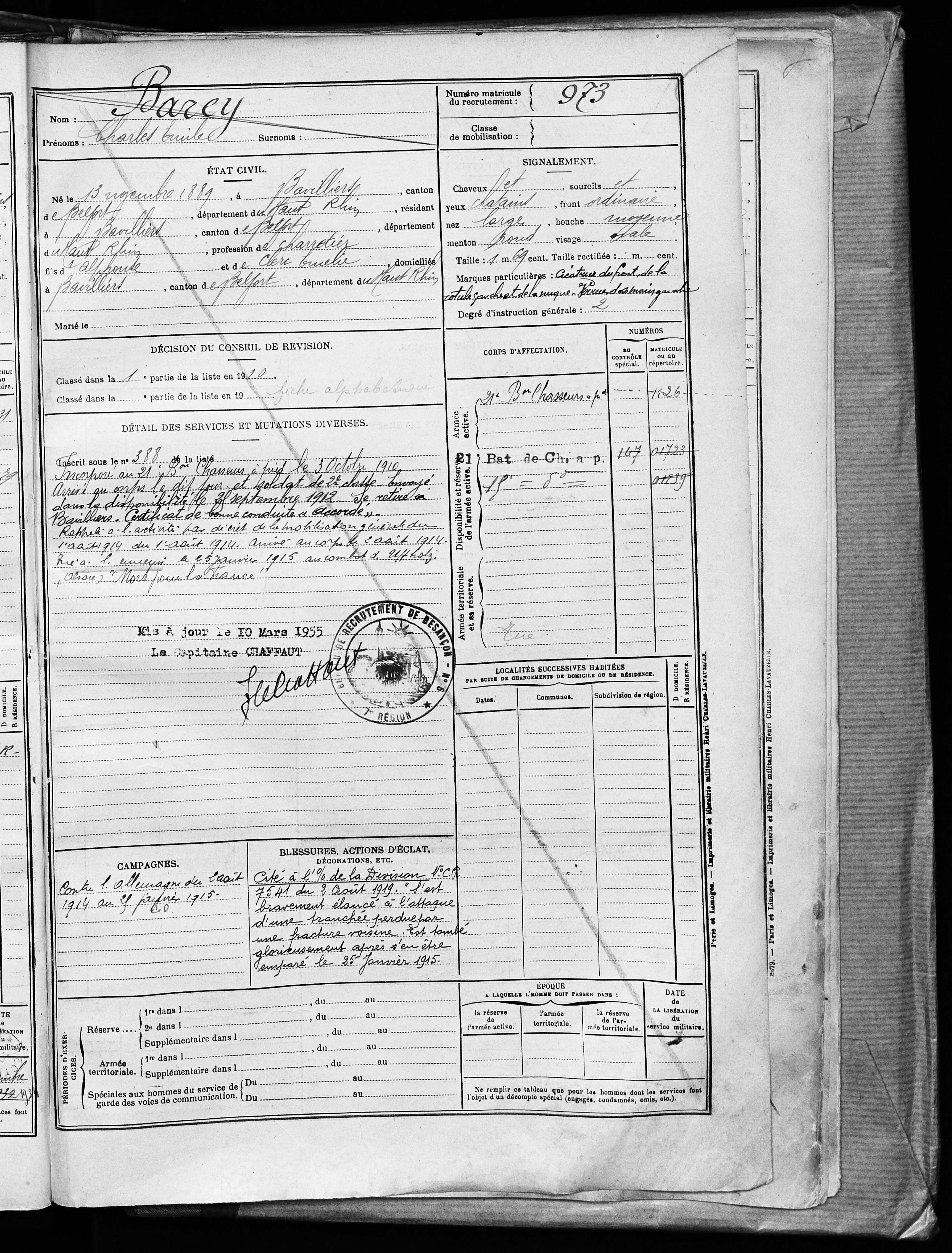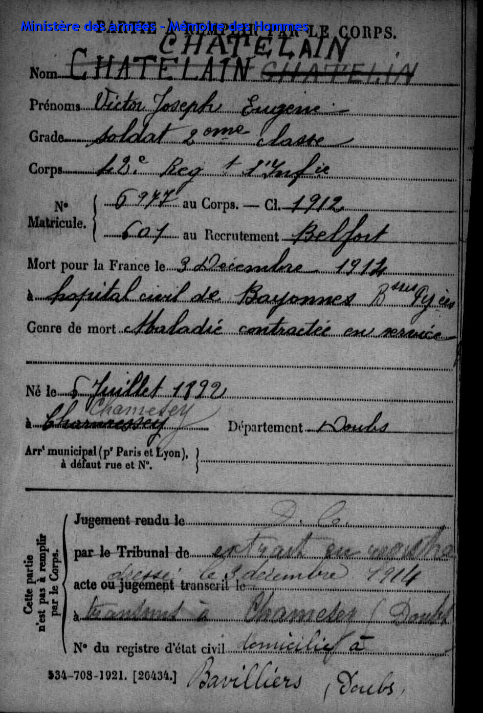 Am 03.12.1942 wurde er als Eisenbahner von seiner Gesellschaft aufgefordert in Deutschland zu arbeiten und wurde zur Deutschen Reichsbahn abkommandiert. Nach einer krankheitshalber Beurlaubung kehrte er zurück nach Frankreich und schliss sich als Kämpfer der 8. Kompagnie der Maquis von Belfort an. Als Gruppenführer der 1. Kompagnie von Etobon wurde er bei einem Gefecht mit einem Deutschen Leutnant am 13.09.1944 schwer verletzt und verstarb am 14.09.1944 |