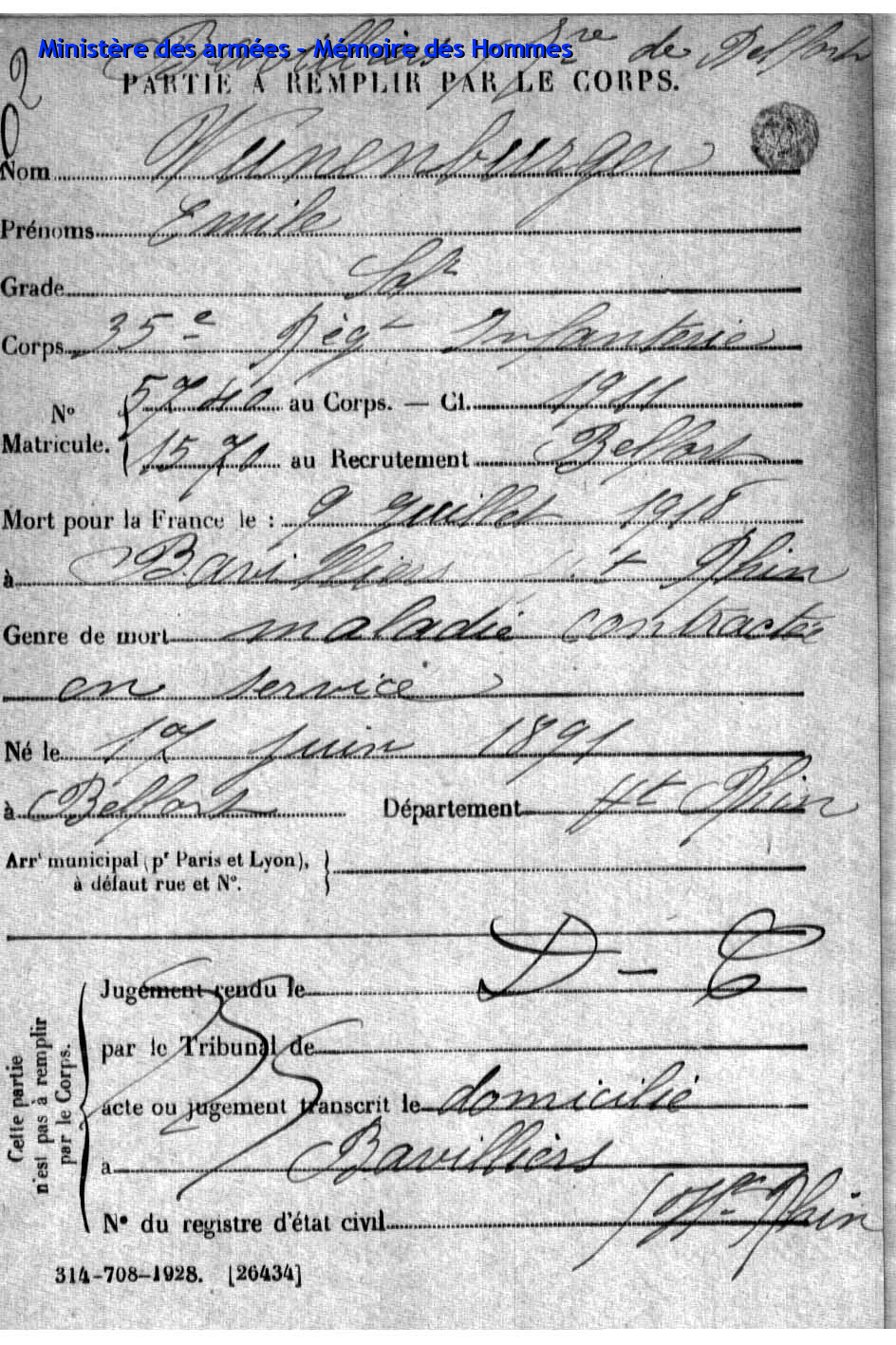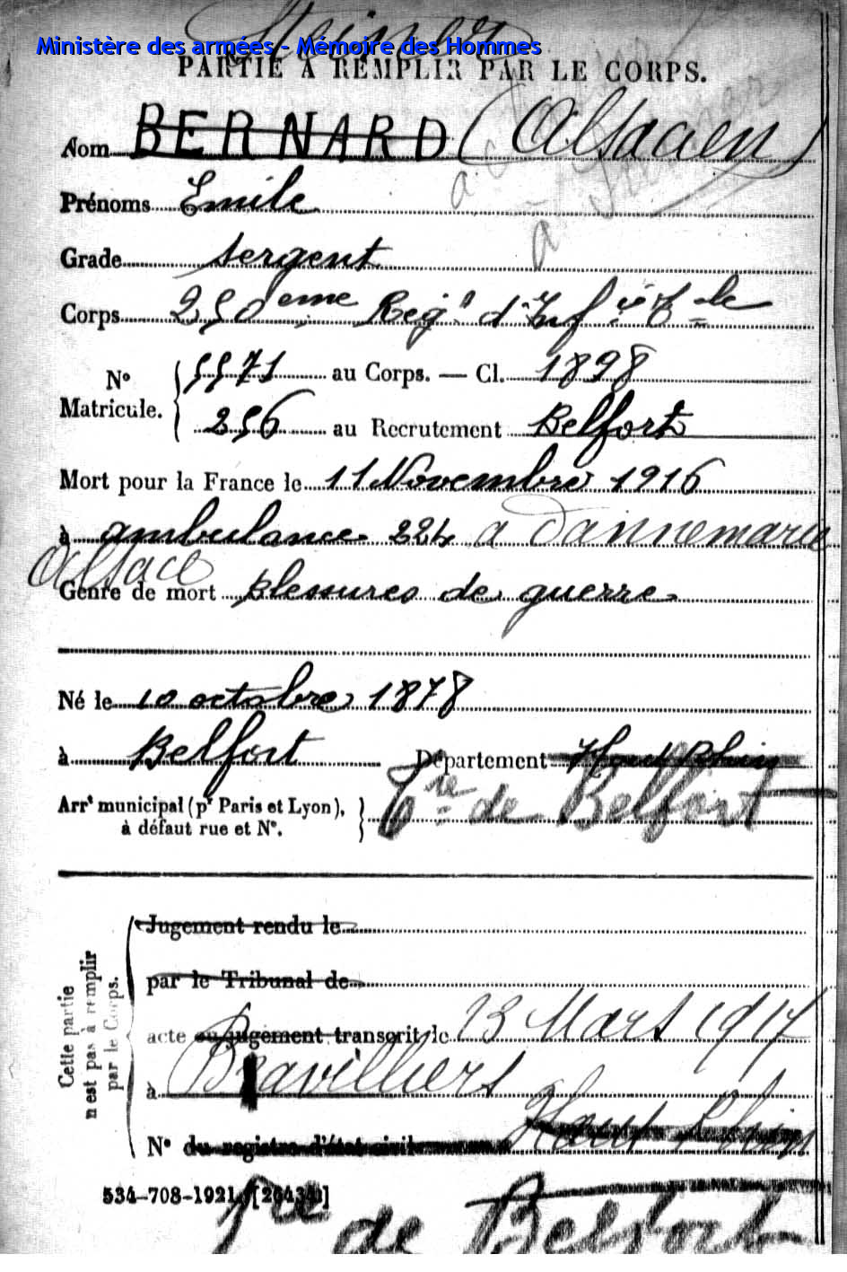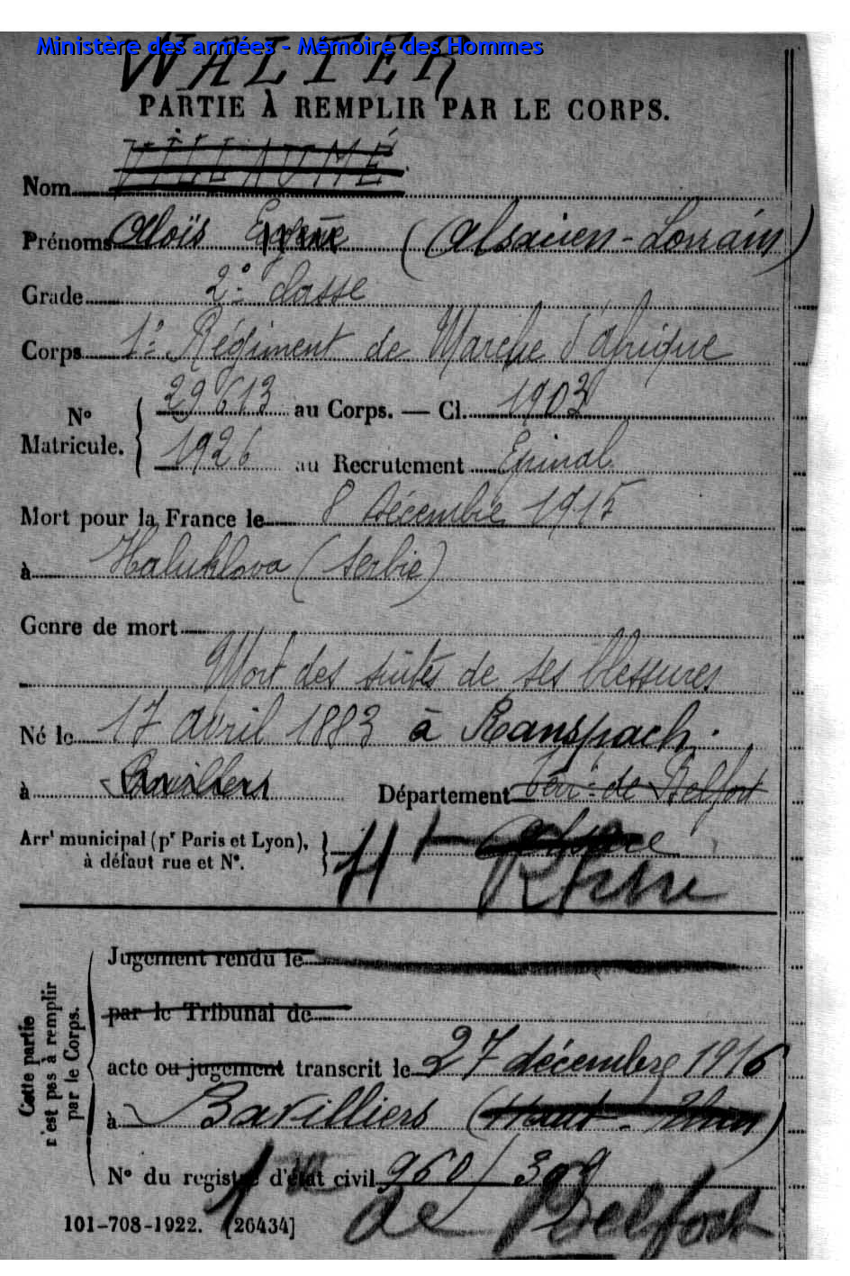 Am 03.12.1942 wurde er als Eisenbahner von seiner Gesellschaft aufgefordert in Deutschland zu arbeiten und wurde zur Deutschen Reichsbahn abkommandiert. Nach einer krankheitshalber Beurlaubung kehrte er zurück nach Frankreich und schliss sich als Kämpfer der 8. Kompagnie der Maquis von Belfort an. Als Gruppenführer der 1. Kompagnie von Etobon wurde er bei einem Gefecht mit einem Deutschen Leutnant am 13.09.1944 schwer verletzt und verstarb am 14.09.1944 |