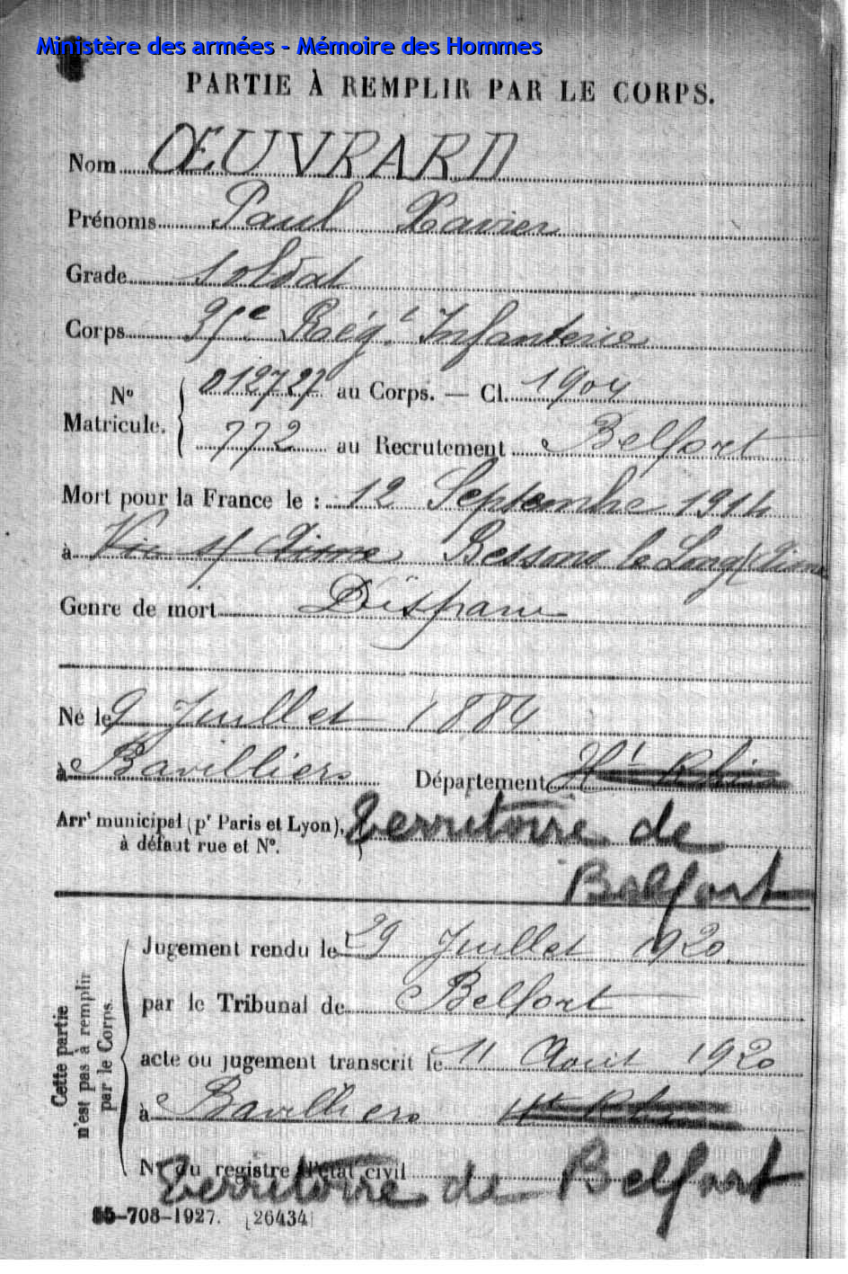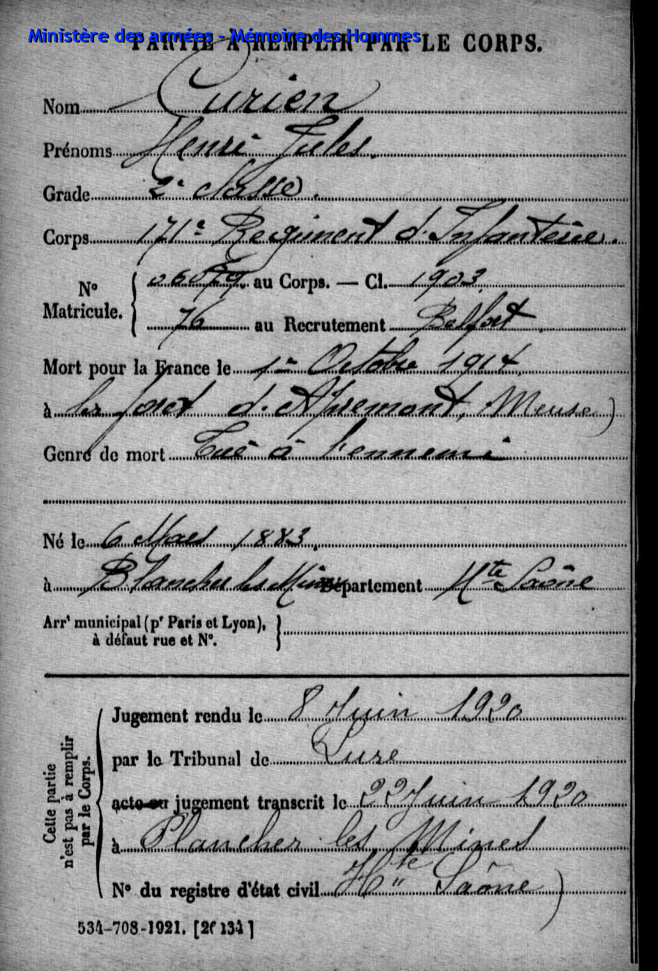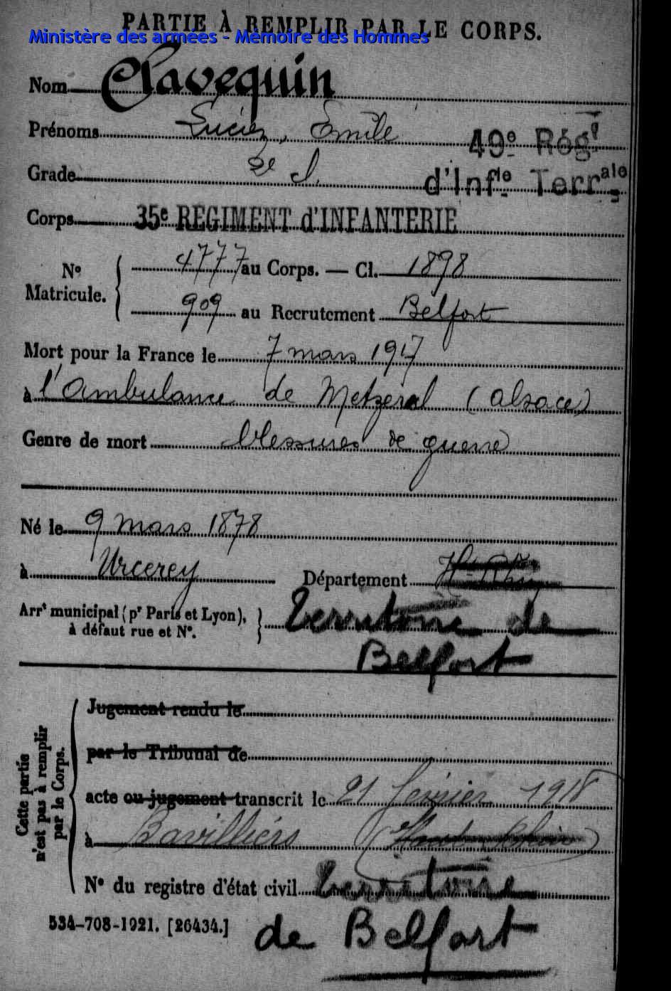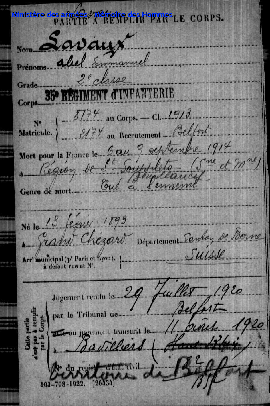 | Aspirant PY Clément Louis Alphonse 14.01.1892 - 10.06.1940 72ème Régiment Régional Verstarb in Belfort (F) |
