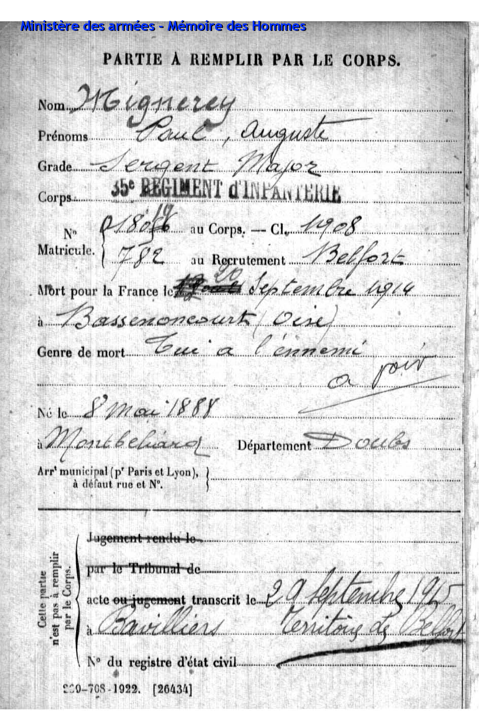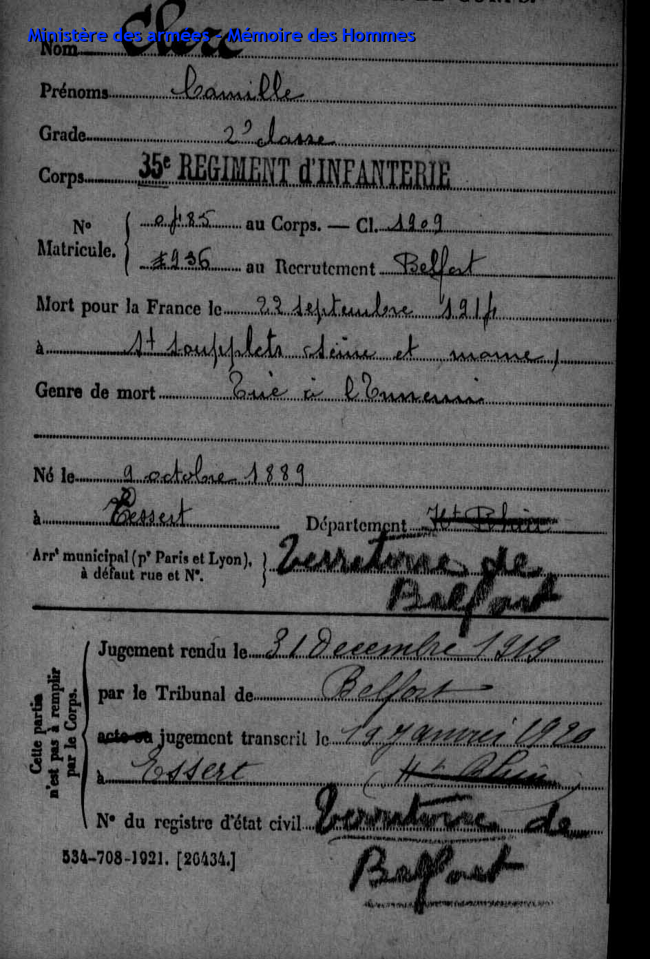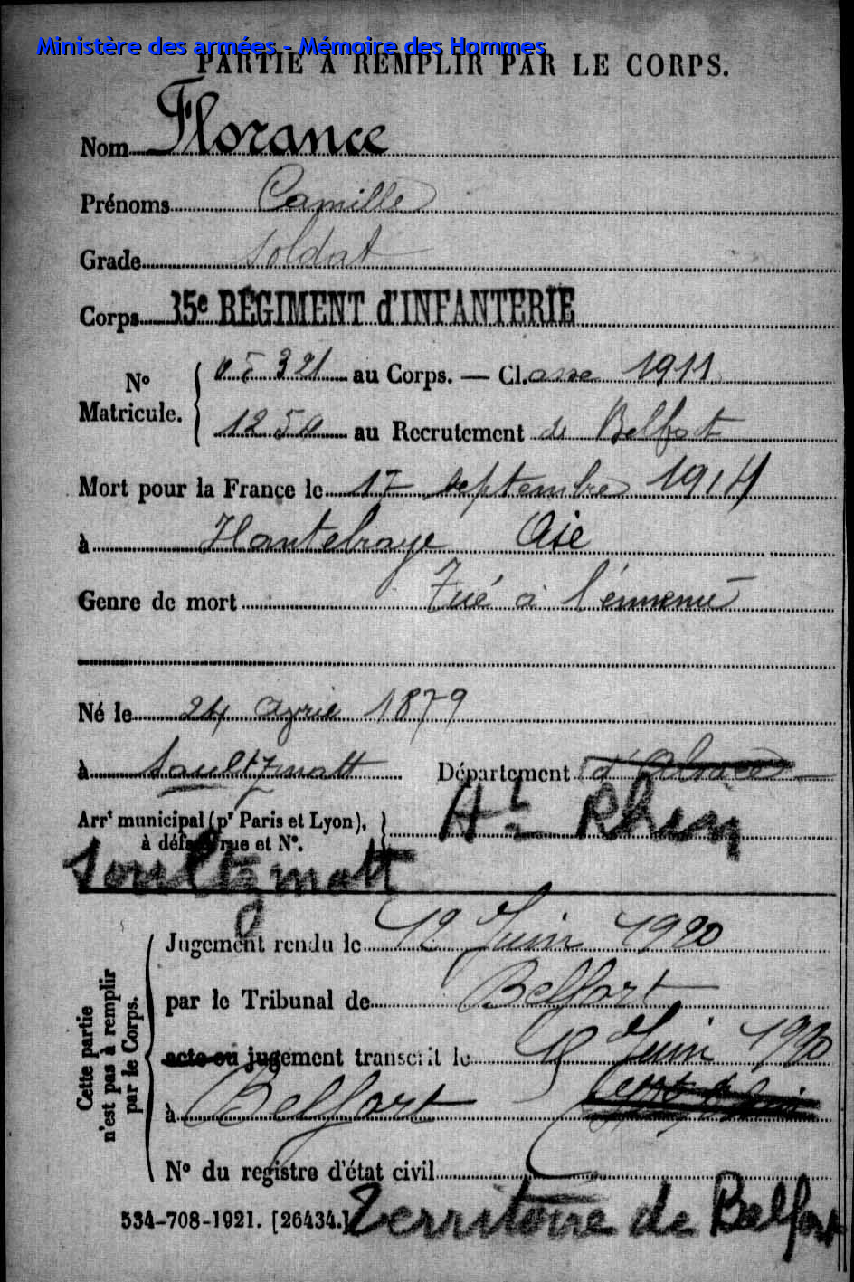 | Soldat FLORANCE Camille 24.04.1879 - 17.09.1914 35ème Régiment d'Infanterie Gefallen in Autreches - Oise (F) |