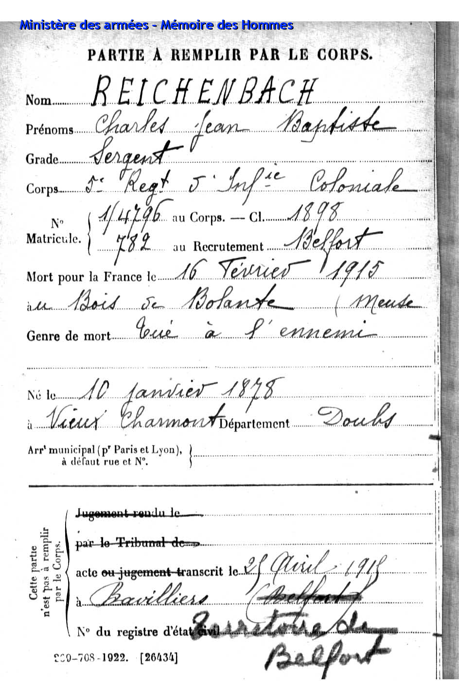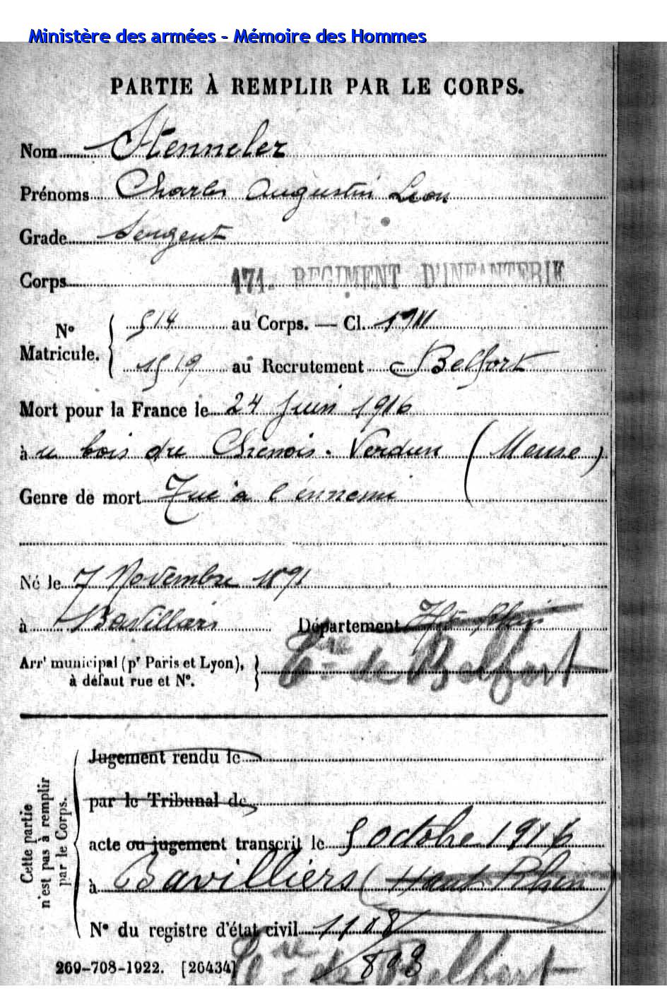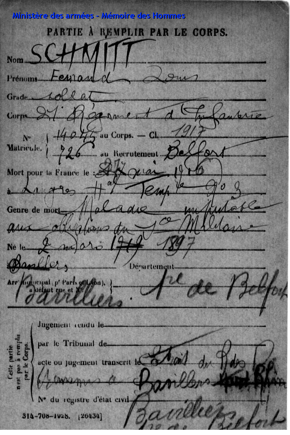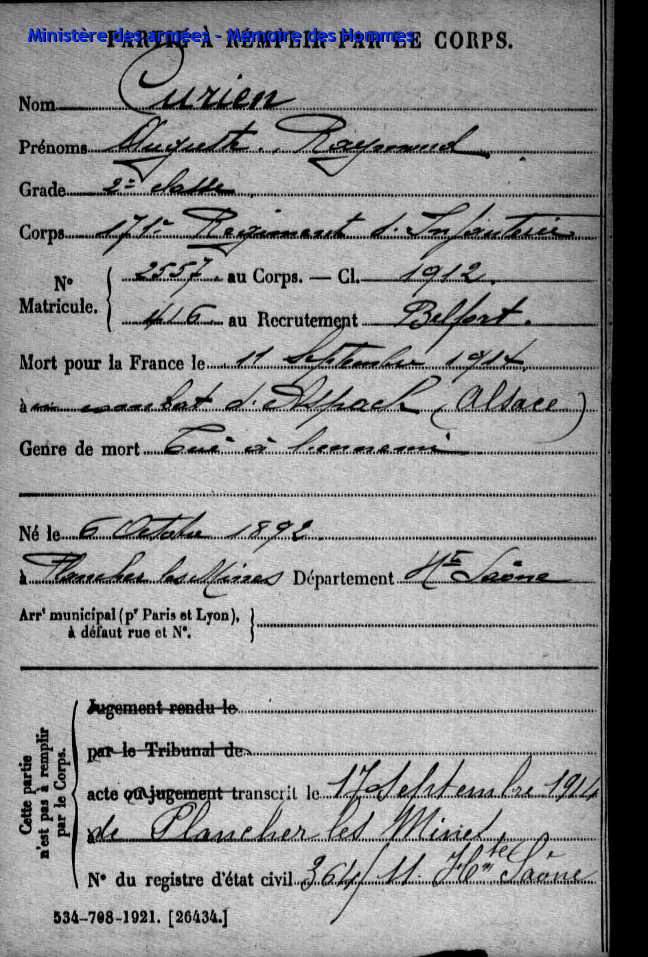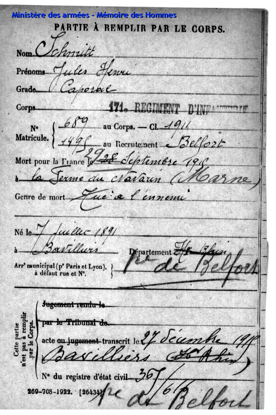 | Caporal SCHMITT Jules Henri 07.07.1891 - 29.09.1915 171ème Régiment d'Infanterie Gefallen in Souain - Marne (F) |