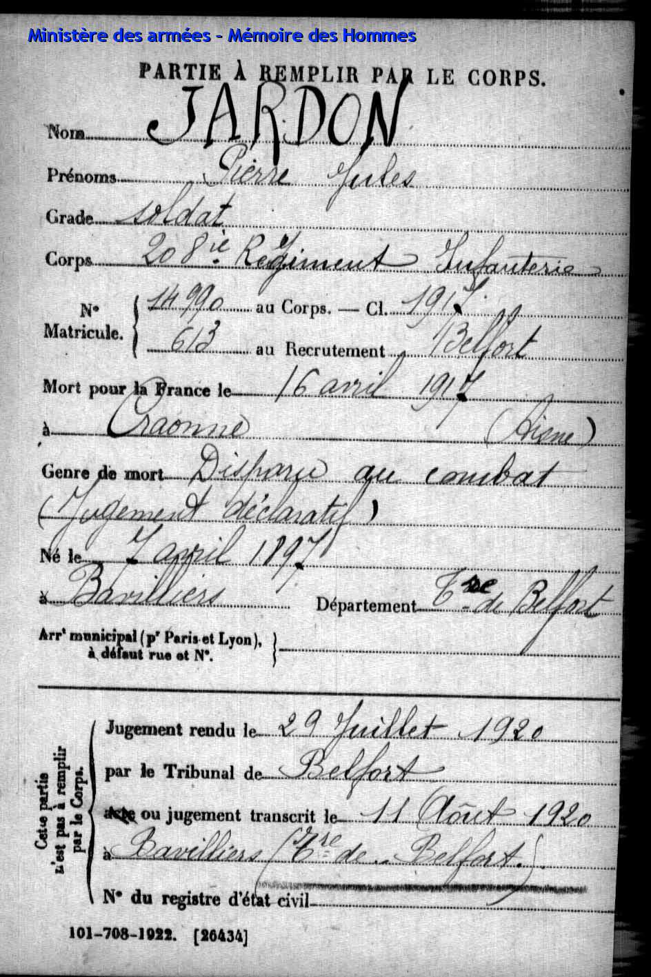 | Soldat JARDON Pierre Jules 07.04.1897 - 16.04.1917 208ème Régiment d'Infanterie Gefallen in Craonne - Aisne (F) Nécropole nationale in Pontavert (F) Grab 4527 |