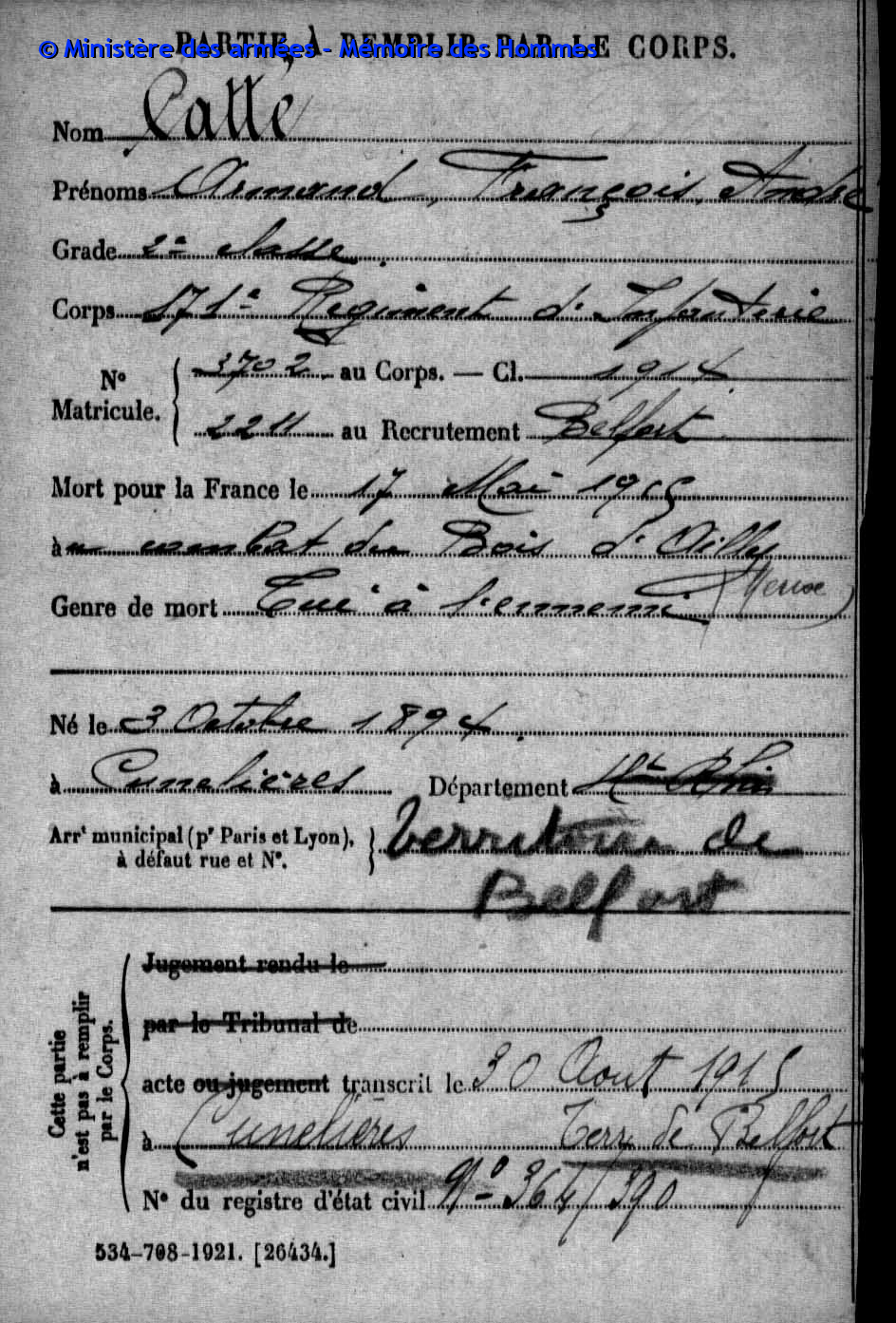 Auf dem Kriegerdenkmal der 2,02 Km2 kleinen Gemeinde mit 338 Einwohner im Departement Territoire de Belfort (F), sind 5 von den 12 Kriegsopfer mit Fabian Coulot verwandt.
