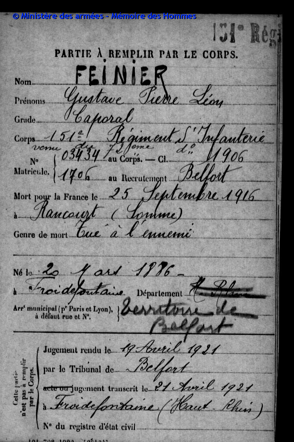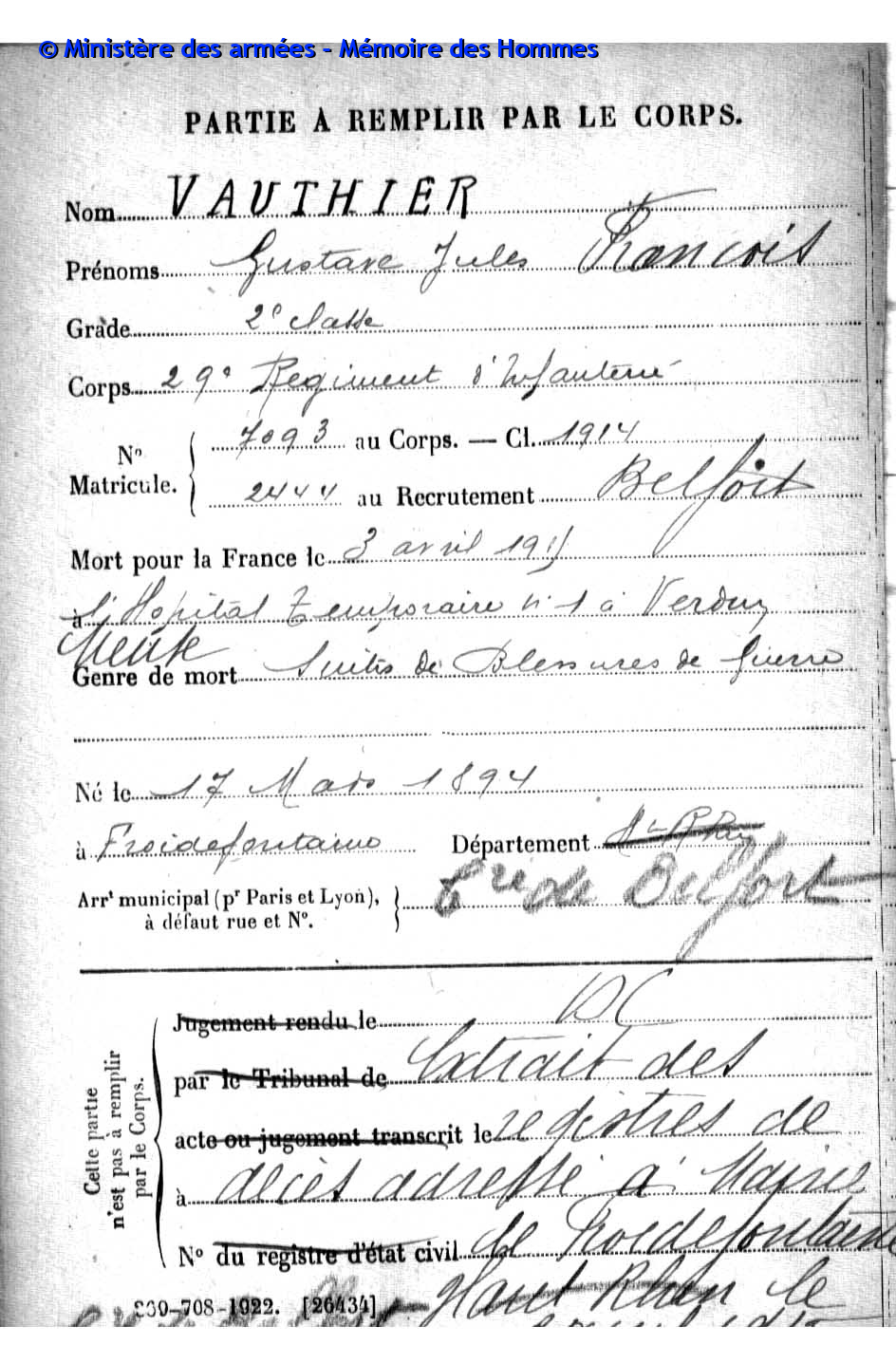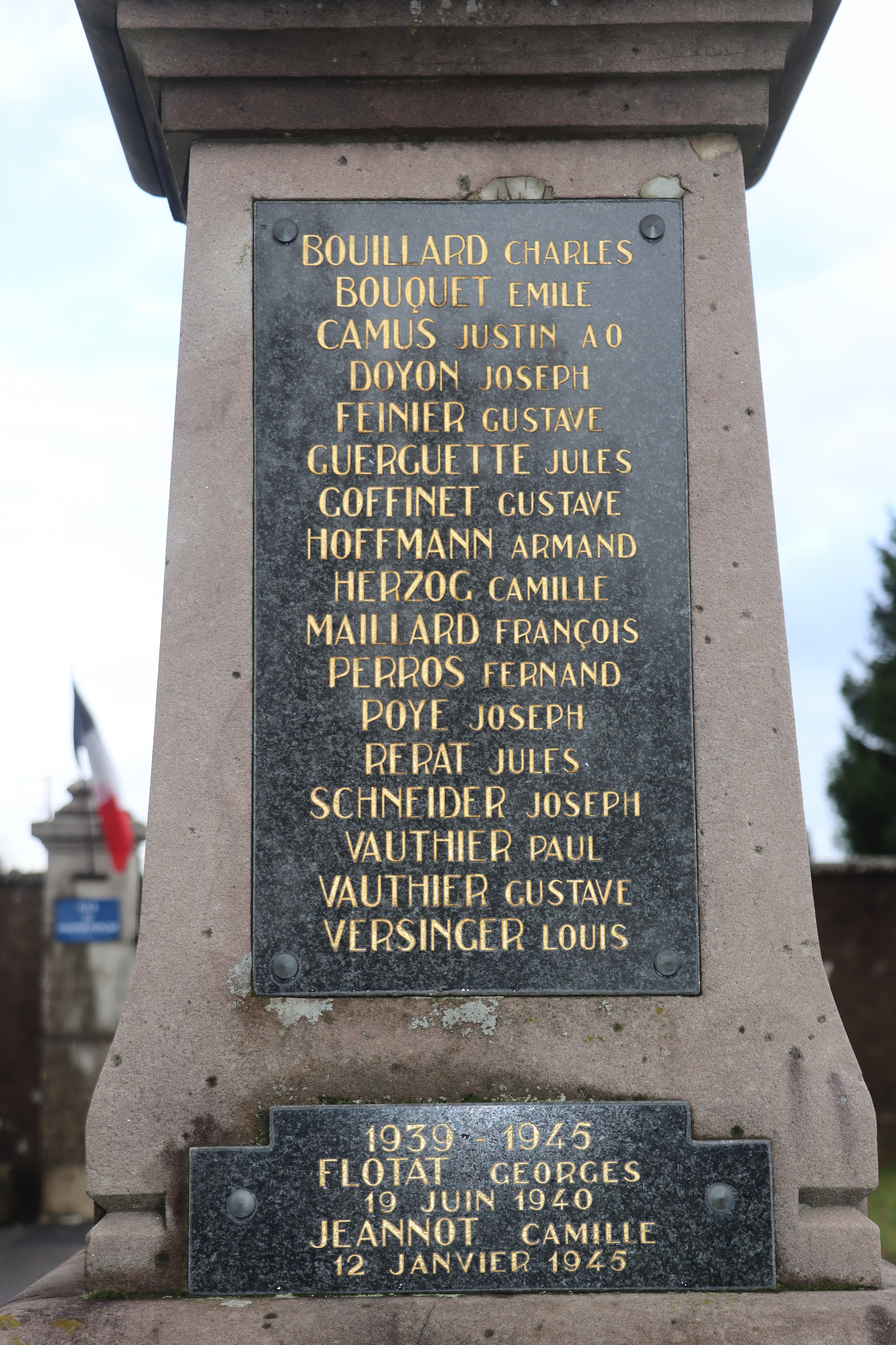 Auf dem Kriegsdenkmal vor dem Friedhof der 4,55 Km2 kleinen Gemeinde mit 472 Einwohner im Departement Territoire de Belfort (F) sind 19 Namen verzeichnet. Bei 6 von den Namen sind keine näheren Angaben bekannt. Von den 19 Soldaten sind 8 mit Fabian Coulot verwandt.
