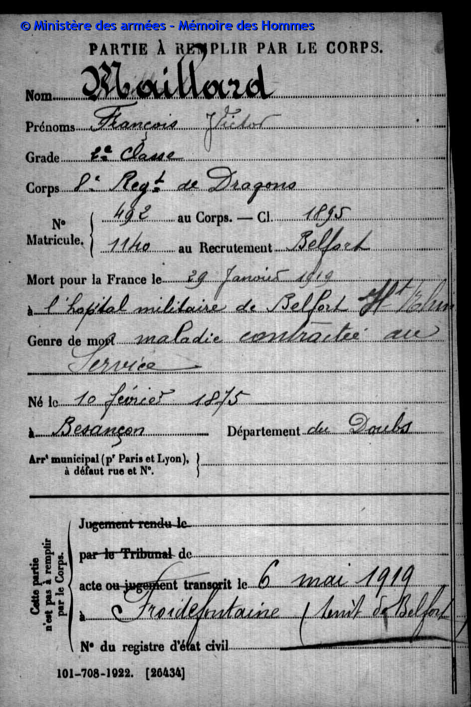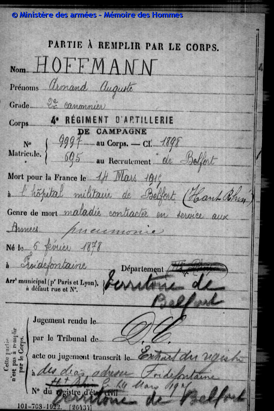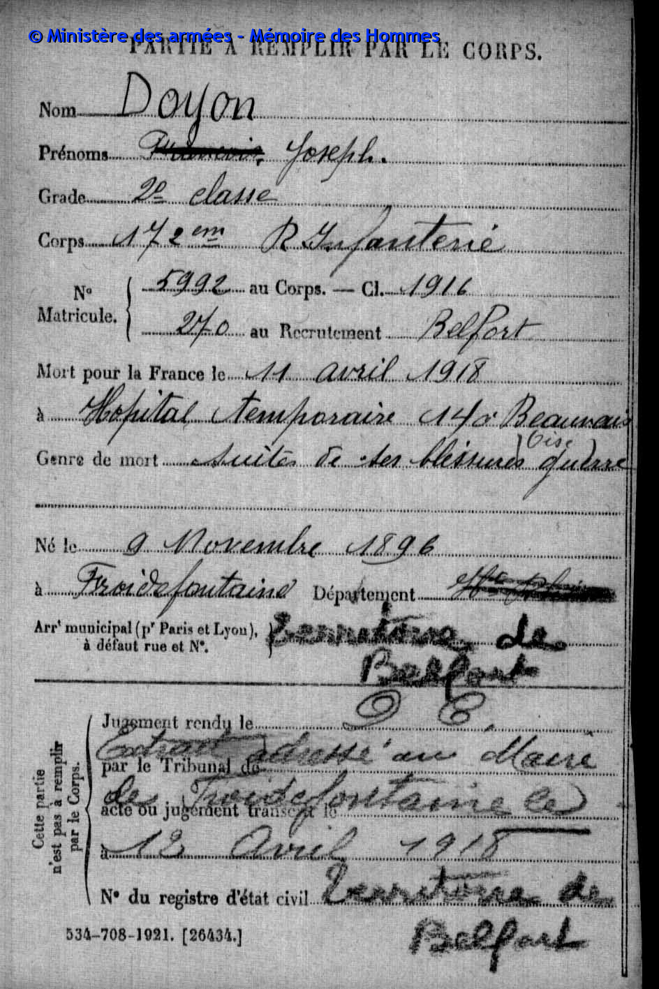 Auf dem Kriegsdenkmal vor dem Friedhof der 4,55 Km2 kleinen Gemeinde mit 472 Einwohner im Departement Territoire de Belfort (F) sind 19 Namen verzeichnet. Bei 6 von den Namen sind keine näheren Angaben bekannt. Von den 19 Soldaten sind 8 mit Fabian Coulot verwandt.