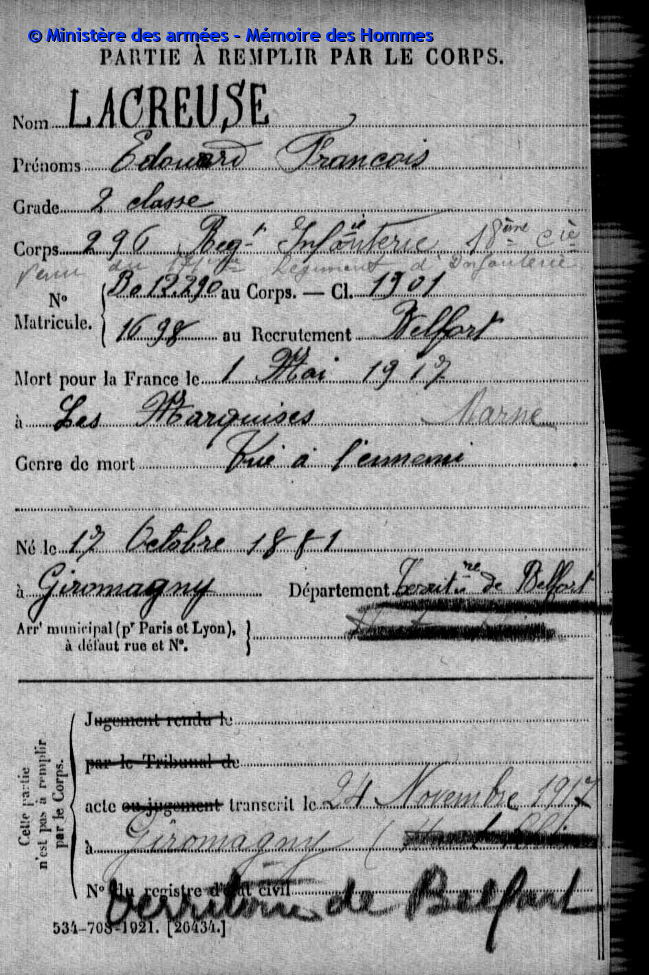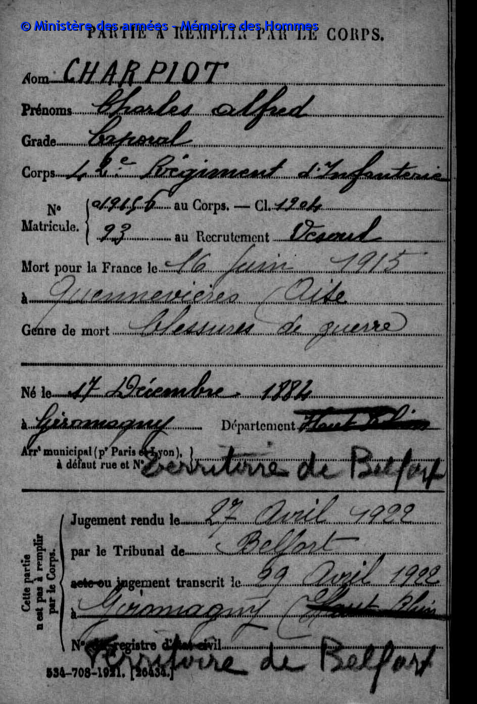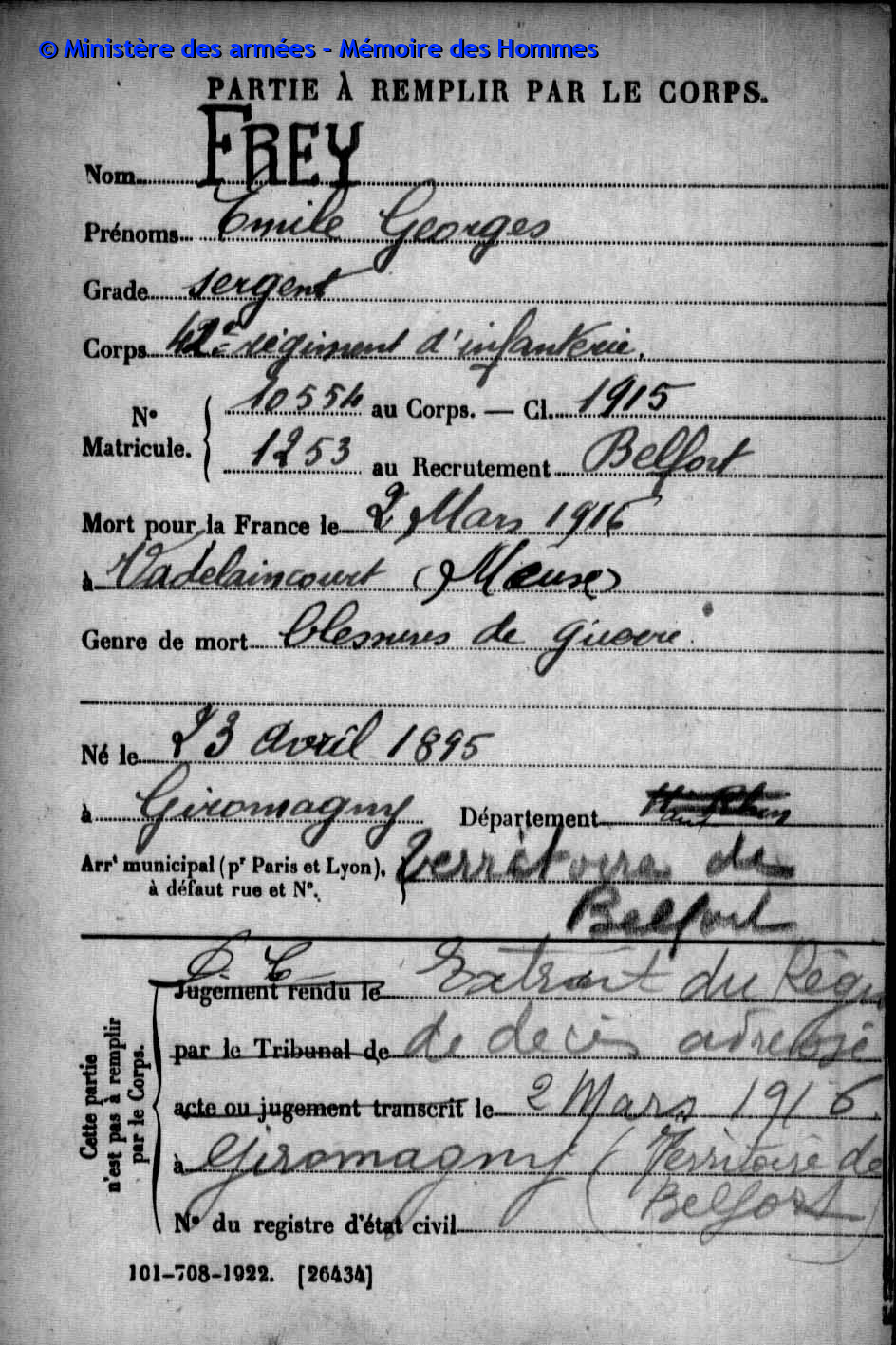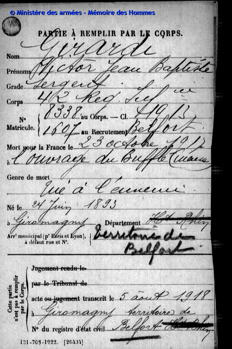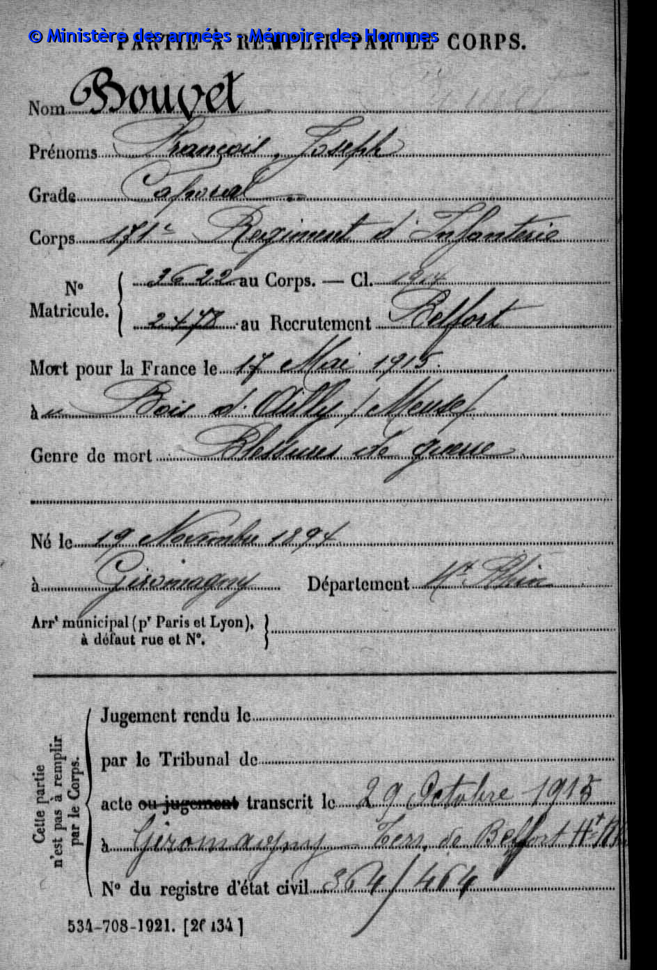 | Sergent GIRARDEY François Edouard 07.03.1885 - 21.04.1916 45ème Bataillon de Chasseurs à Pied Gefallen in Coeuvres - Aisne (F) |