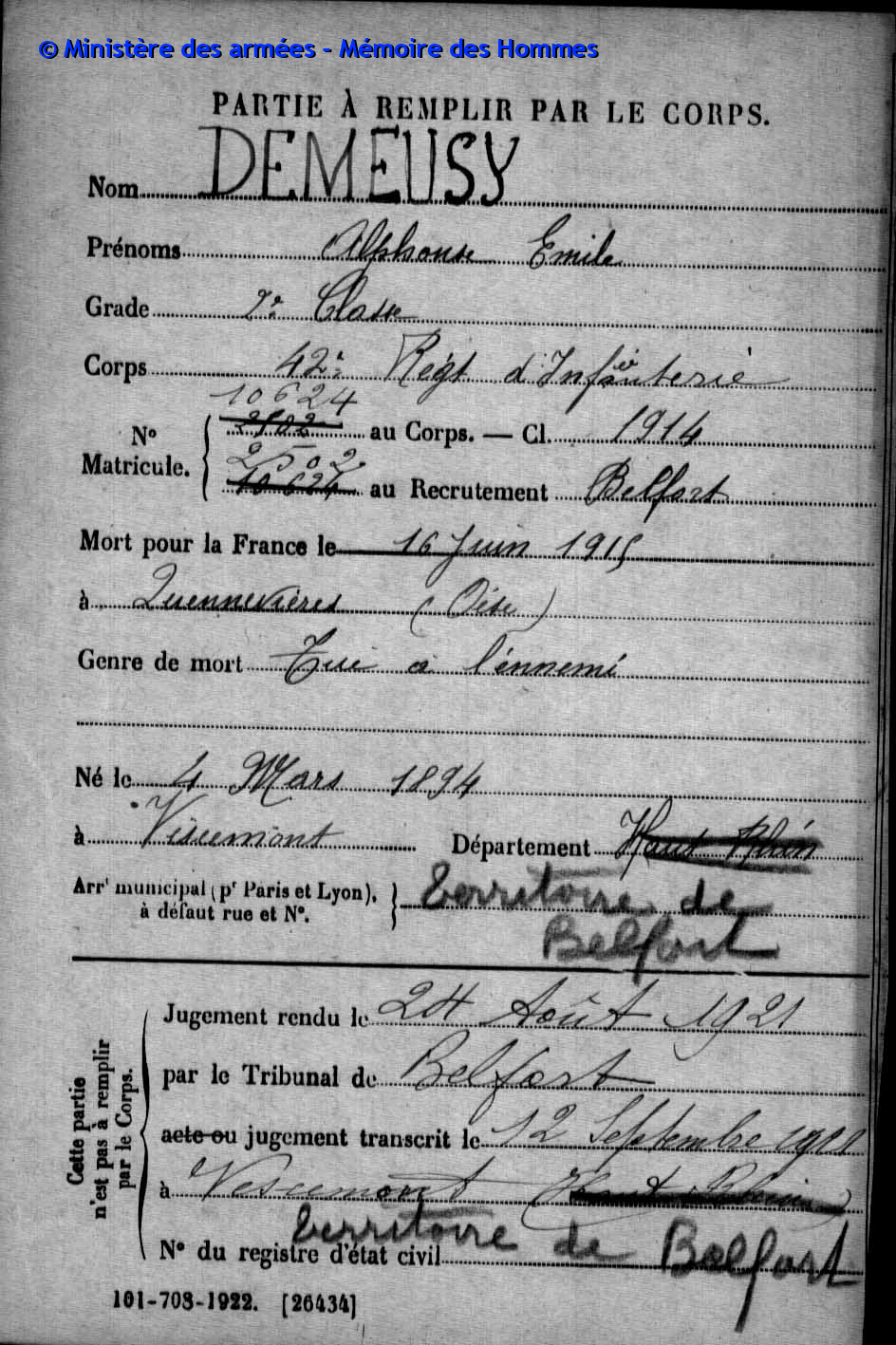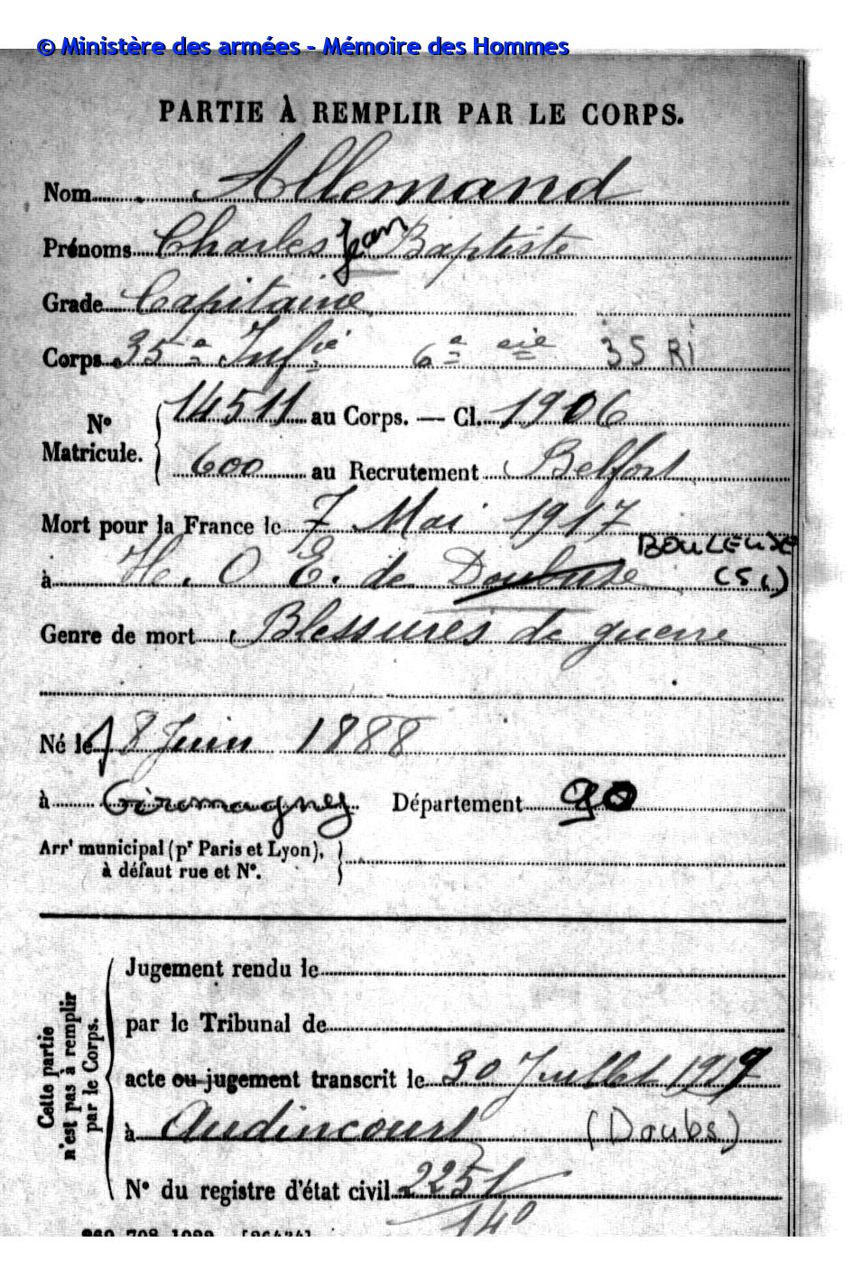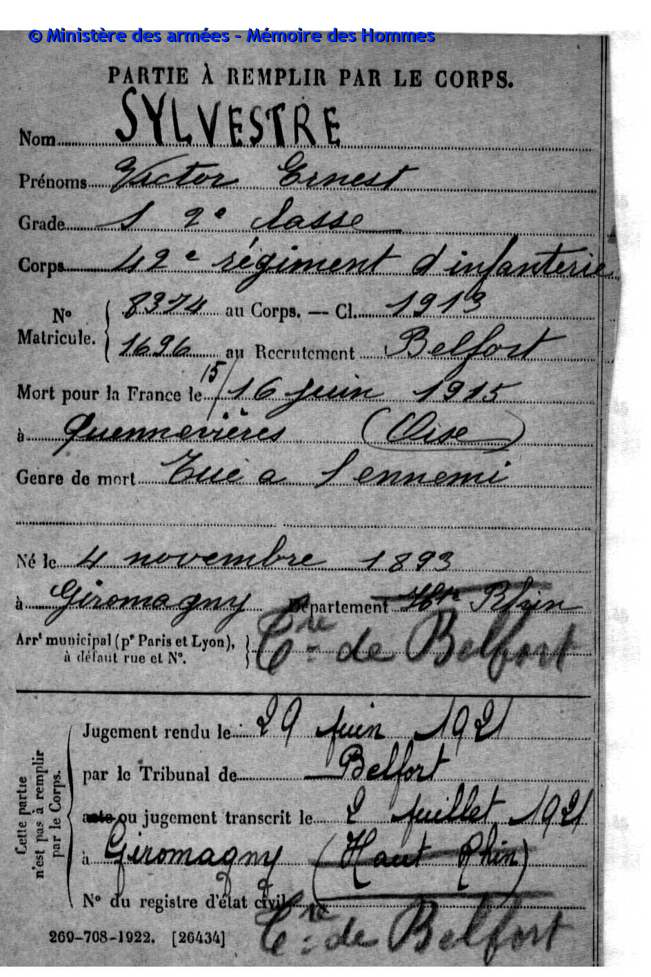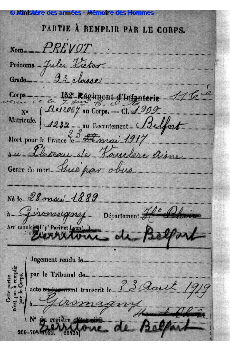 | Sergent GIRARDEY François Edouard 07.03.1885 - 21.04.1916 45ème Bataillon de Chasseurs à Pied Gefallen in Coeuvres - Aisne (F) |