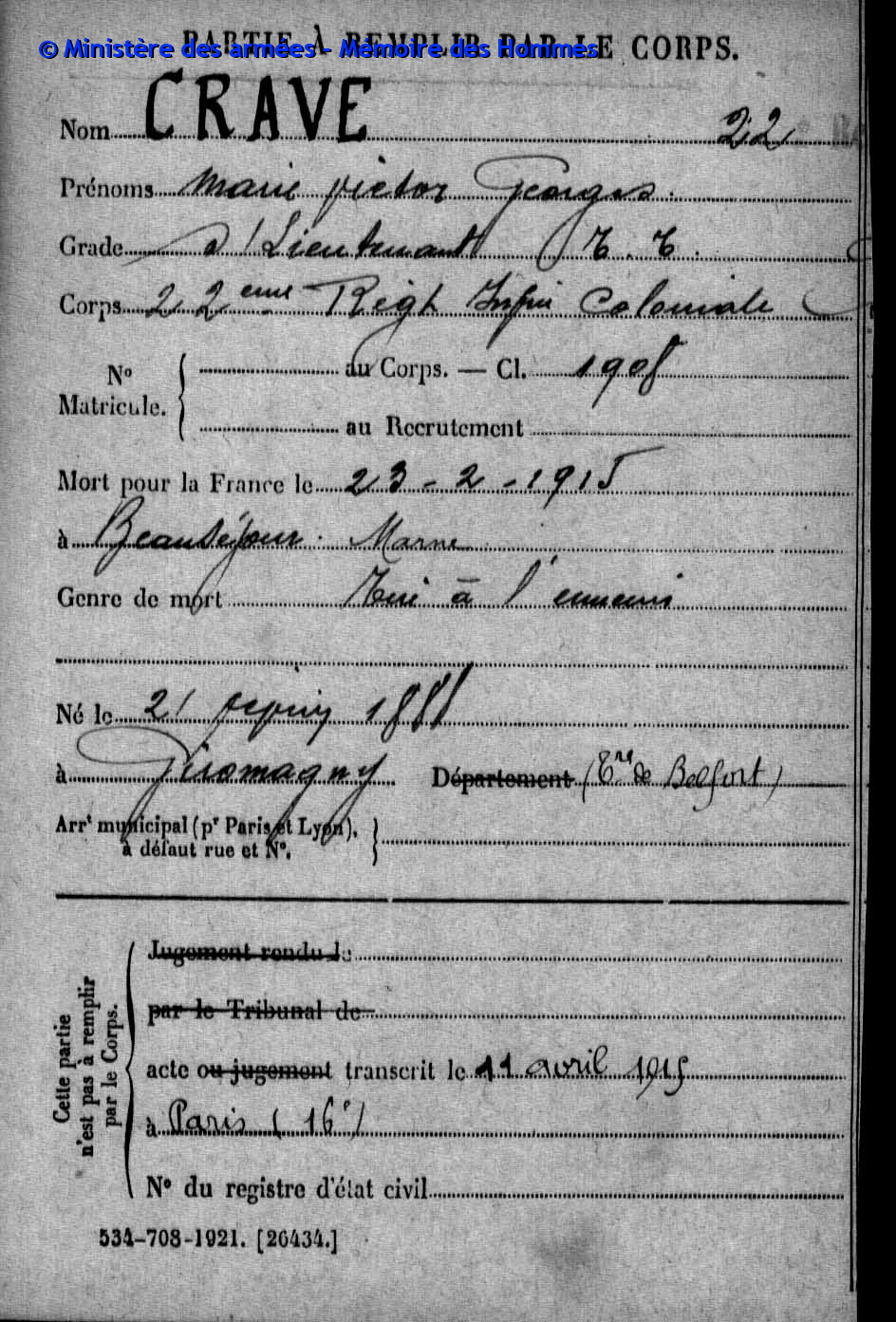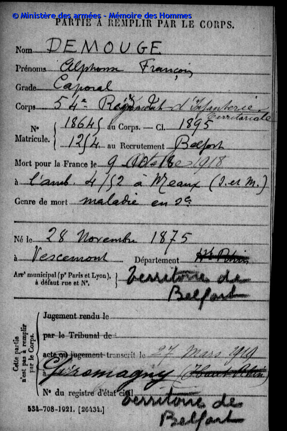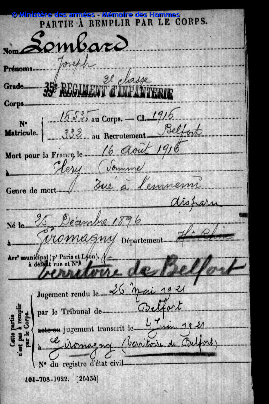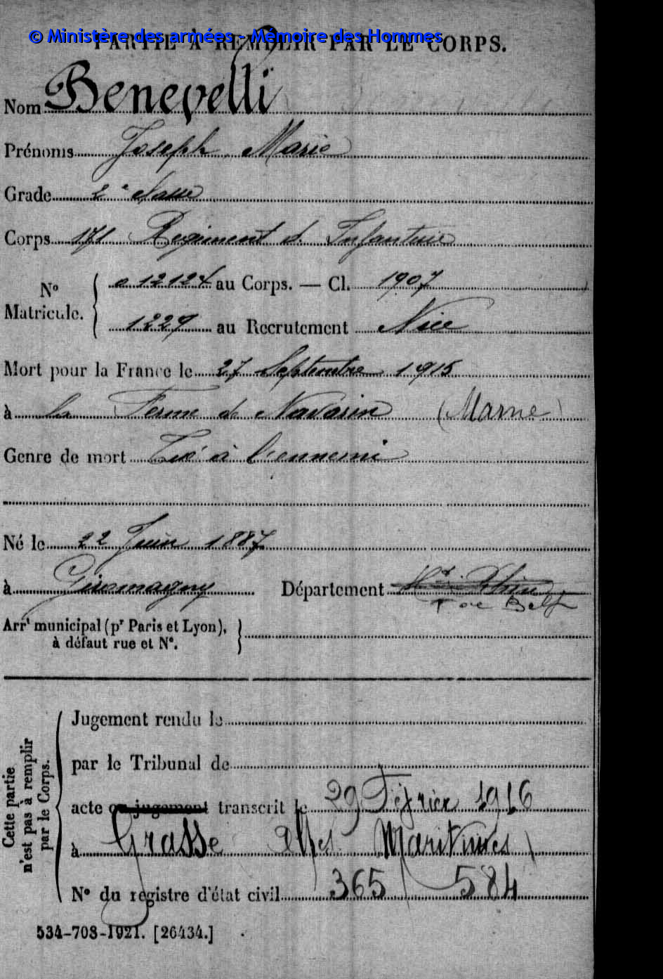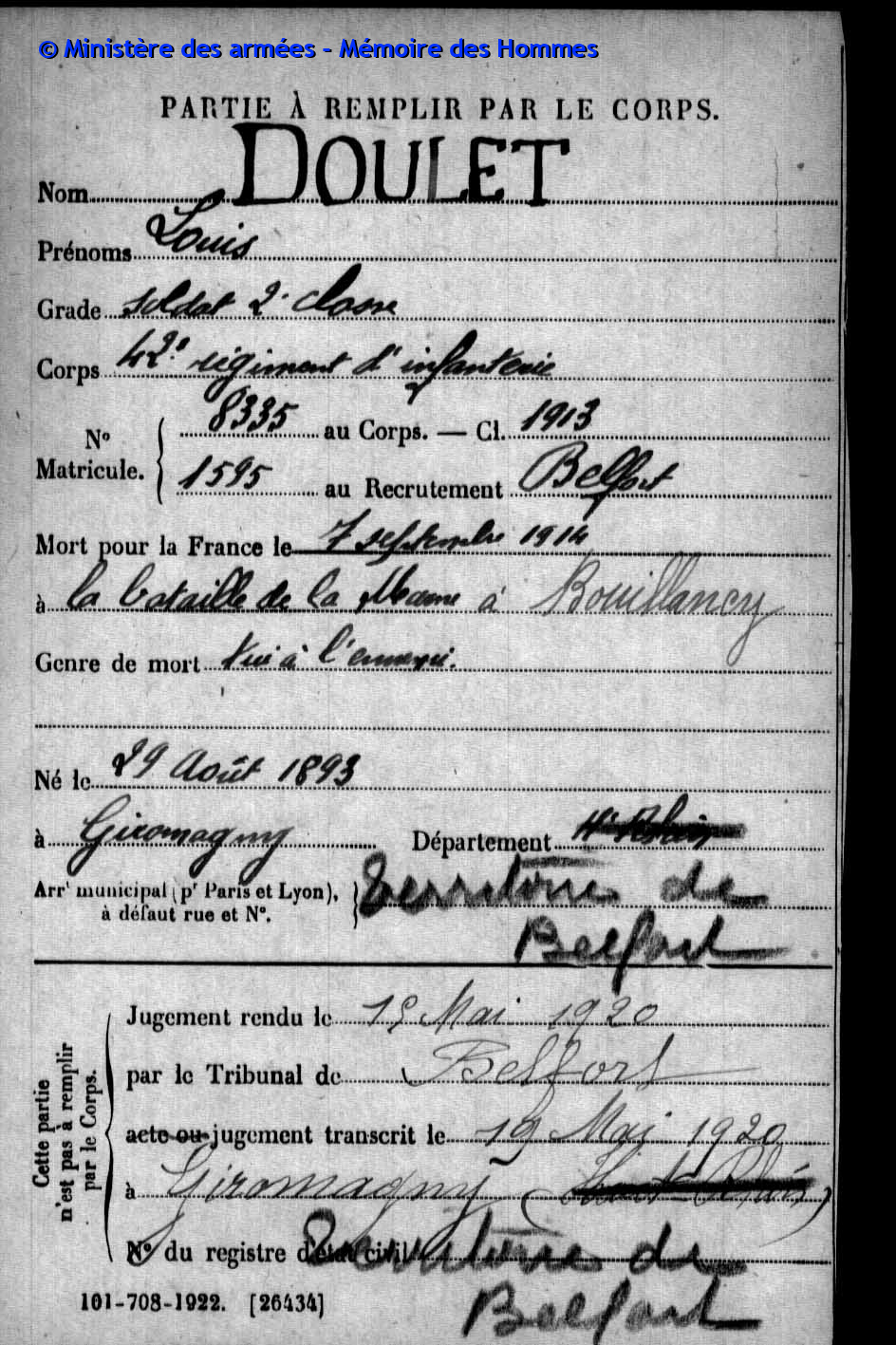 | Sergent GIRARDEY François Edouard 07.03.1885 - 21.04.1916 45ème Bataillon de Chasseurs à Pied Gefallen in Coeuvres - Aisne (F) |