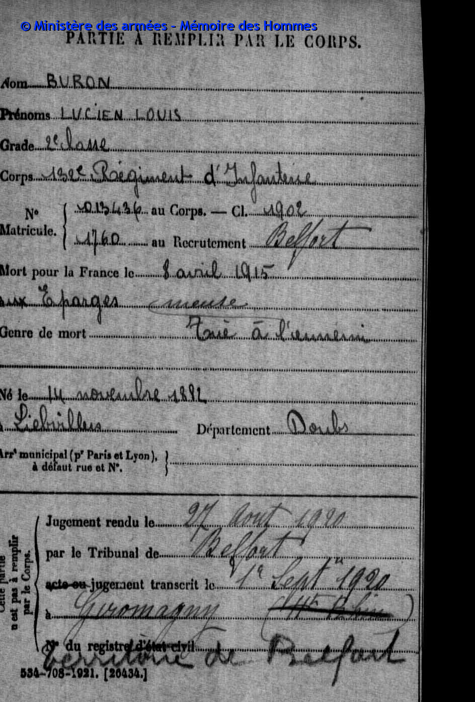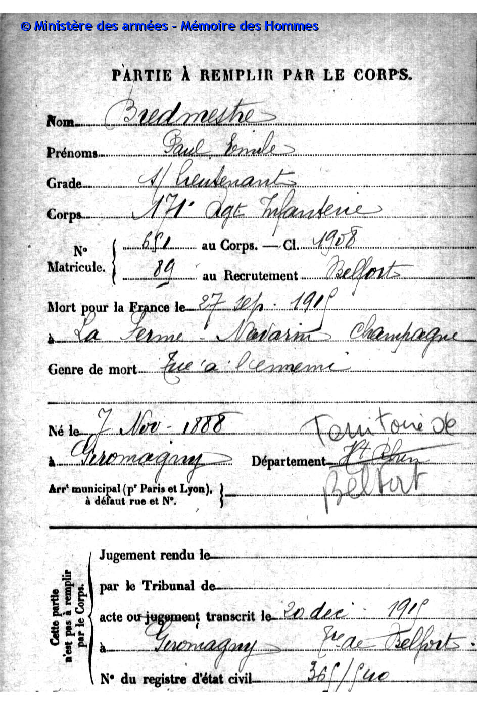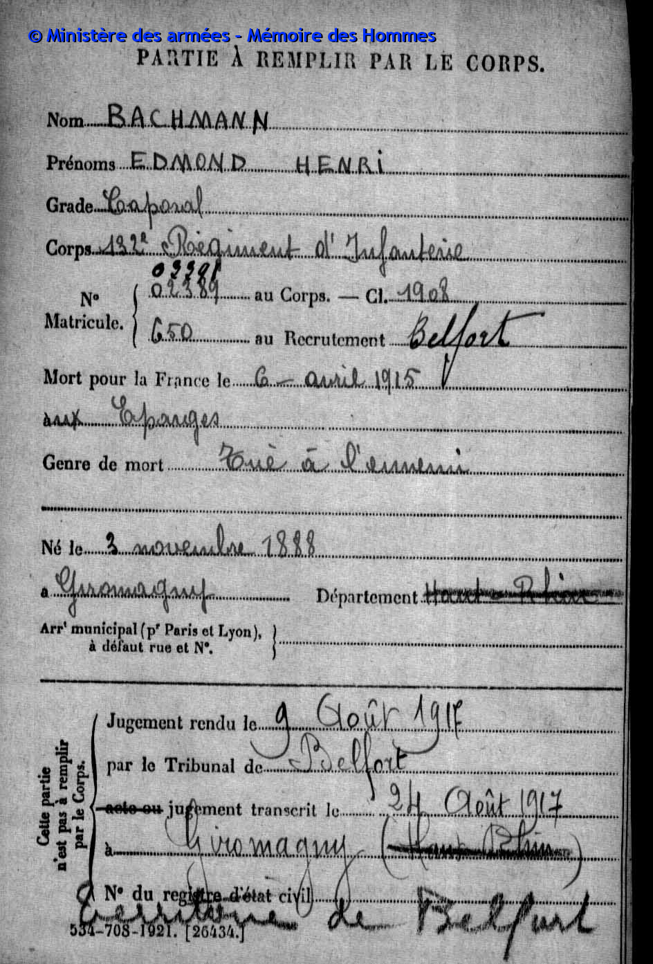 | Caporal BACHMANN Edmond Henri 03.11.1888 - 06.04.1915 132ème Régiment d'Infanterie Gefallen in Les Eparges - Meuse (F) |