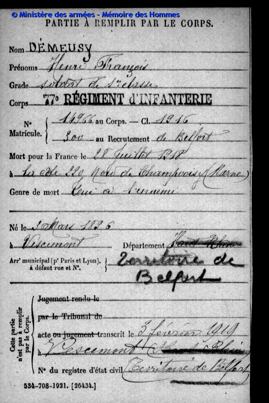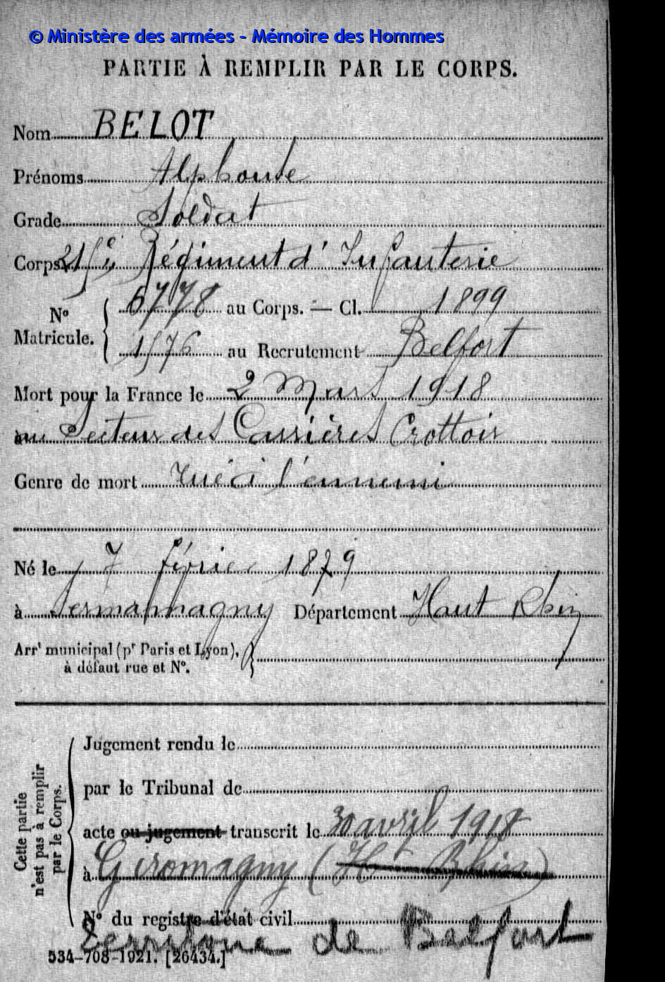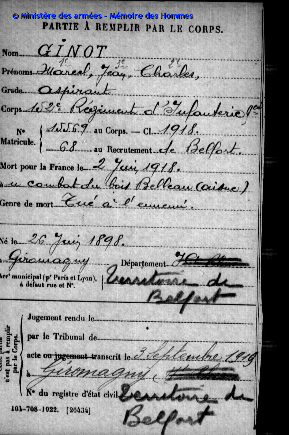 | Aspirant GINOT Marcel Charles Jean 26.06.1898 - 02.06.1918 152ème Régiment d'Infanterie 9ème Compagnie (Rote Teufel aus Colmar / F) Gefallen in Belleau - Aisne (F) |