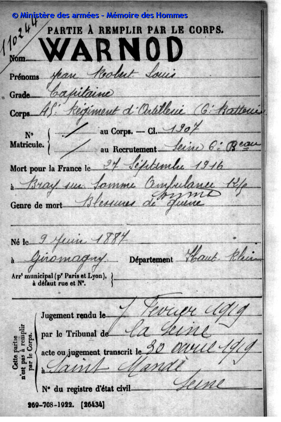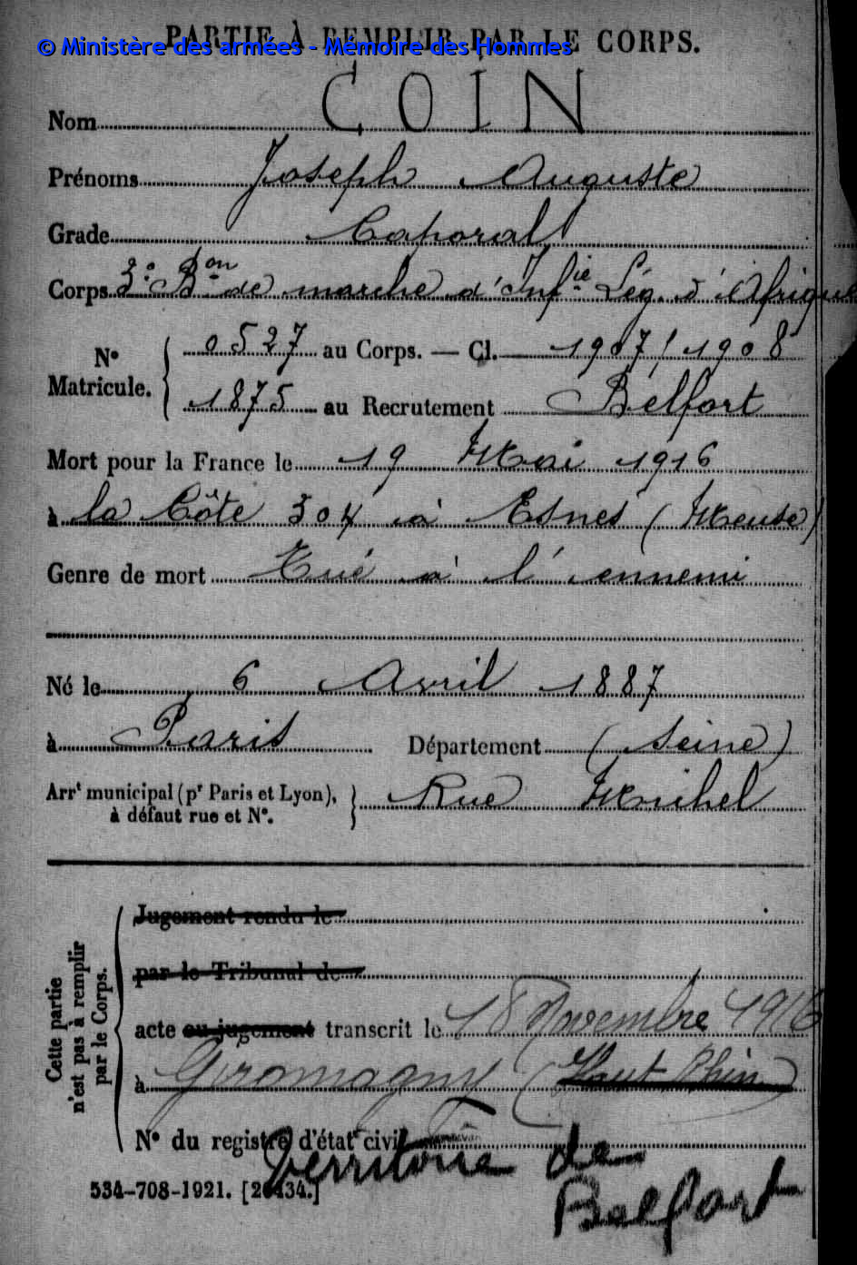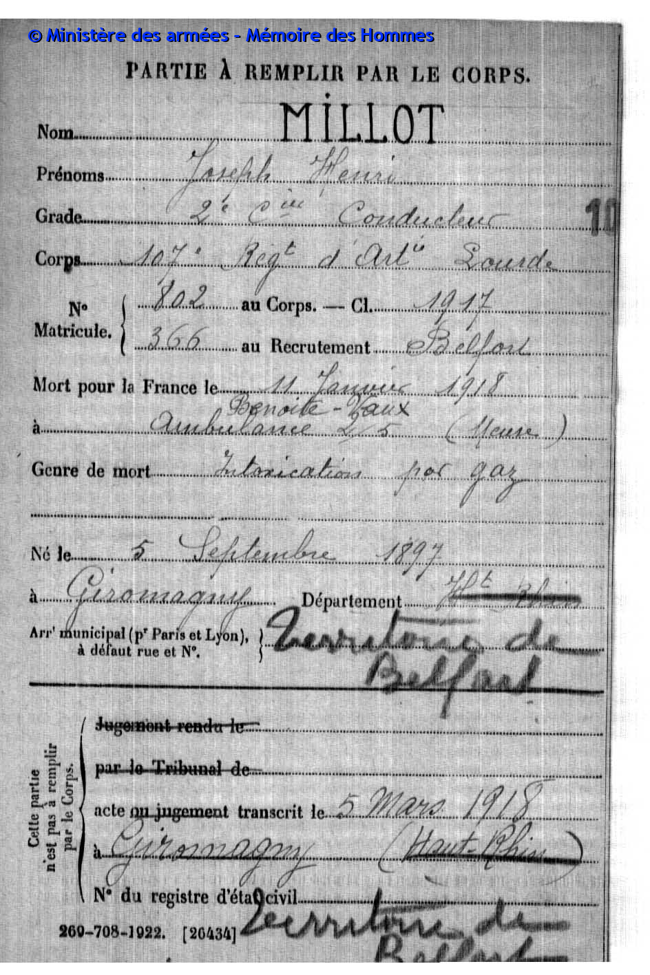 | Aspirant GINOT Marcel Charles Jean 26.06.1898 - 02.06.1918 152ème Régiment d'Infanterie 9ème Compagnie (Rote Teufel aus Colmar / F) Gefallen in Belleau - Aisne (F) |
