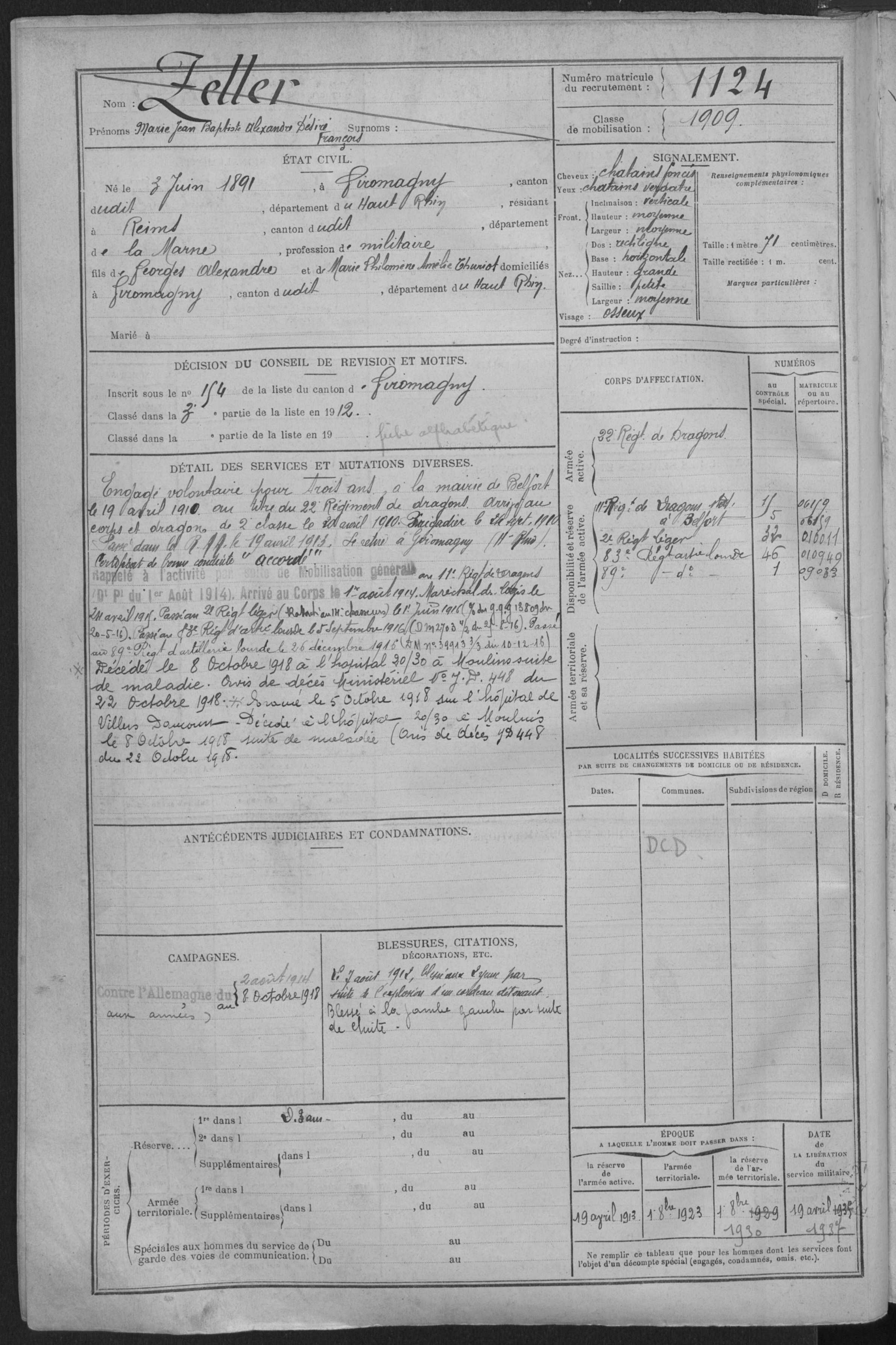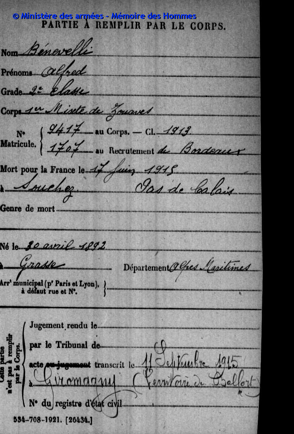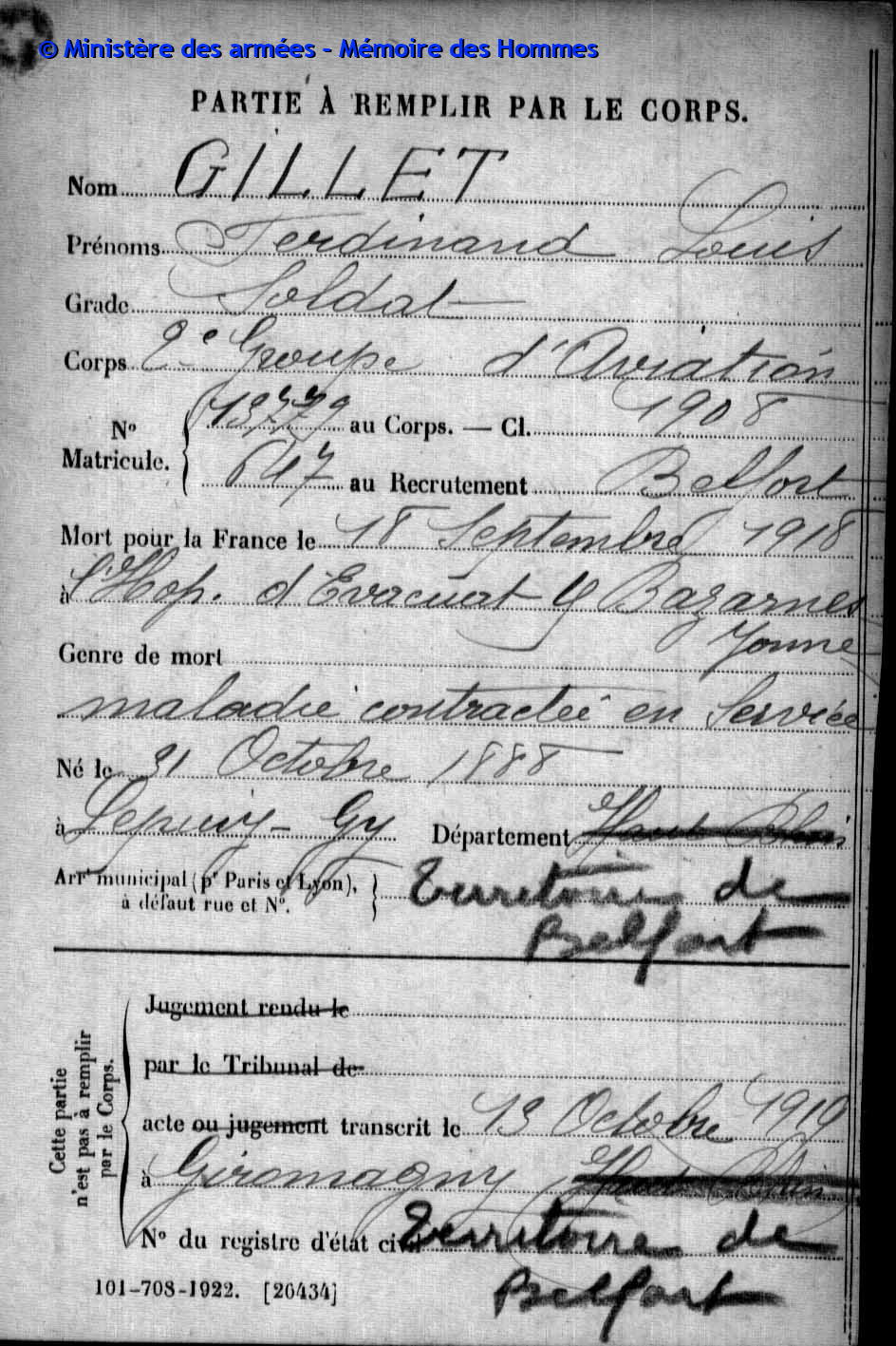 | Soldat GILLET Ferdinand Louis 31.10.1888 - 18.09.1918 2ème Groupe d'Aviation Verstarb durch Krankheit im Hôpital d'évacuation No. 15 in Bazarnbes - Yonne (F) |
