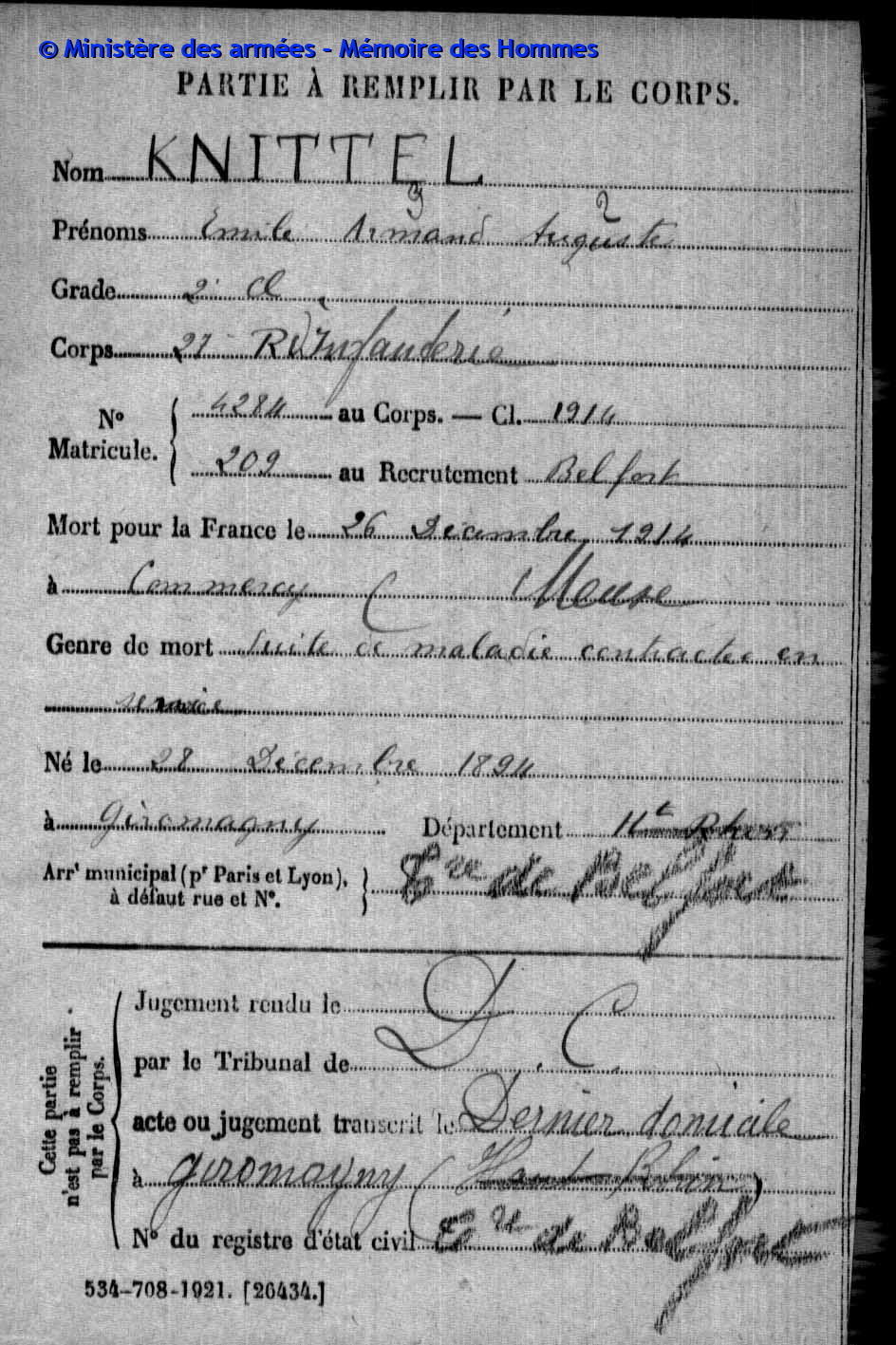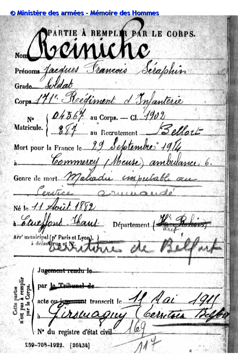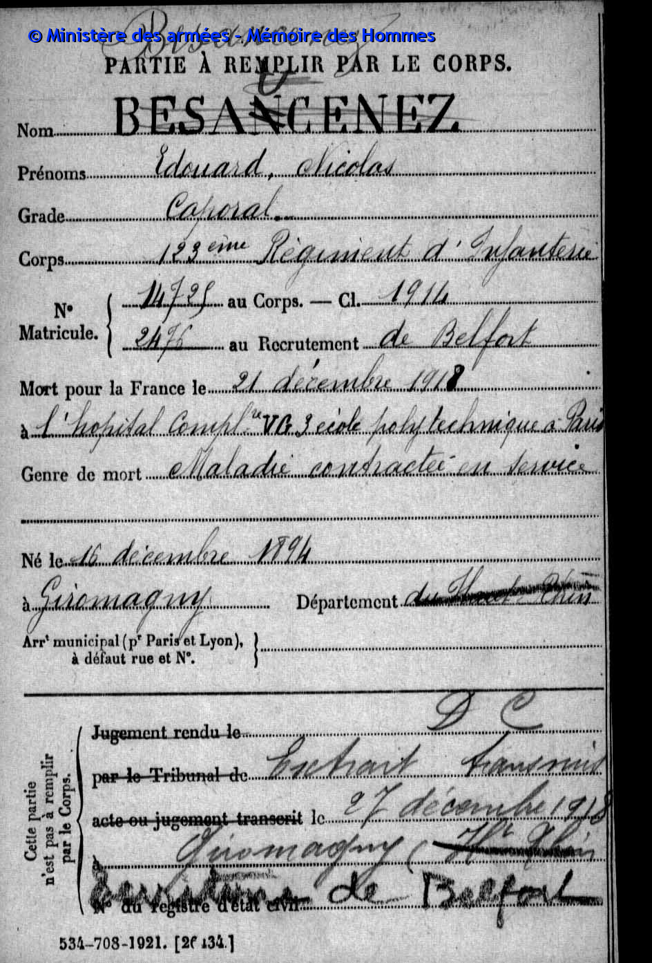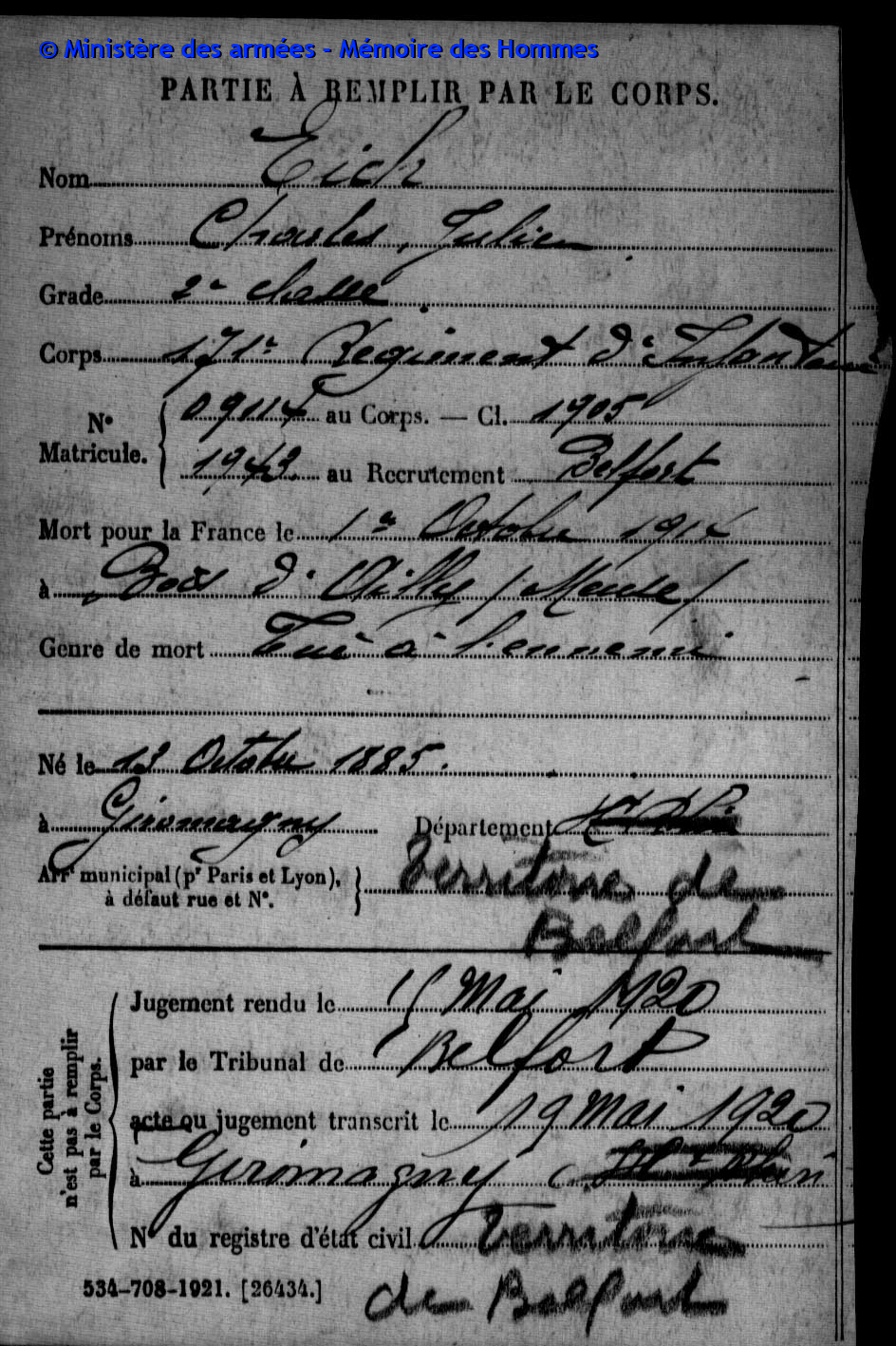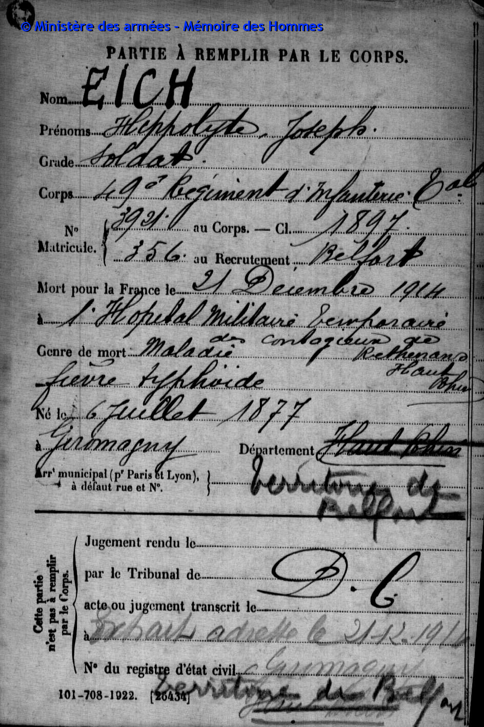 | Soldat EICH Hippolyte Joseph 06.07.1877 - 21.12.1914 49ème Régiment d'Infanterie Verstarb durch Krankheit im Hôpital temporaire in Belfort (F) |