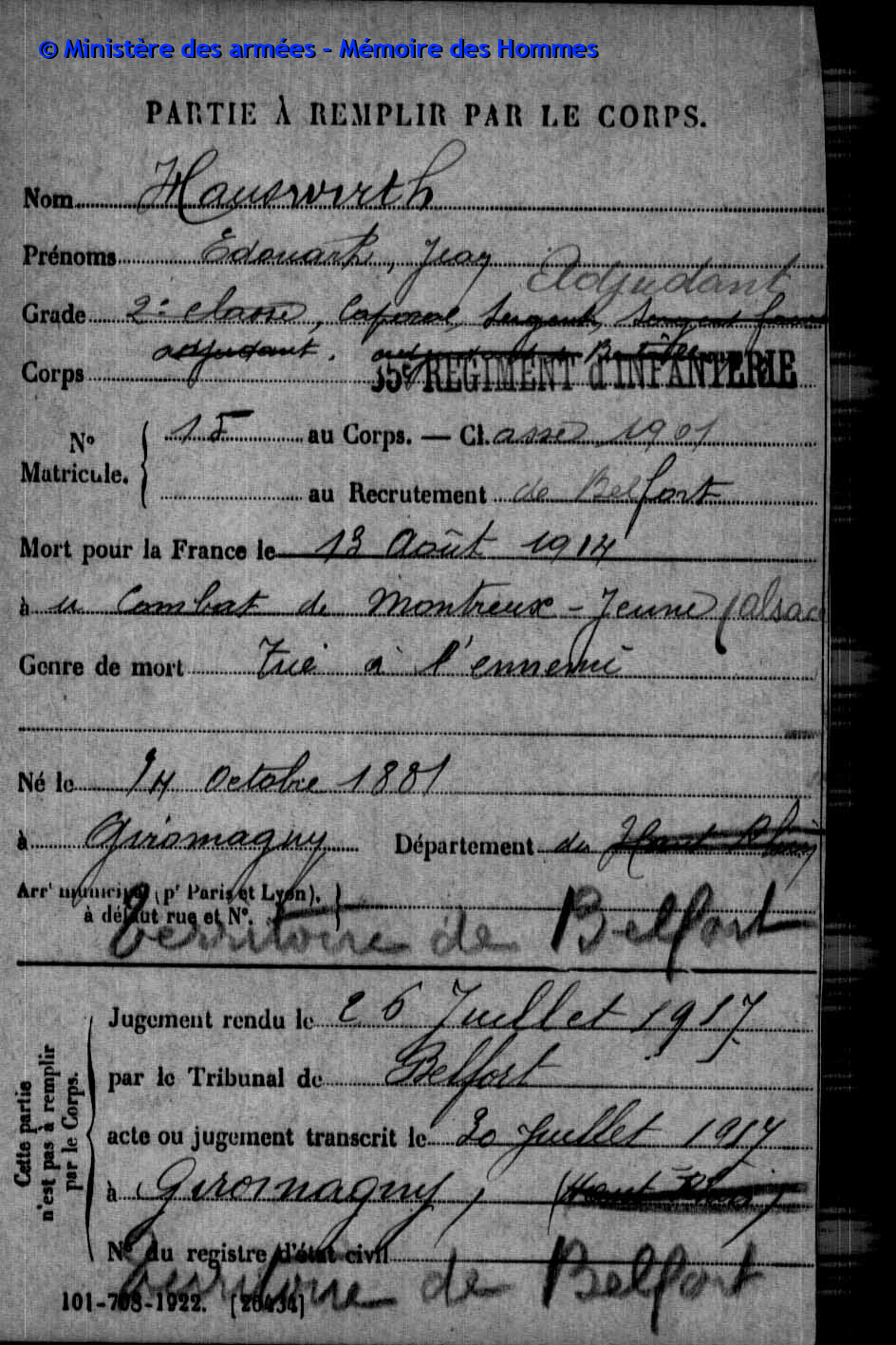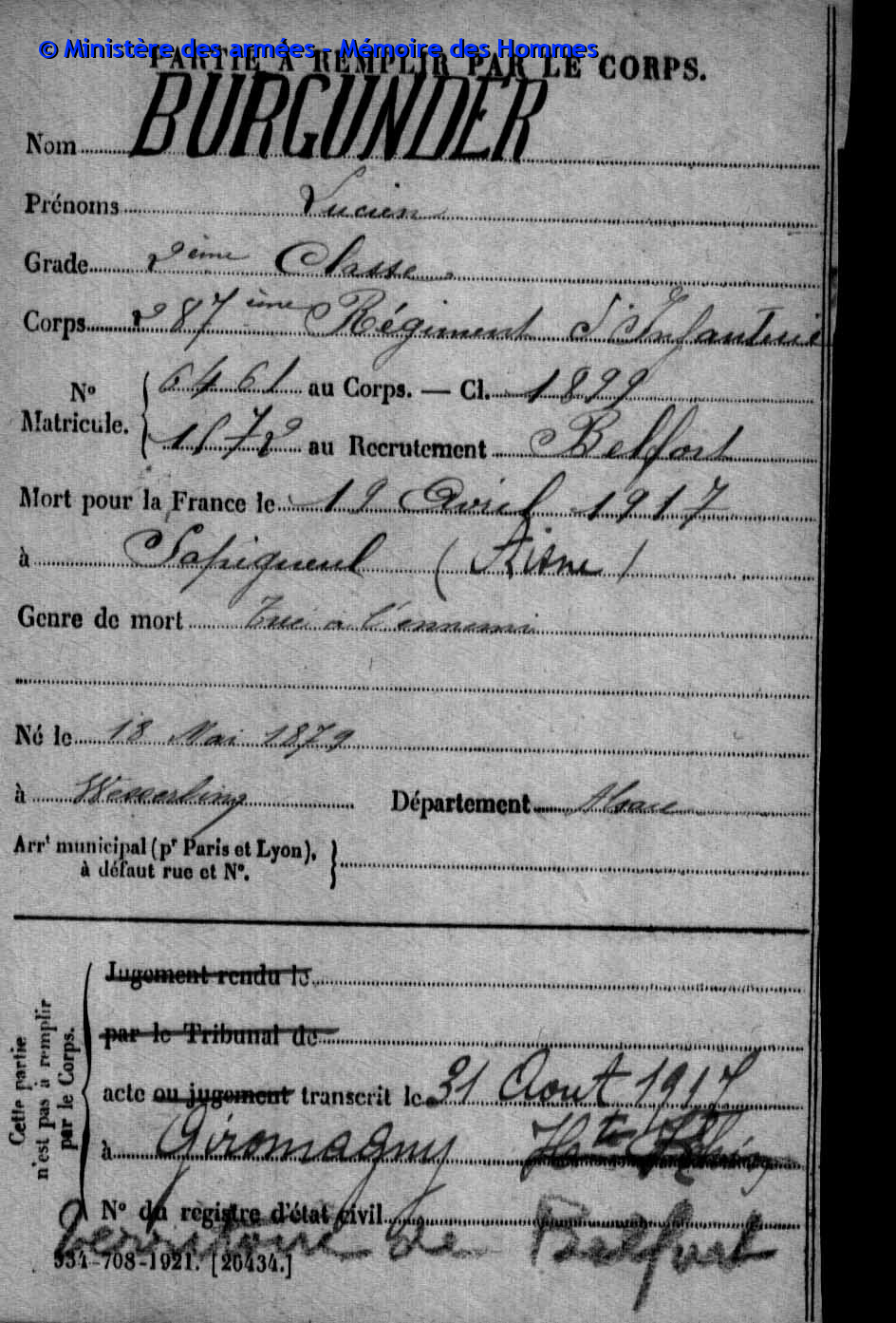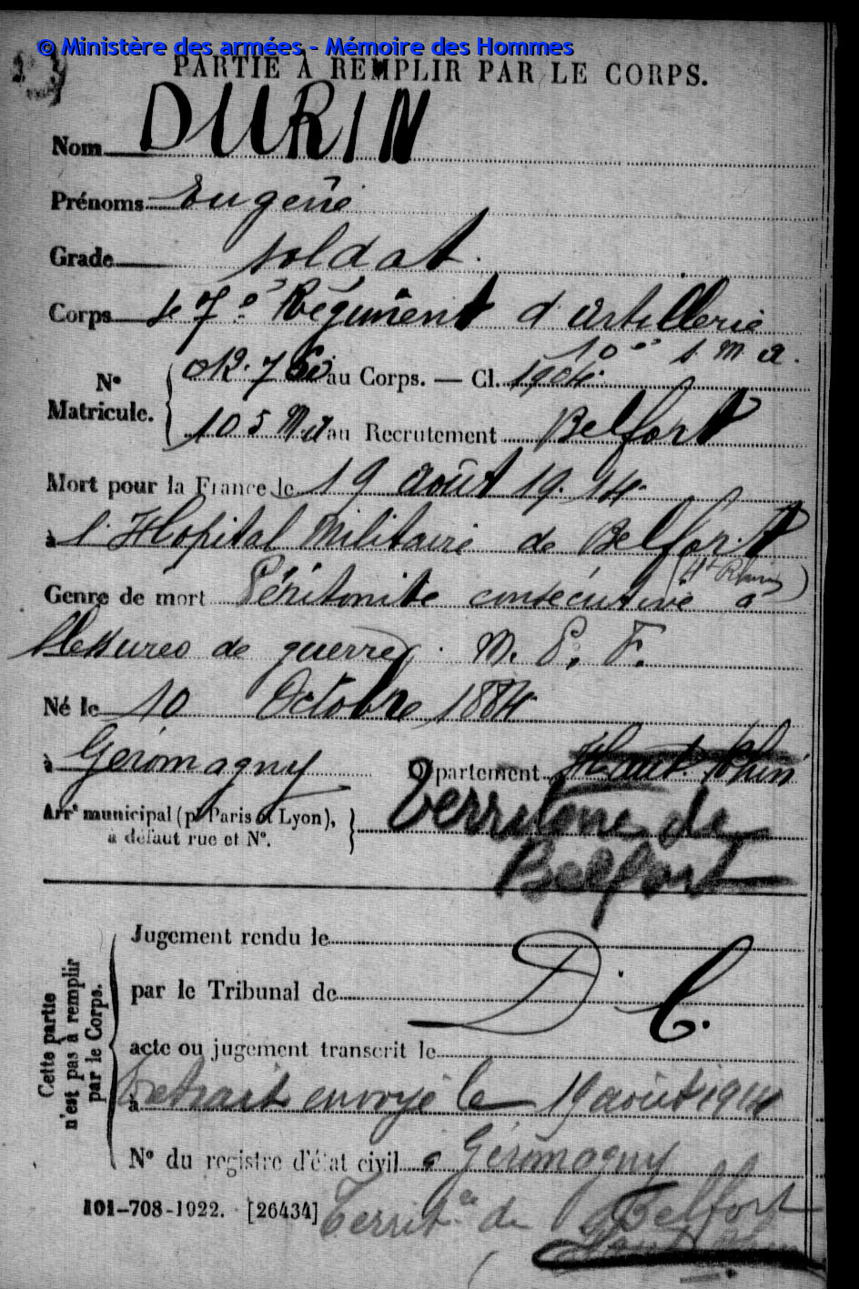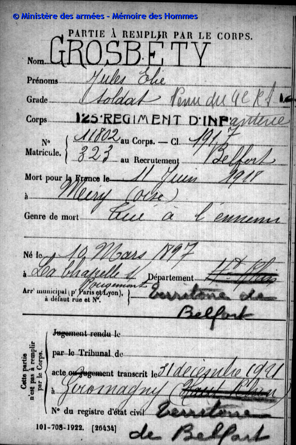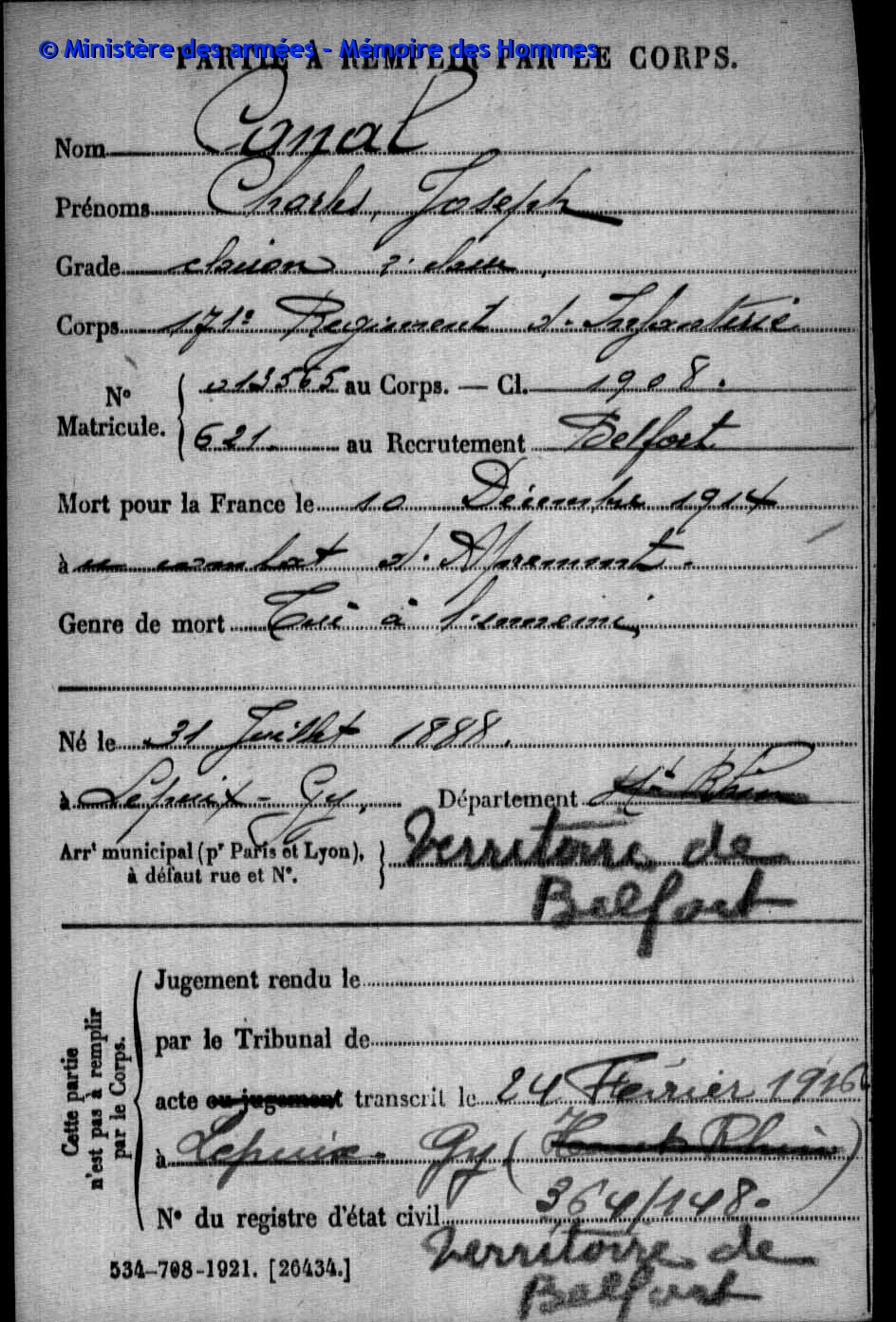 | Soldat EICH Hippolyte Joseph 06.07.1877 - 21.12.1914 49ème Régiment d'Infanterie Verstarb durch Krankheit im Hôpital temporaire in Belfort (F) |