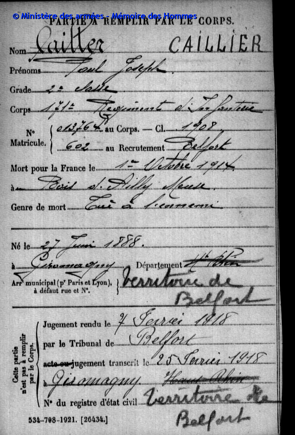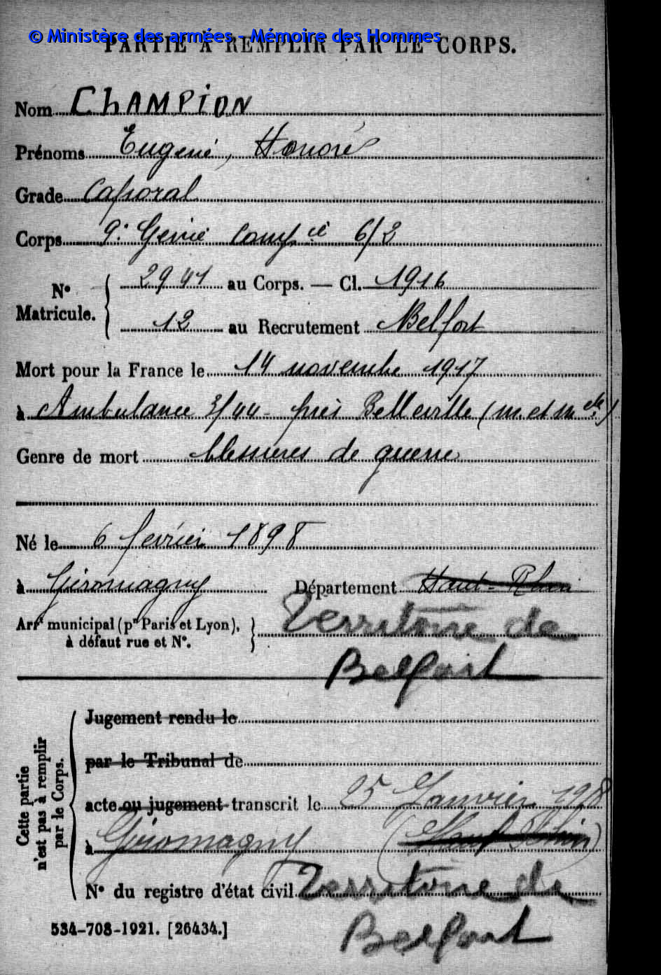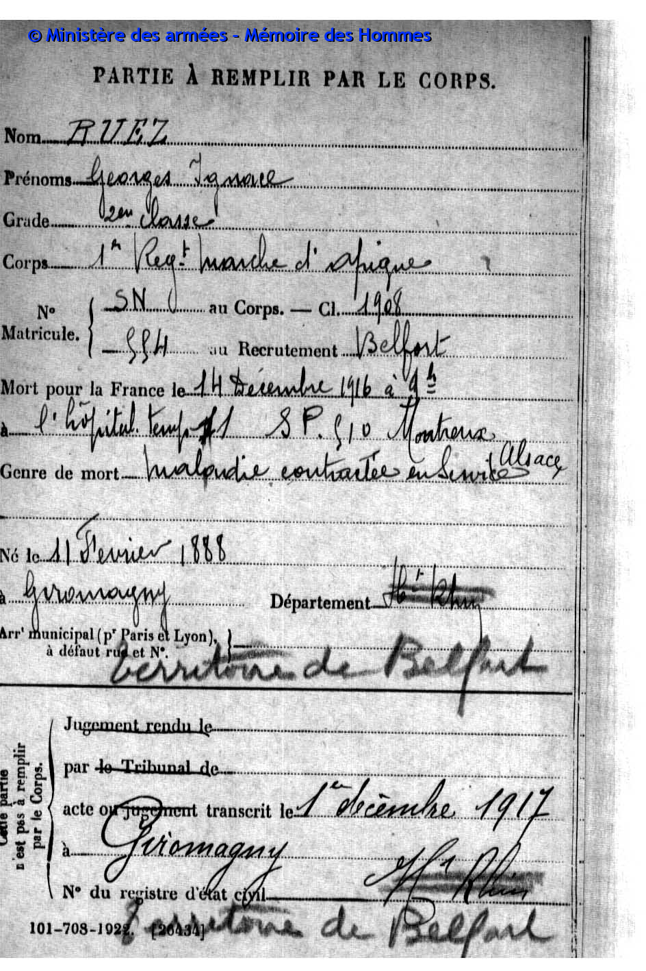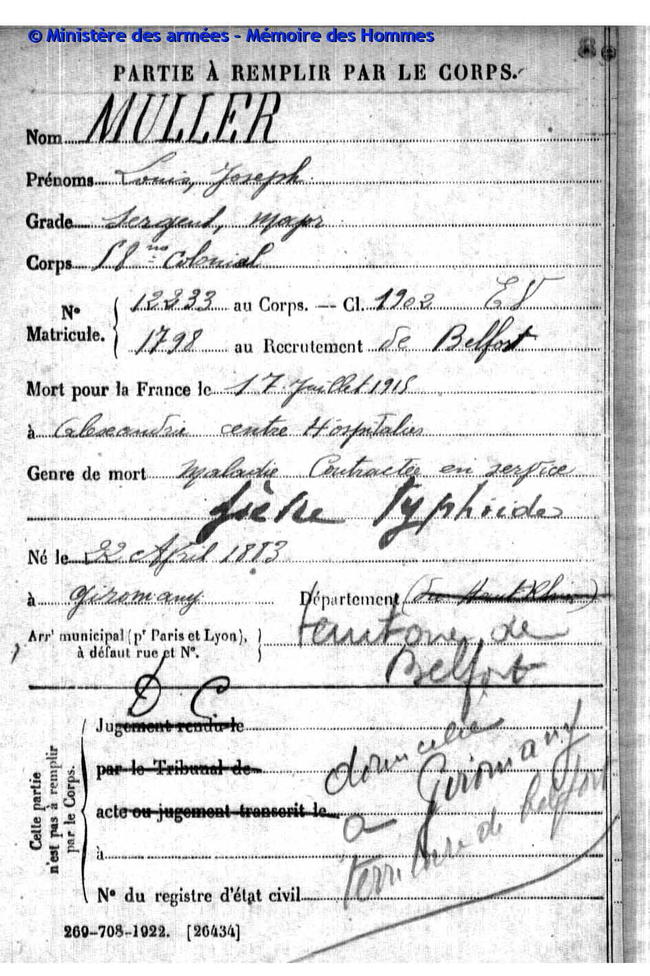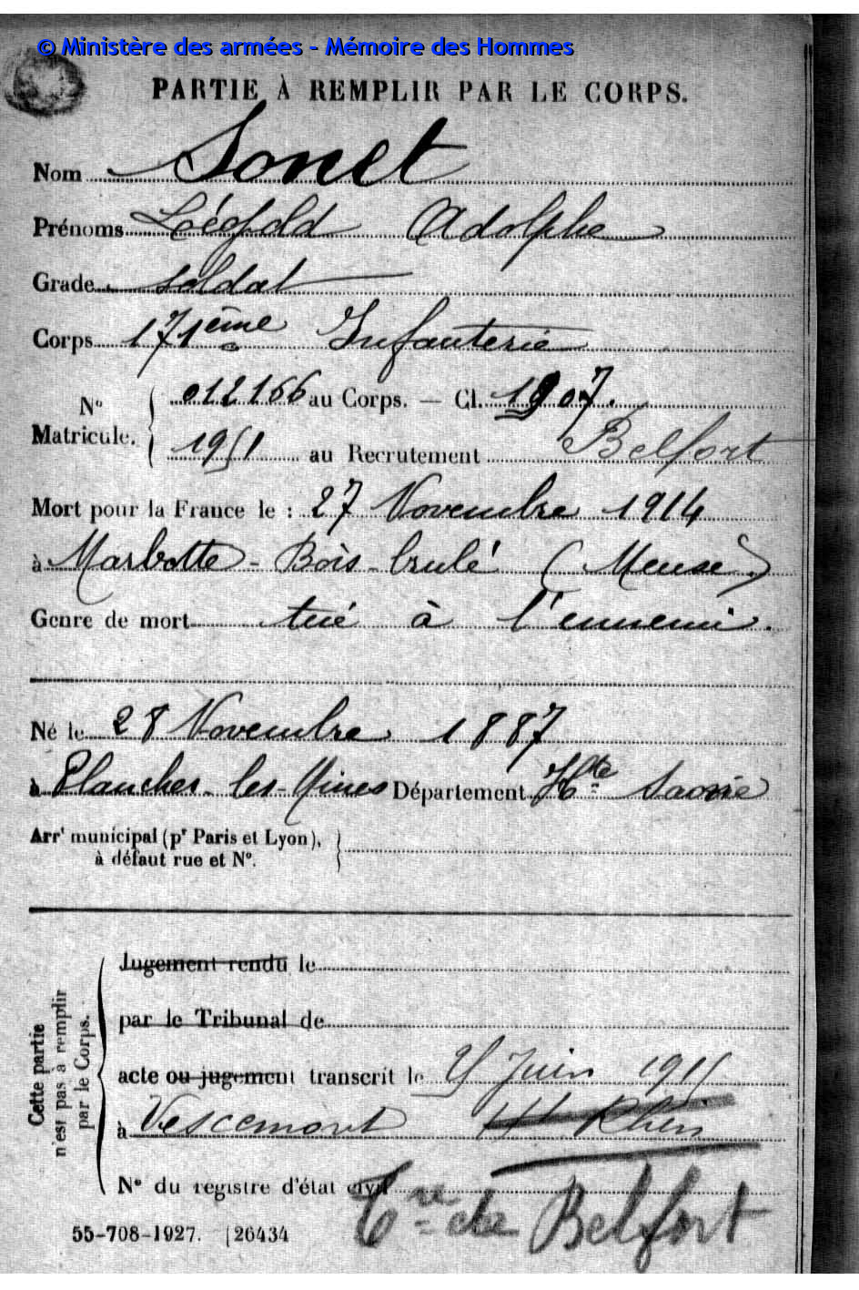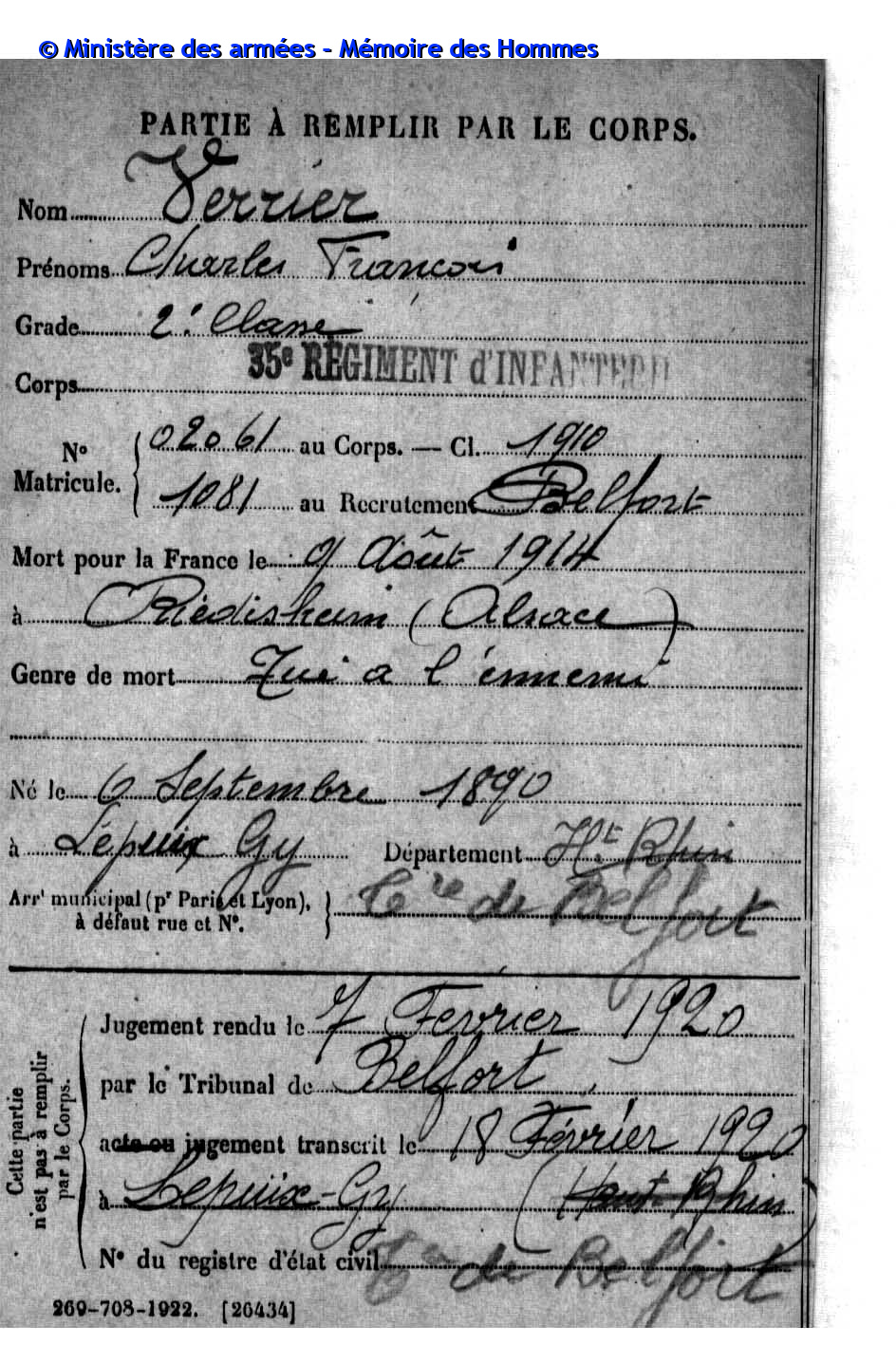 | Soldat EICH Hippolyte Joseph 06.07.1877 - 21.12.1914 49ème Régiment d'Infanterie Verstarb durch Krankheit im Hôpital temporaire in Belfort (F) |