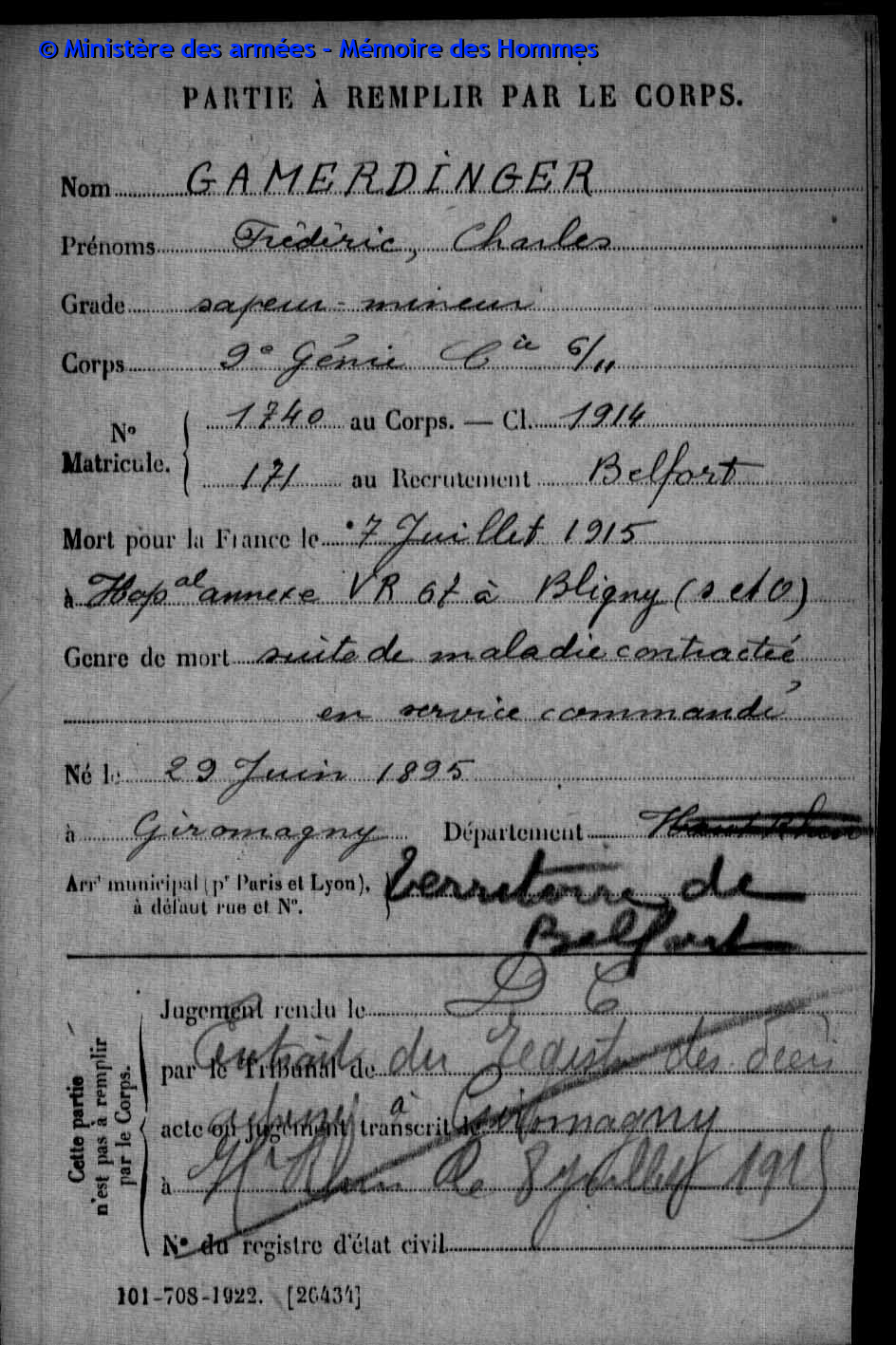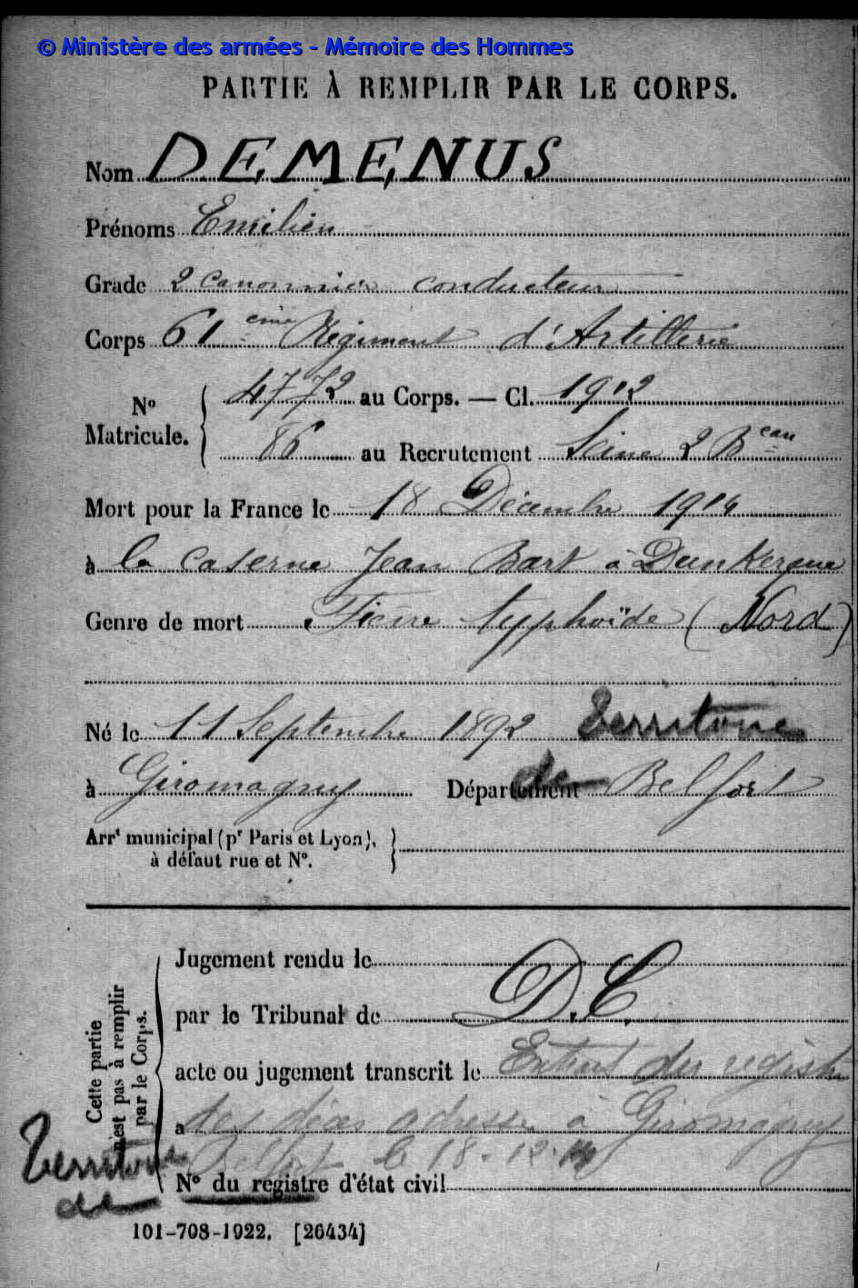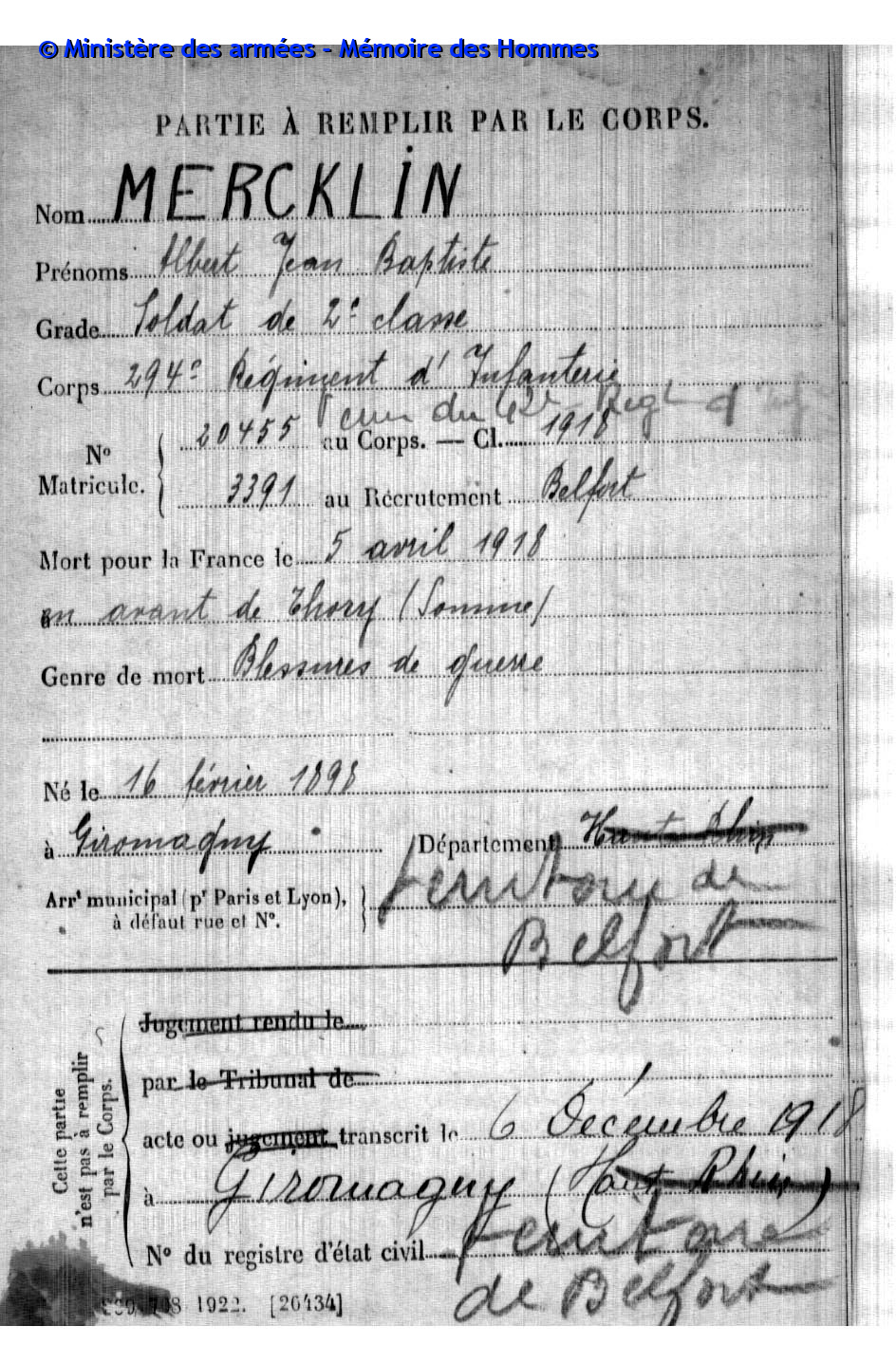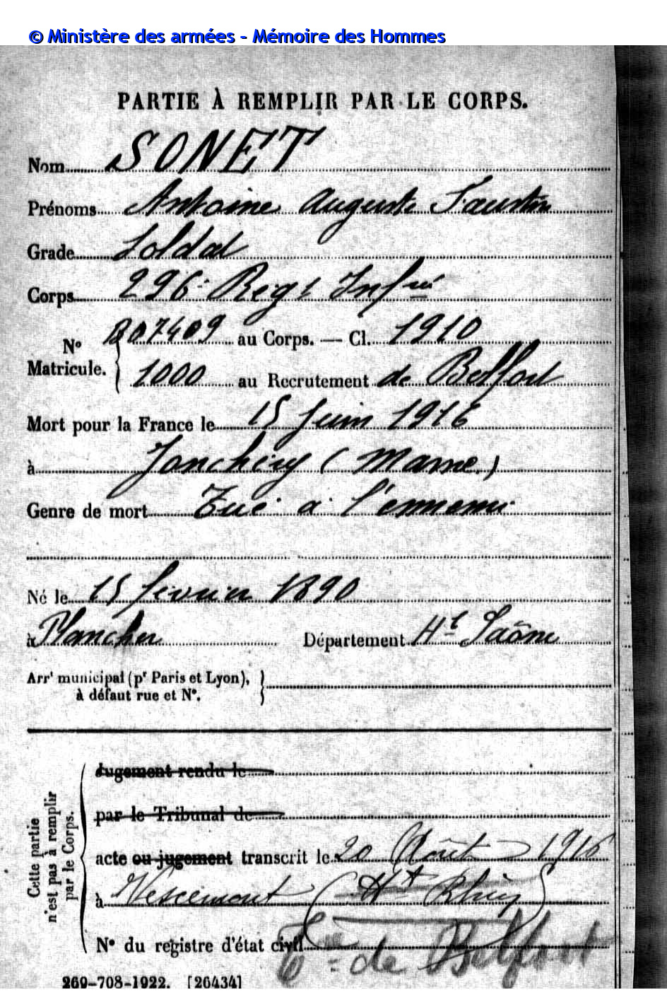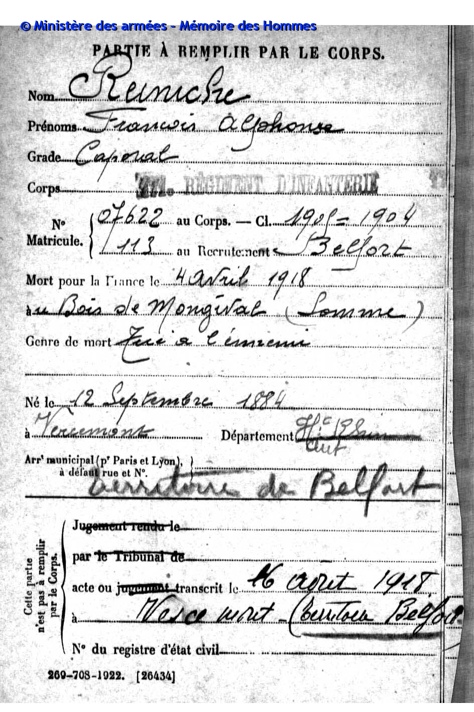 | Soldat EICH Hippolyte Joseph 06.07.1877 - 21.12.1914 49ème Régiment d'Infanterie Verstarb durch Krankheit im Hôpital temporaire in Belfort (F) |