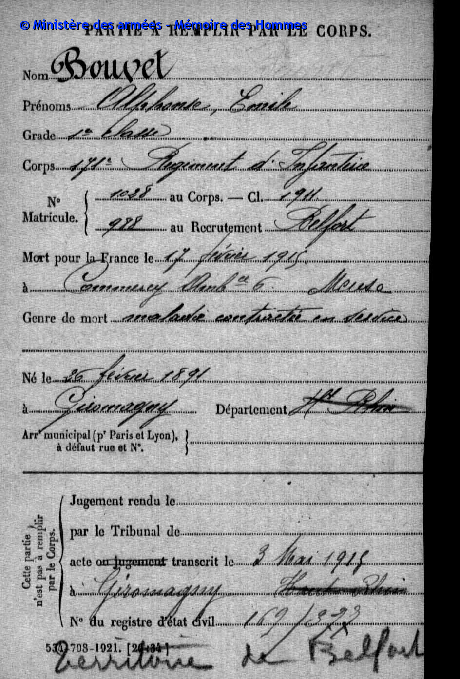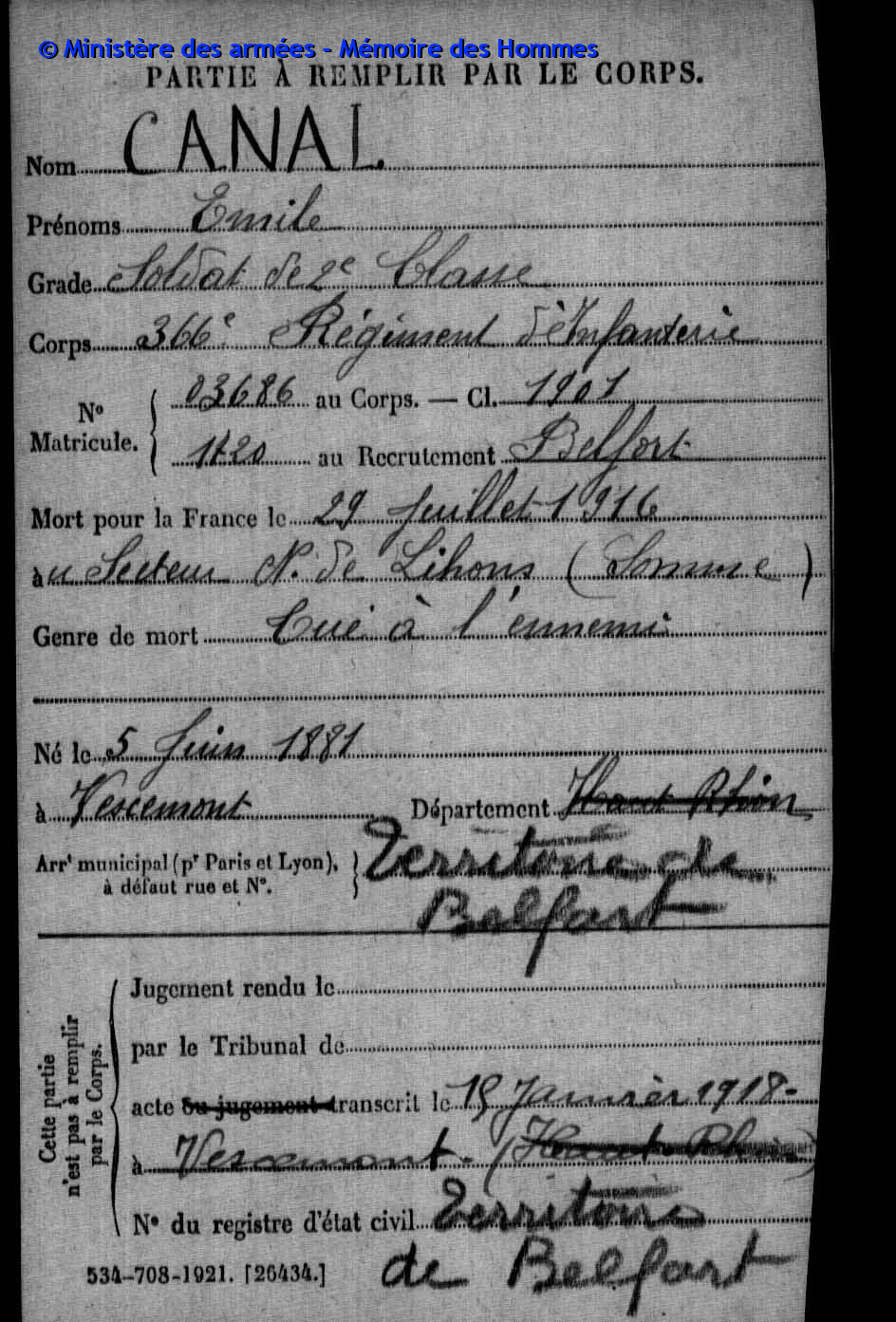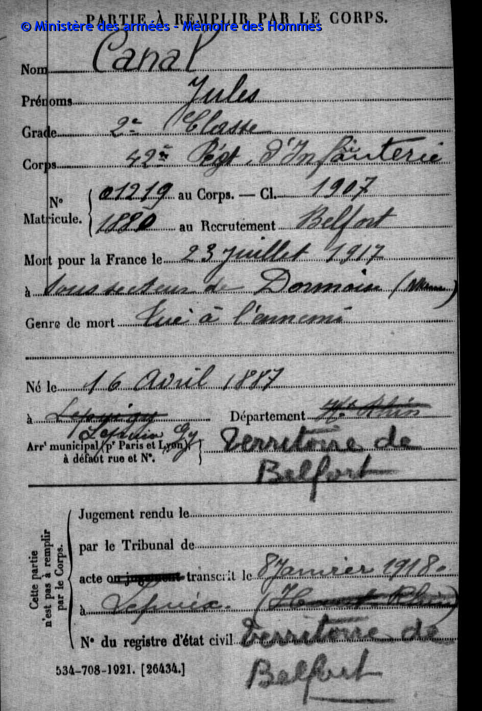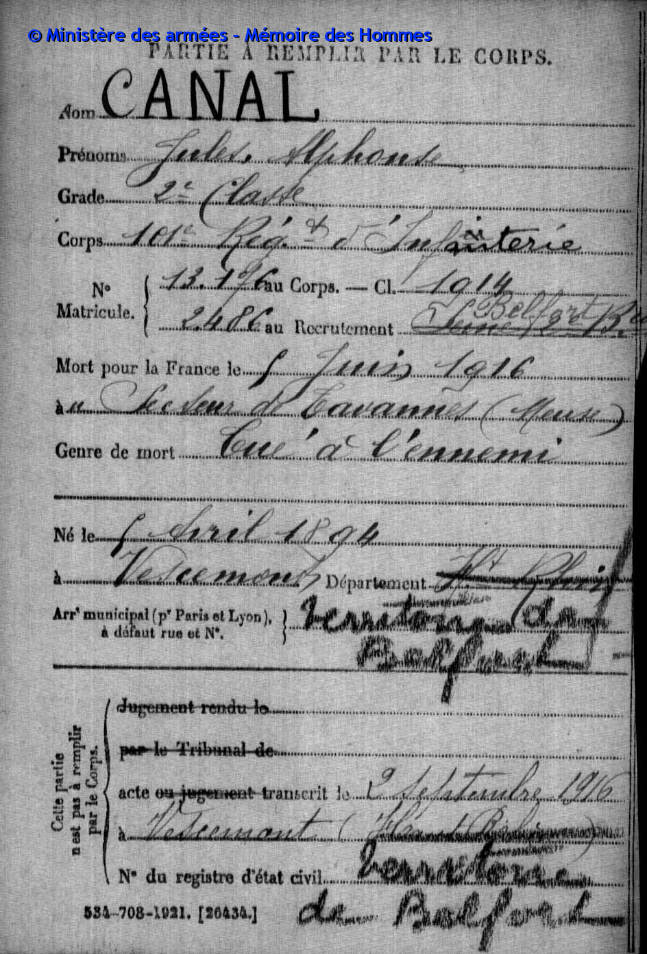 2ème classe CANAL Jules Alphonse 05.04.1894 - 05.06.1916 101ème Régiment d'Infanterie Gefallen in Damloup - Meuse (F) |