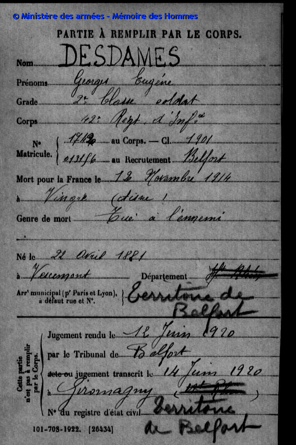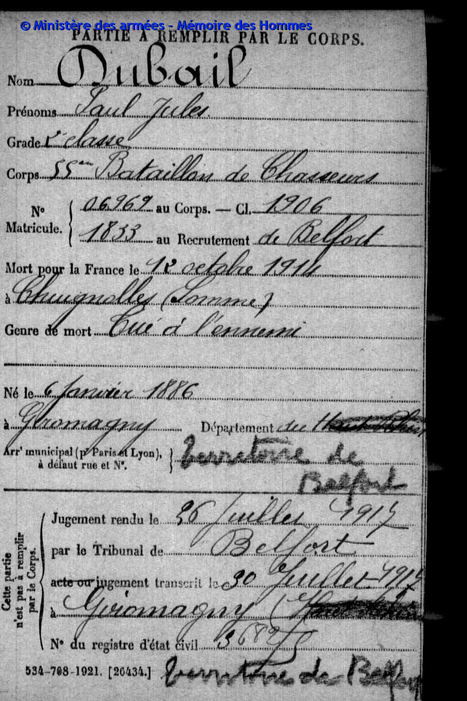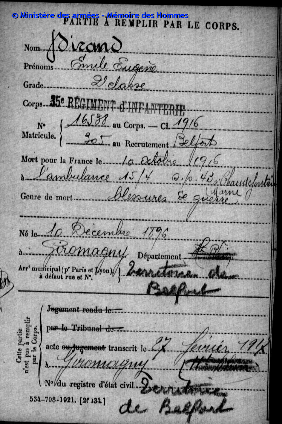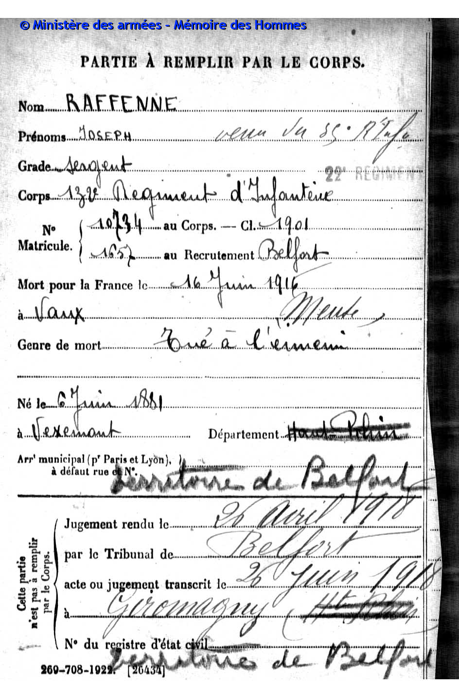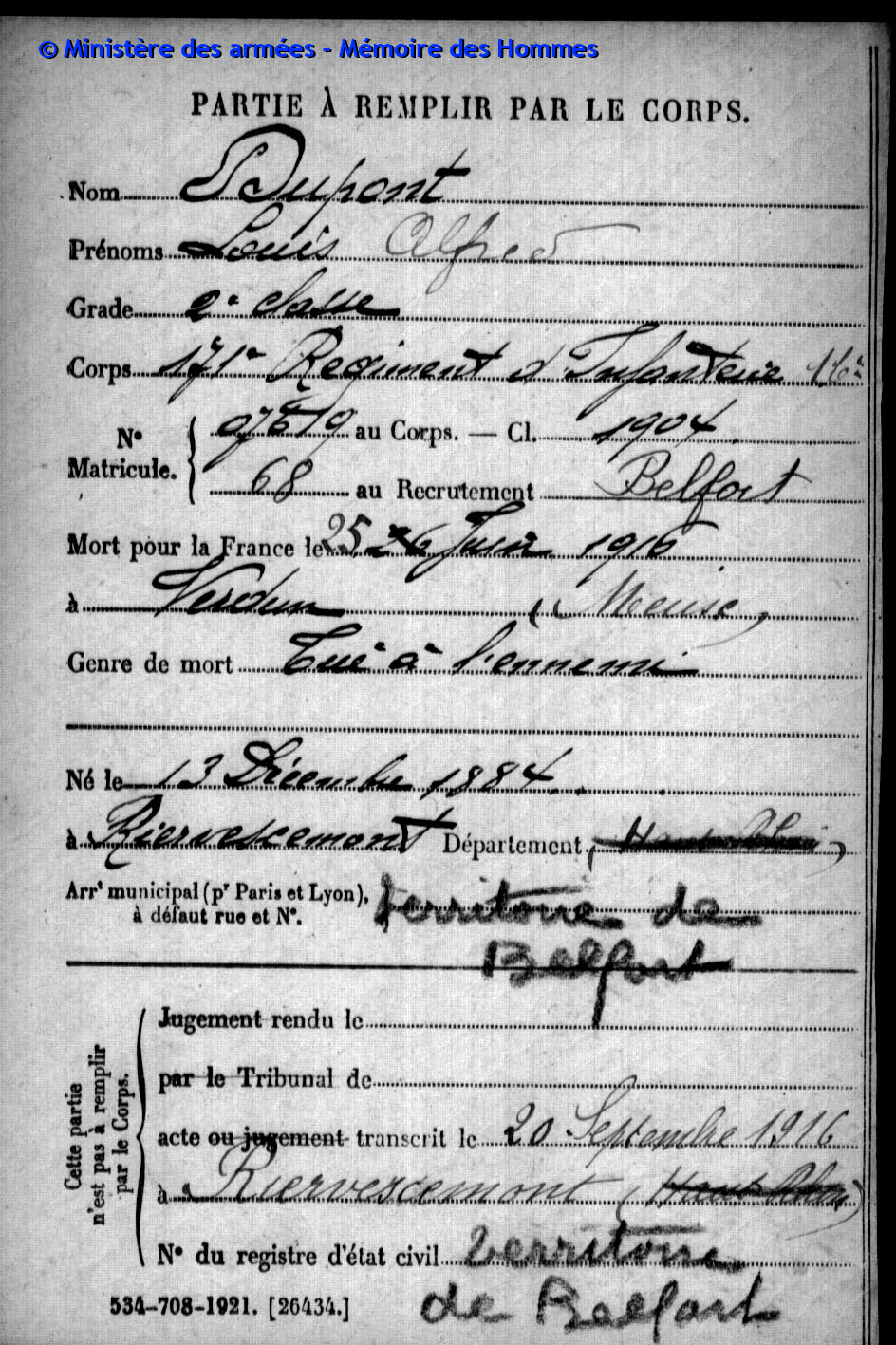 2ème classe CANAL Jules Alphonse 05.04.1894 - 05.06.1916 101ème Régiment d'Infanterie Gefallen in Damloup - Meuse (F) |
