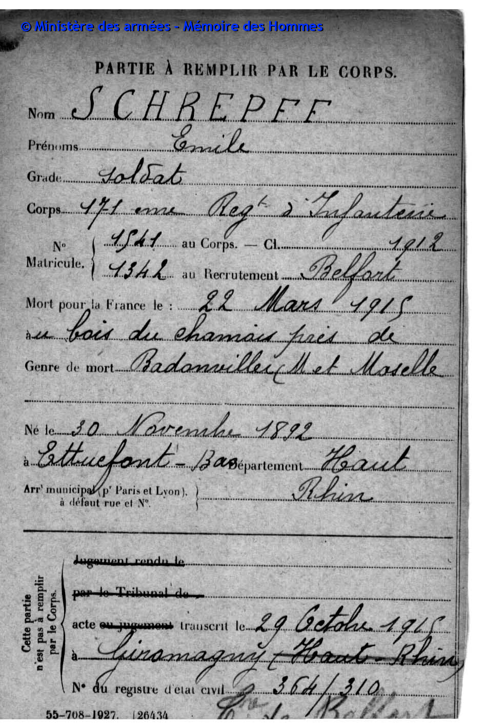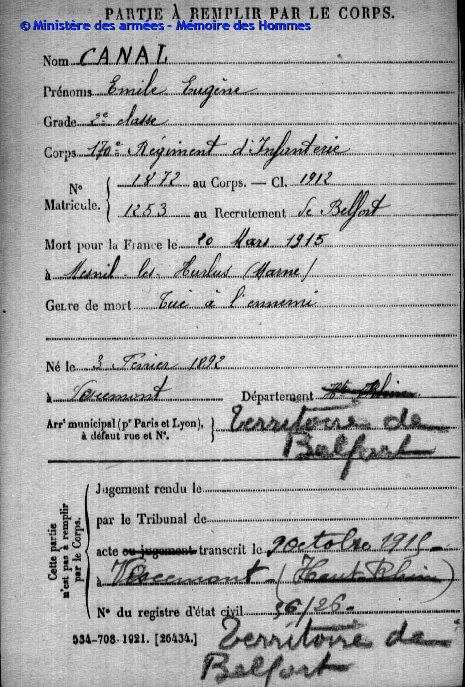 2ème classe CANAL Emile Eugène 03.02.1892 - 20.03.1915 170ème Régiment d'Infanterie Gefallen in Le Mesnil-les-Hurlus (F) |