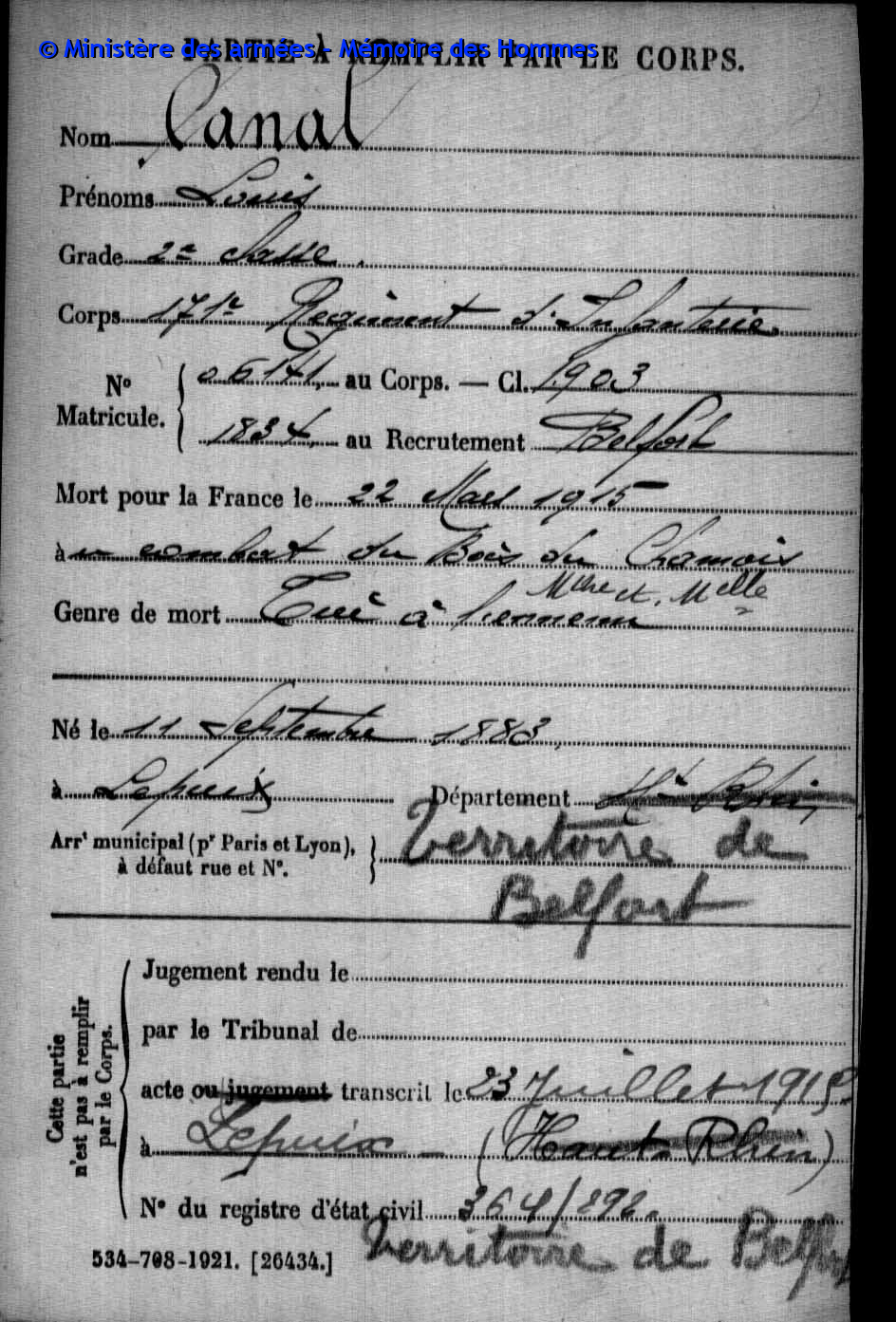2ème classe CANAL Henri Henrius 11.02.1892 - 06.05.1915 170ème Régiment d'Infanterie Gefallen in Les Eparges - Meuse (F) |