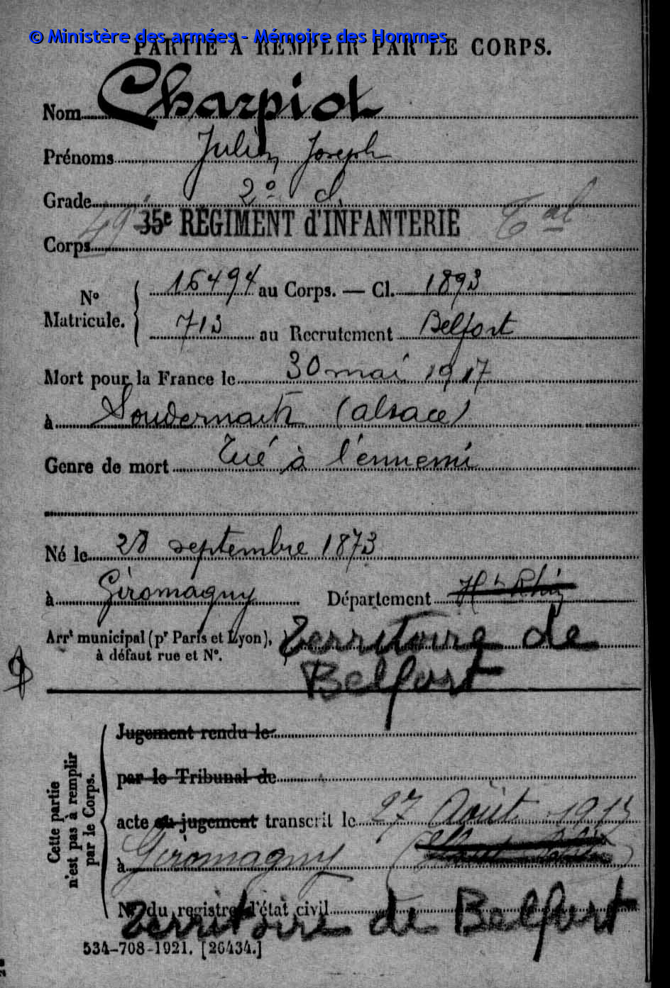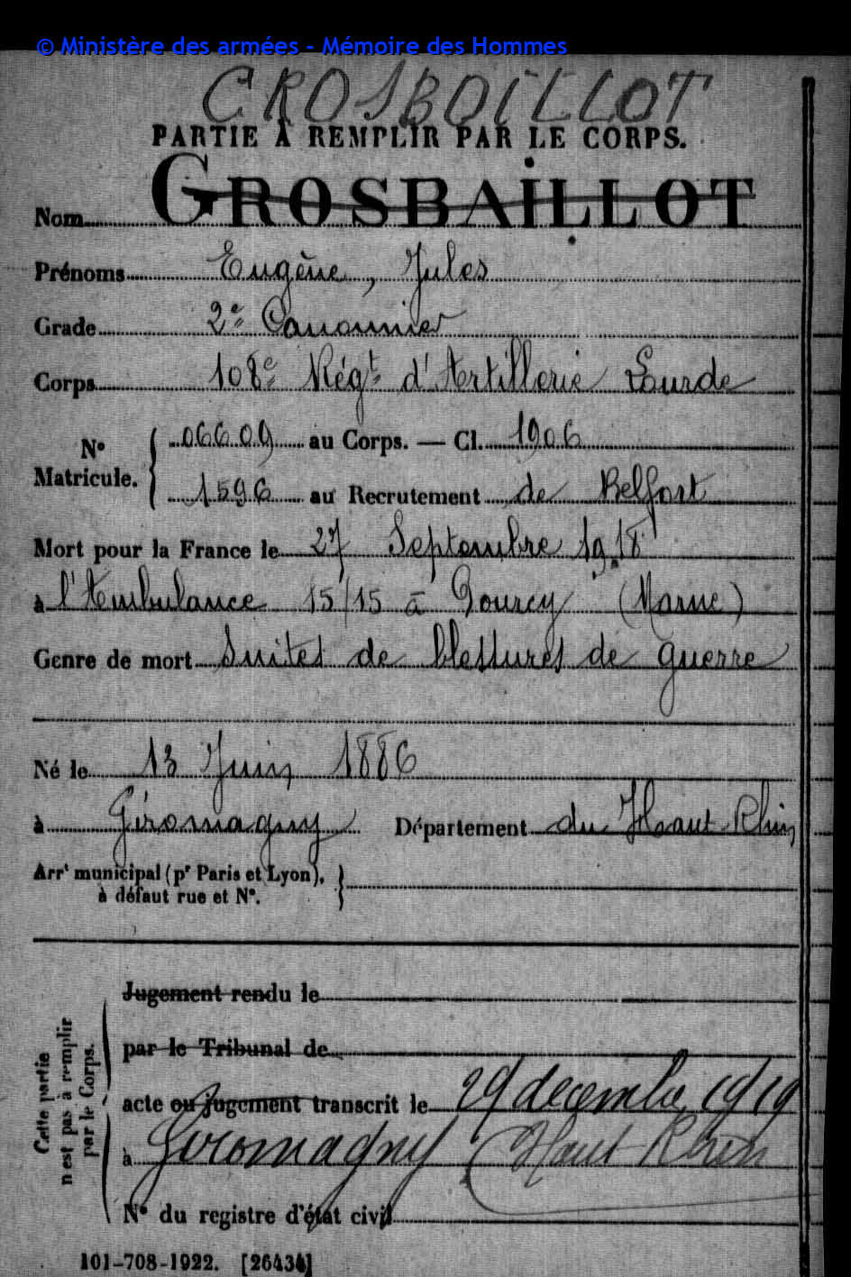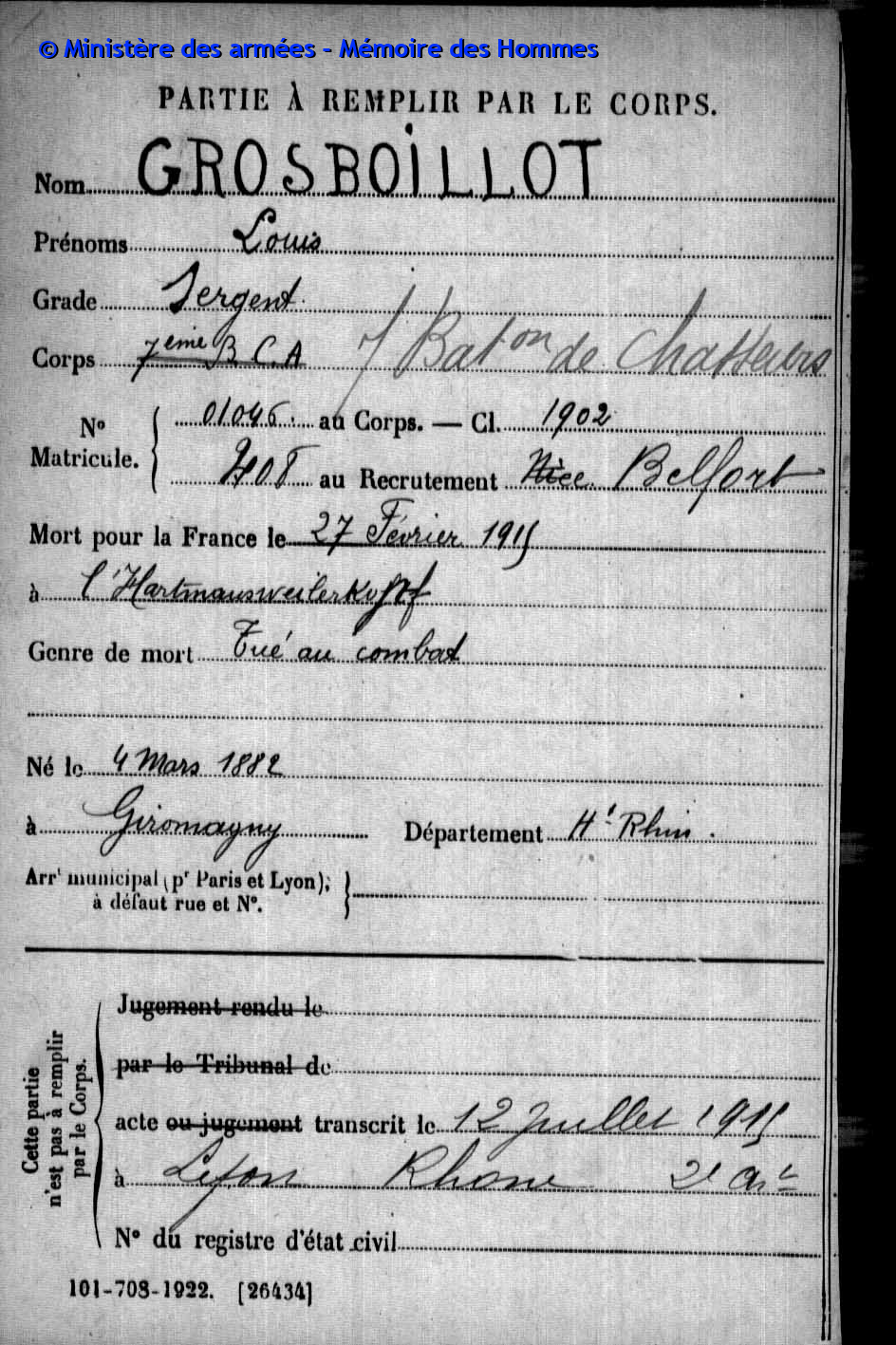 | Sergent GROSBOILLOT Louis 04.03.1882 - 27.02.1915 7ème Bataillon de Chasseurs Alpins 6ème Compagnie Gefallen am Hartmannsweilerkopf im Elsass (F) |