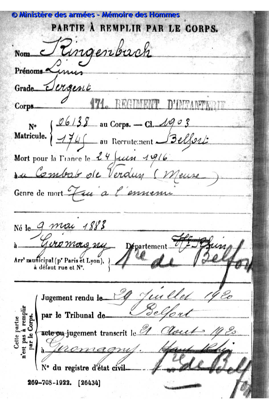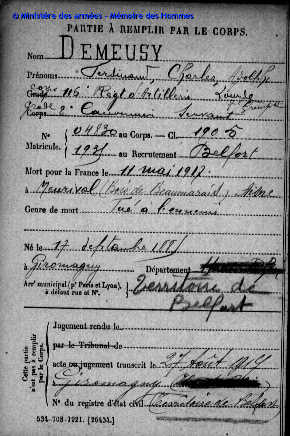 2ème classe BACHMANN Alfred Eugène 03.01.1885 - 28.02.1916 171ème Régiment d'Infanterie Gefallen in Perthes-les-Hurlus - Marne (F) |