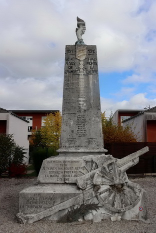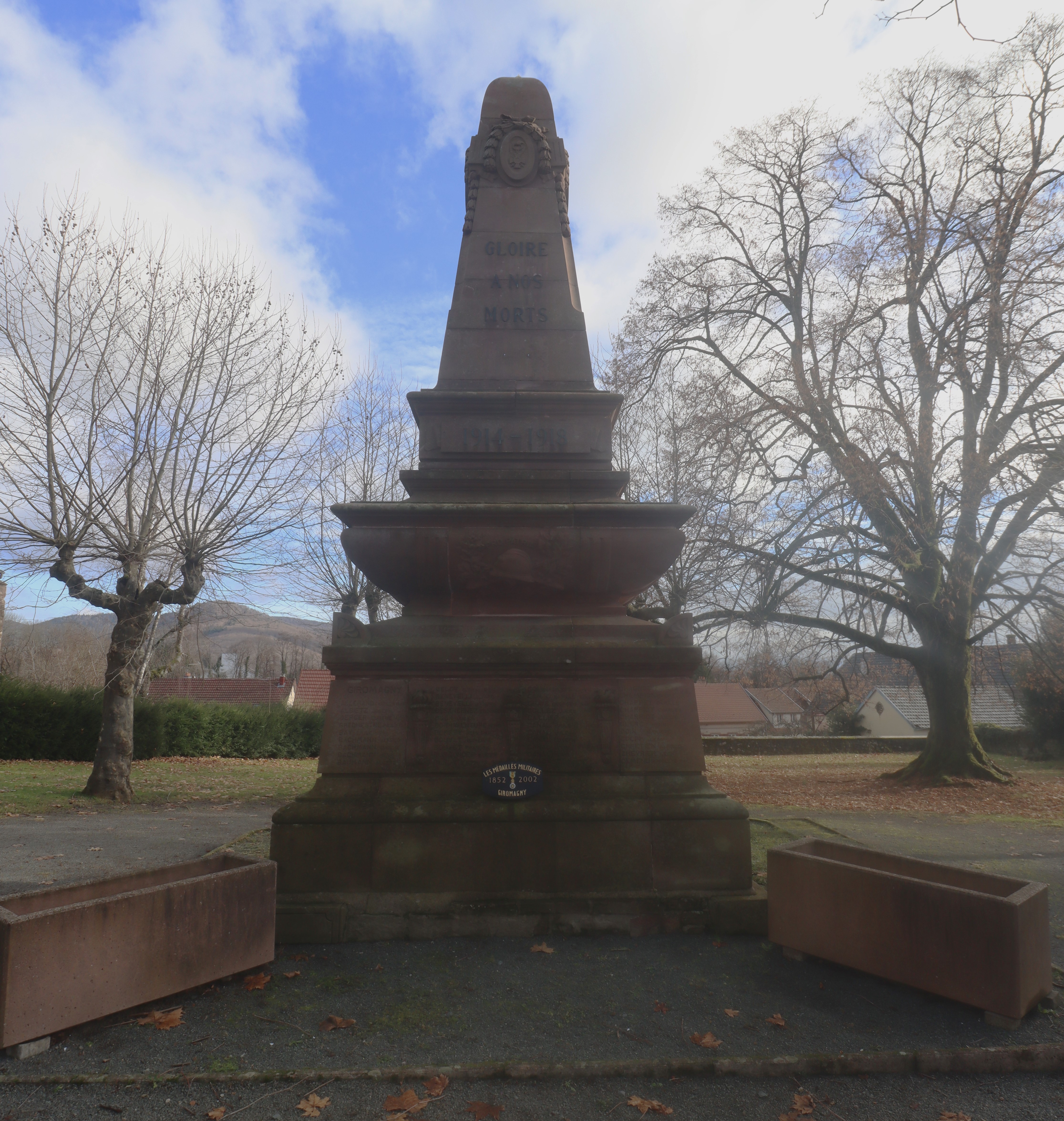 Auf dem "Le Square du Souvenir" bei der Kirche der 5,65 Km2 grossen Gemeinde mit 2914 Einwohner im Departement Territoire de Belfort (F) stehen gleich 3 Kriegerdenkmäler.